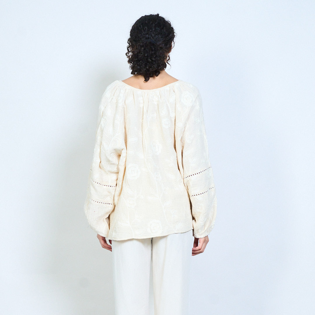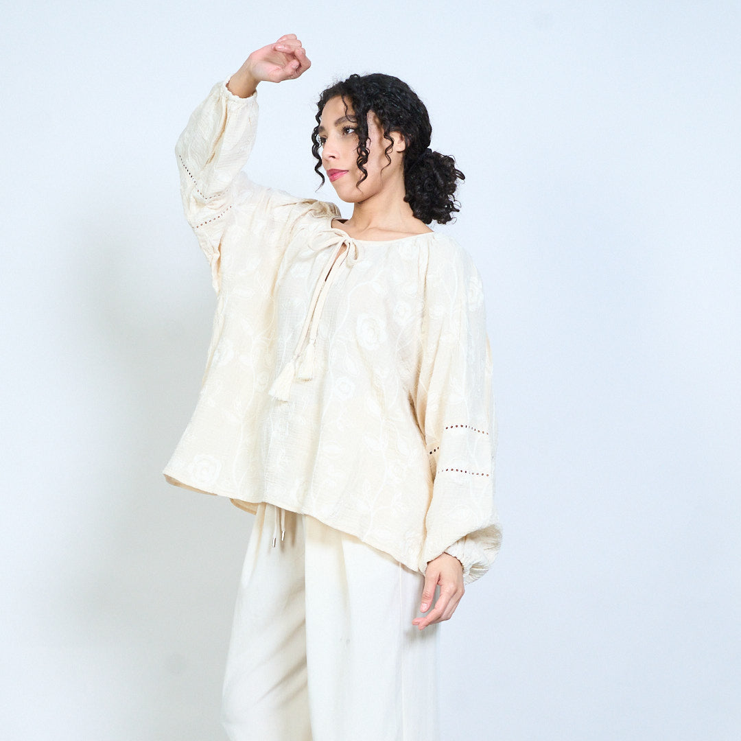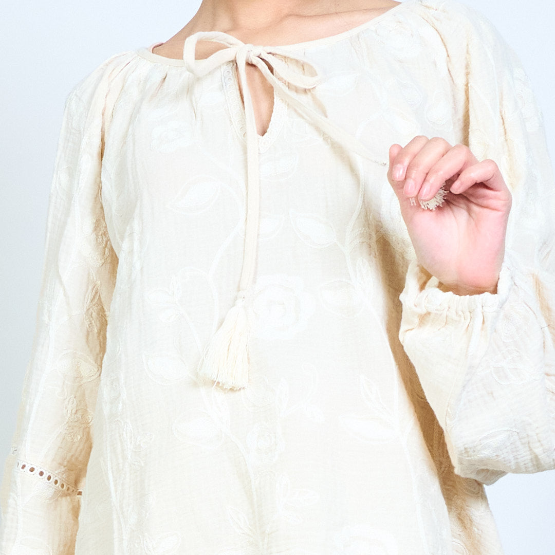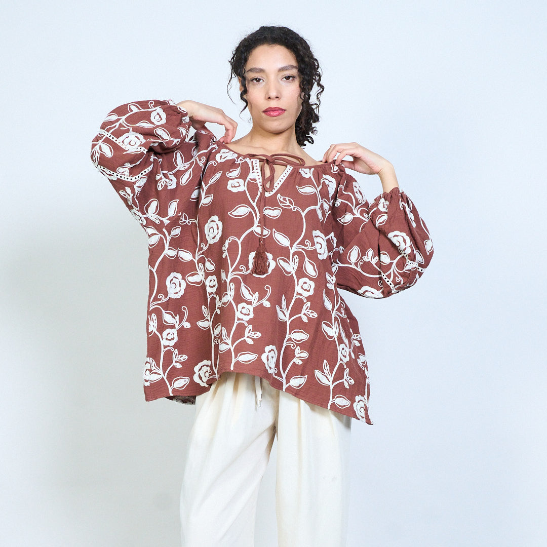 Floral vine print tassel tie neckline boho long sleeve blouse wholesale