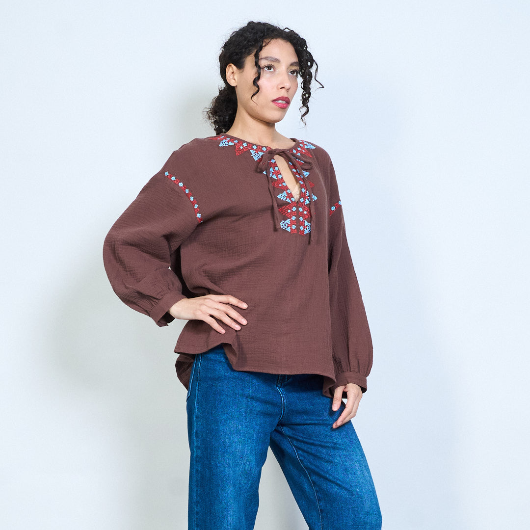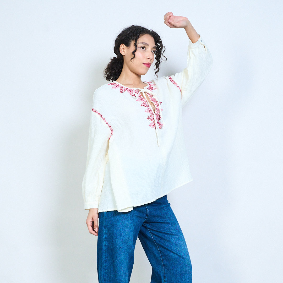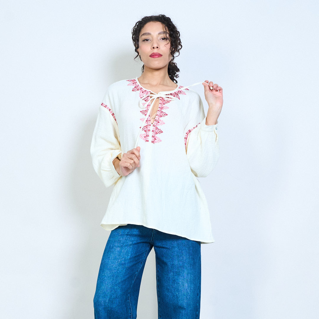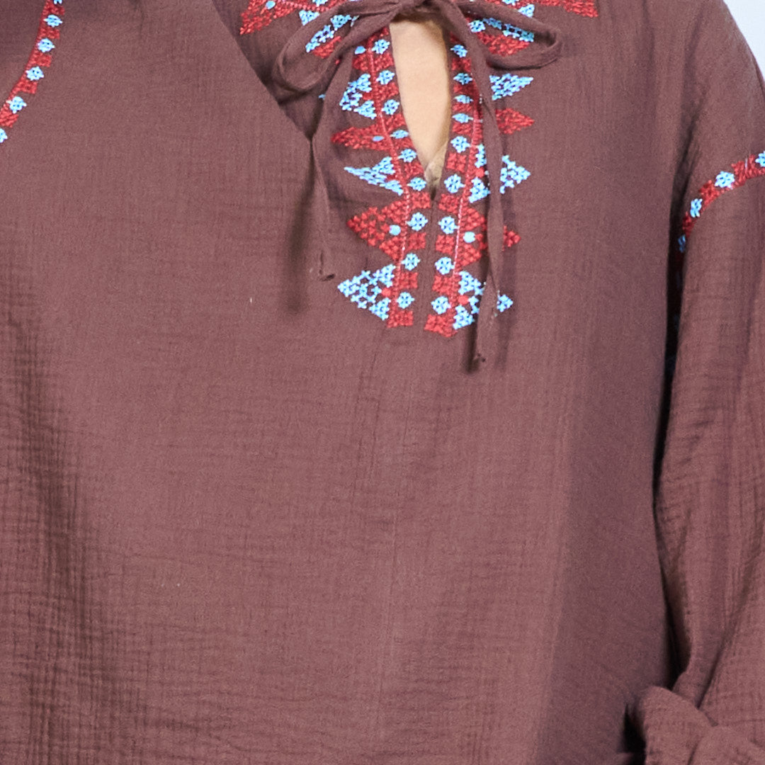 Geometric embroidery tie neckline long sleeve blouse wholesale