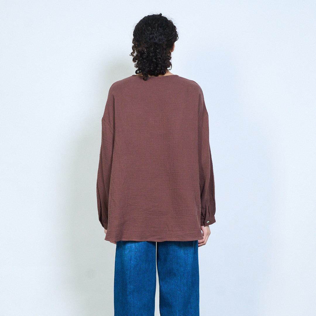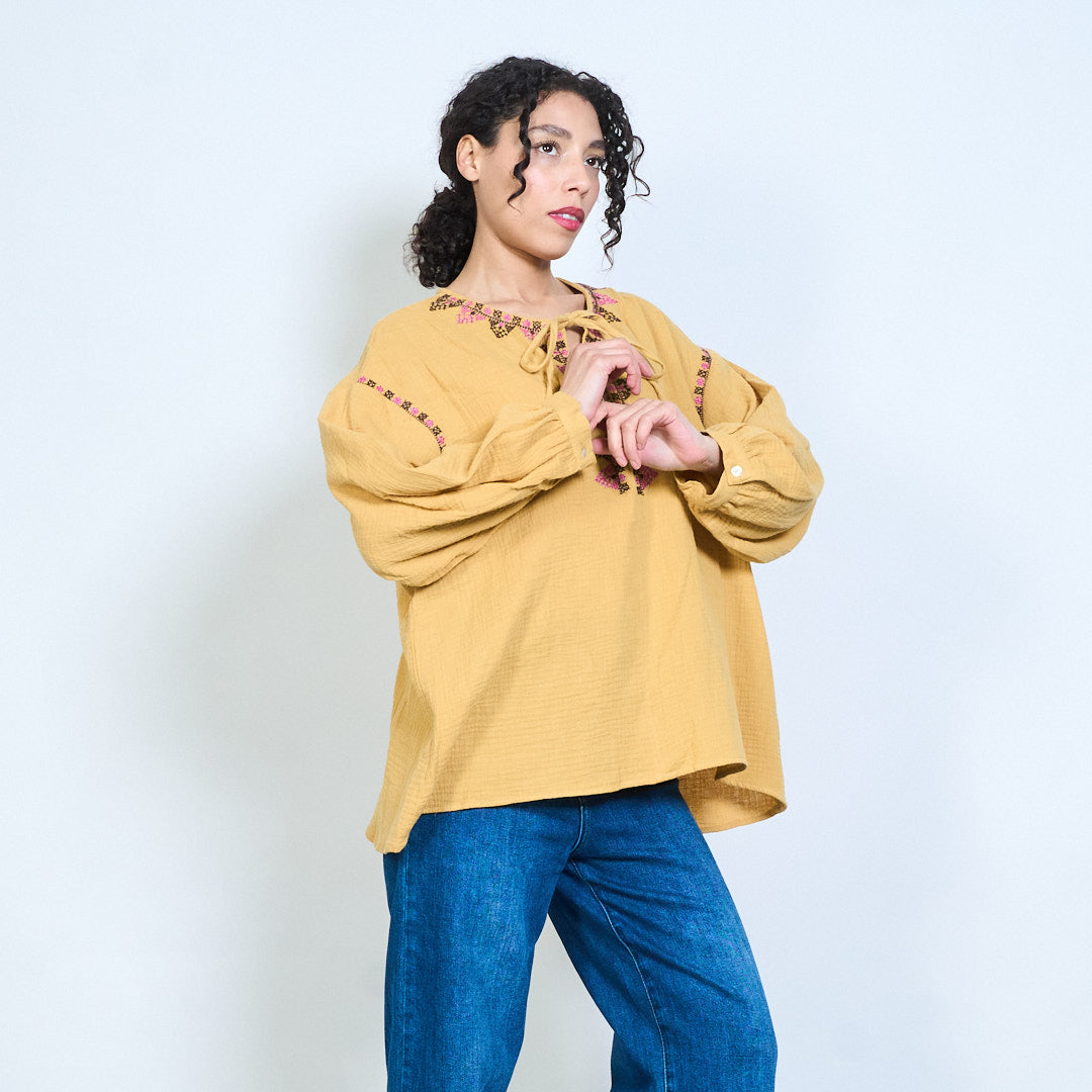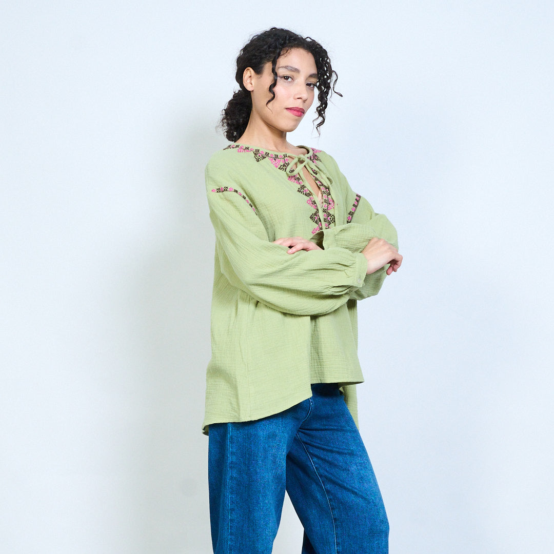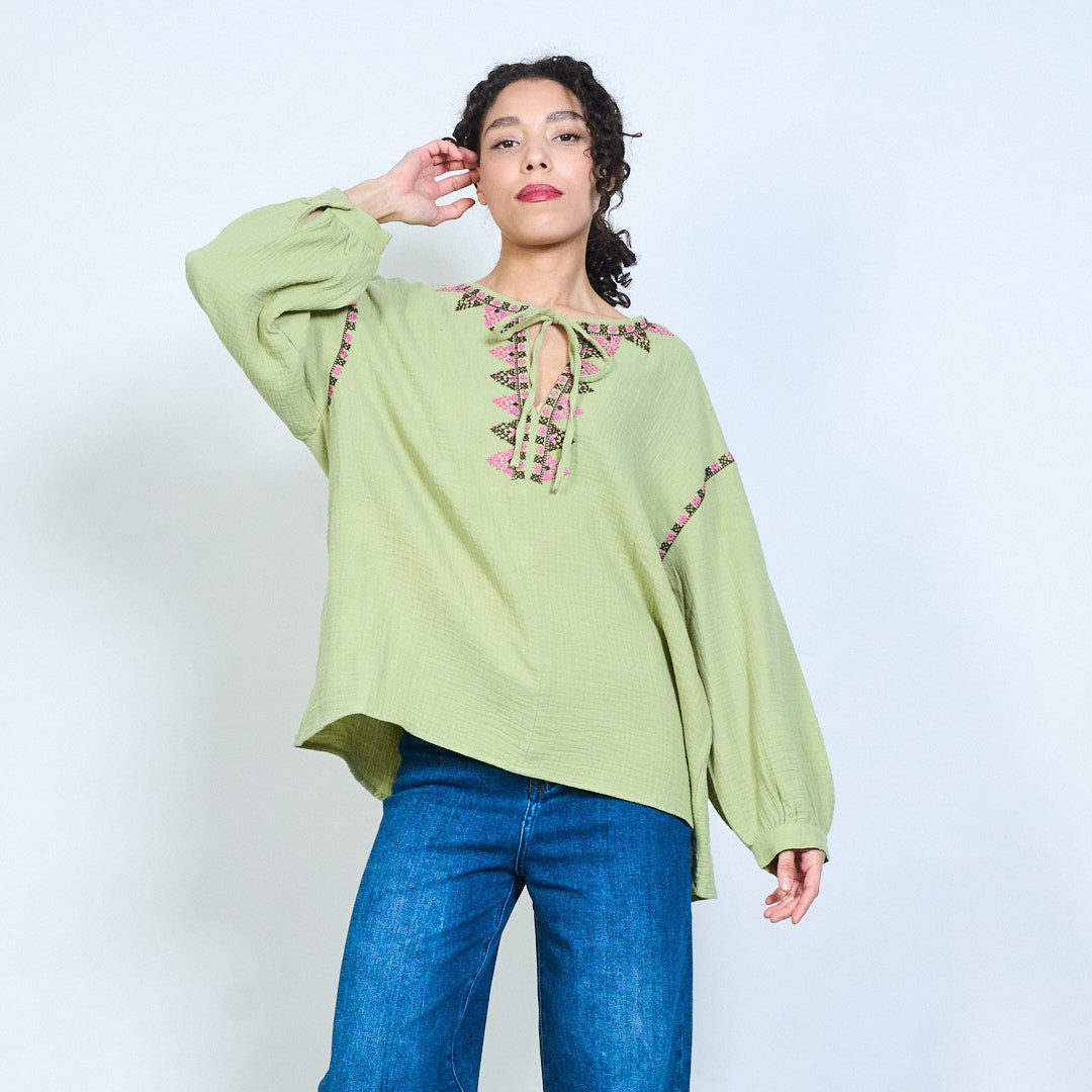 Geometric embroidery tie neckline long sleeve blouse wholesale