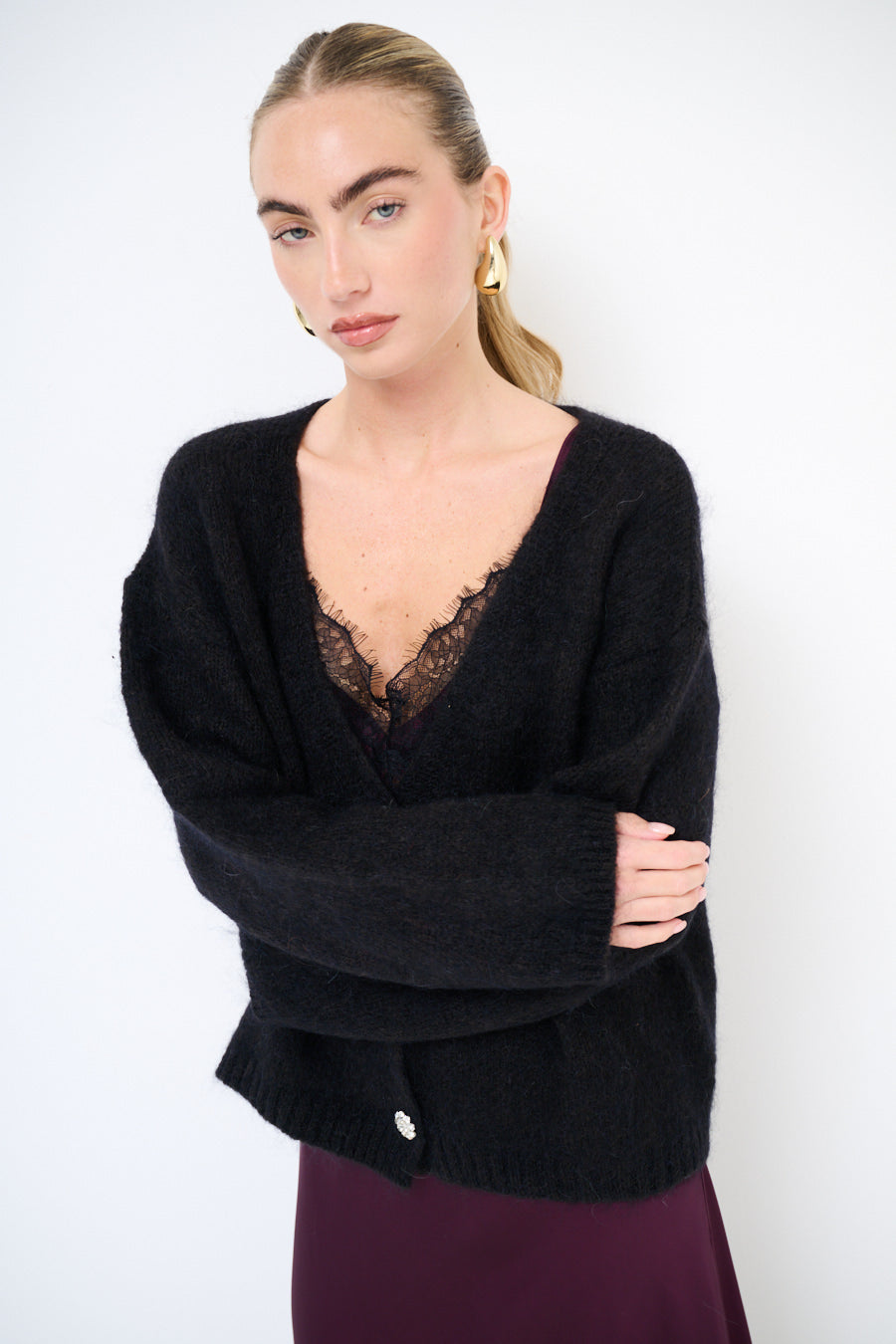 Jewel button fuzzy v-neck soft knit cardigan wholesale