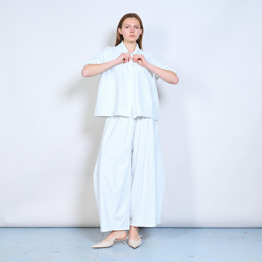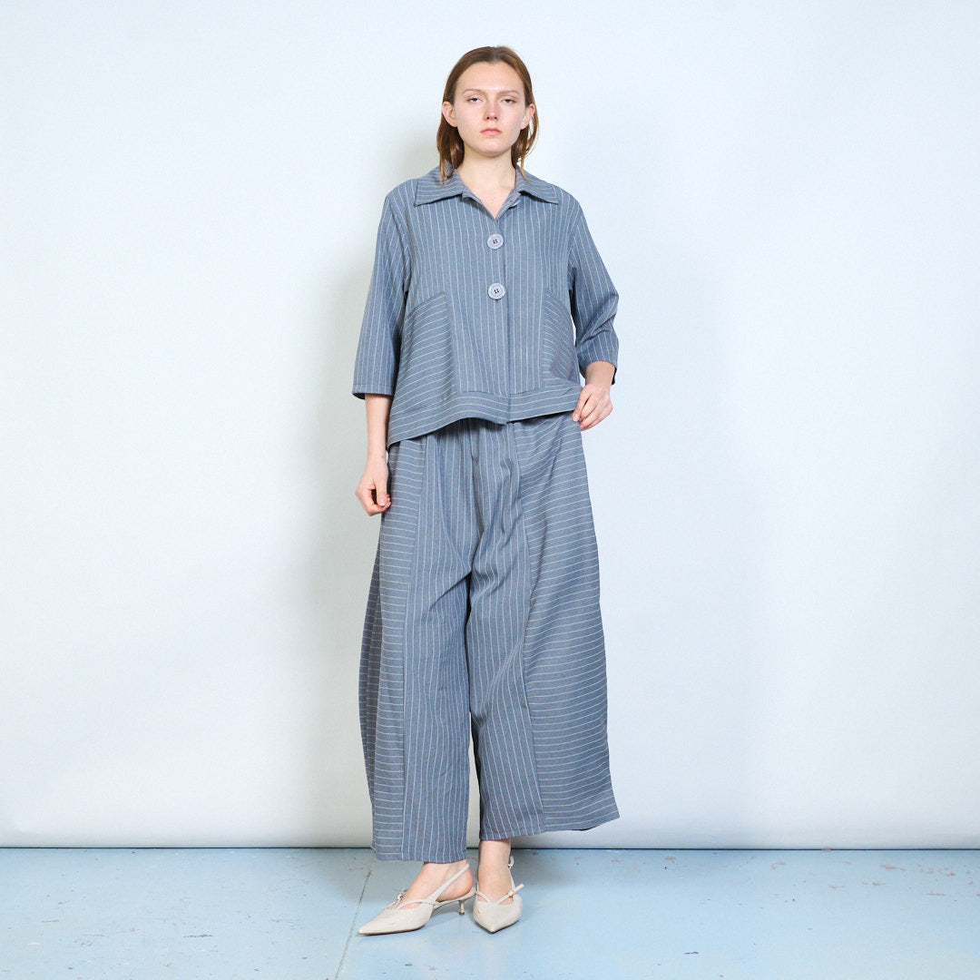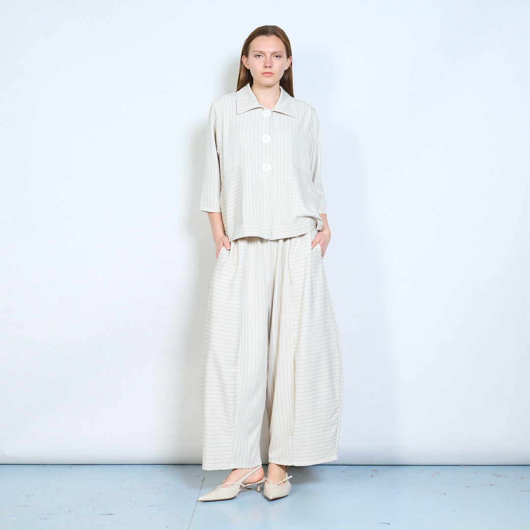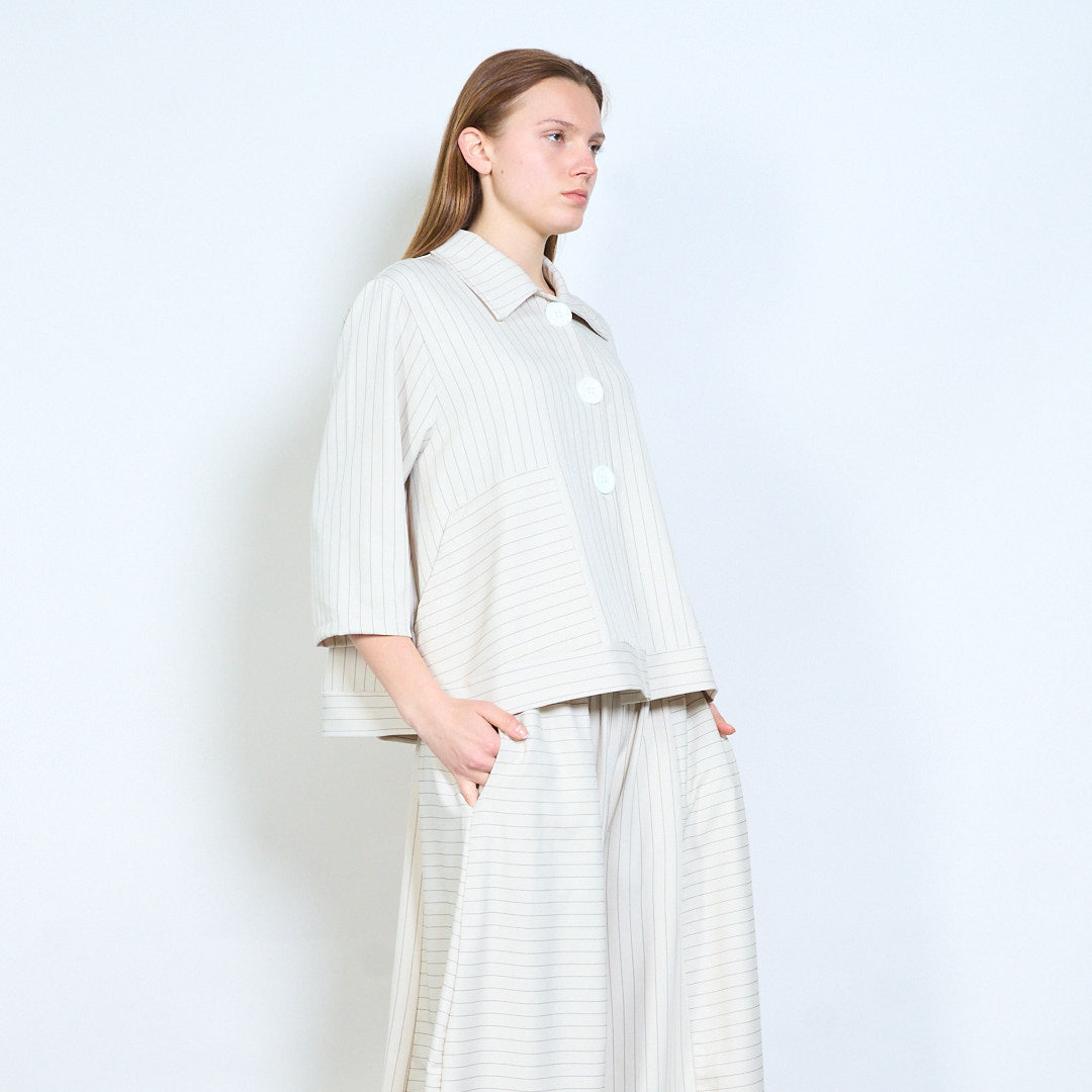 - Soft structured fabric with fine vertical pinstripe pattern