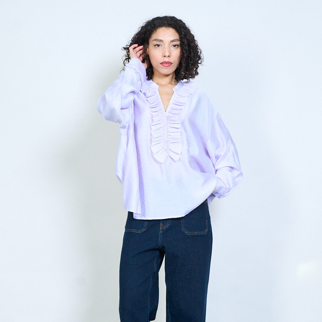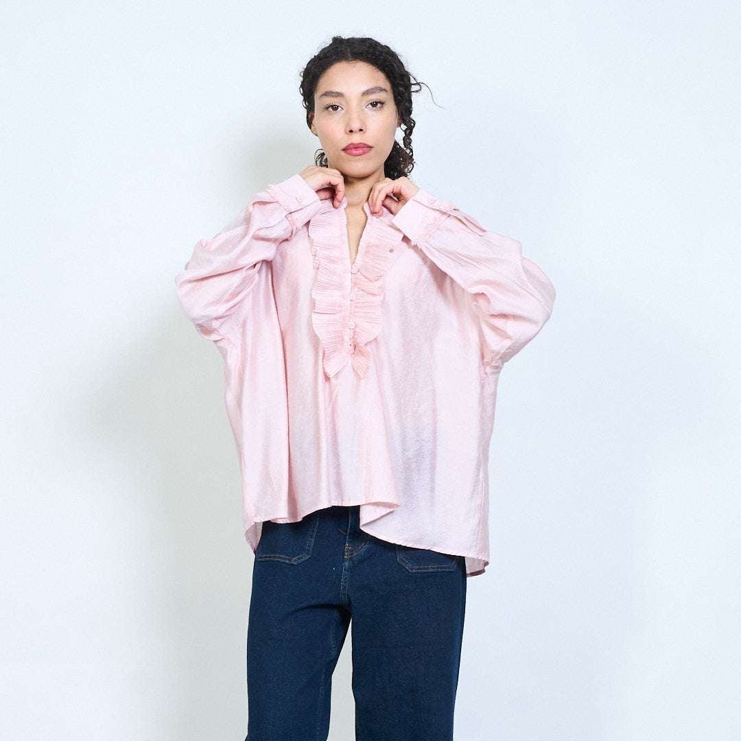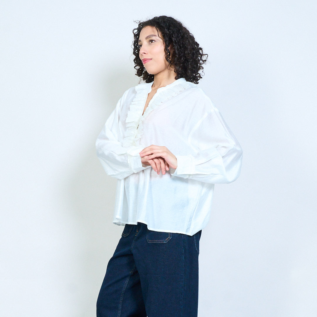 Pleated ruffle trim v-neck loose fit long sleeve blouse wholesale