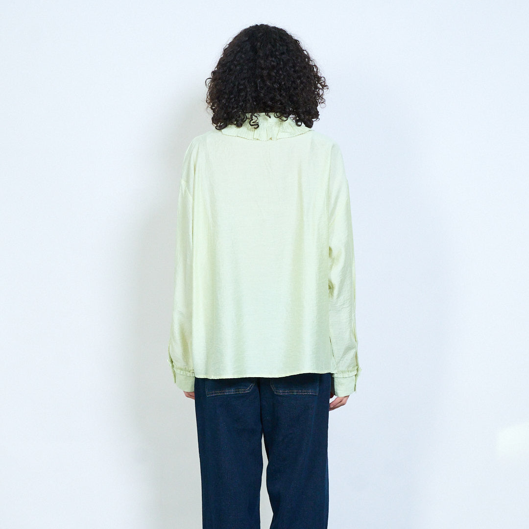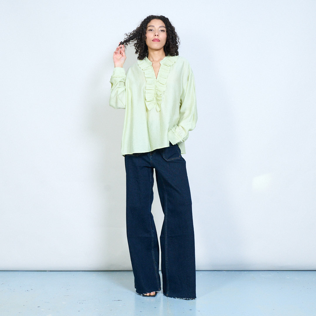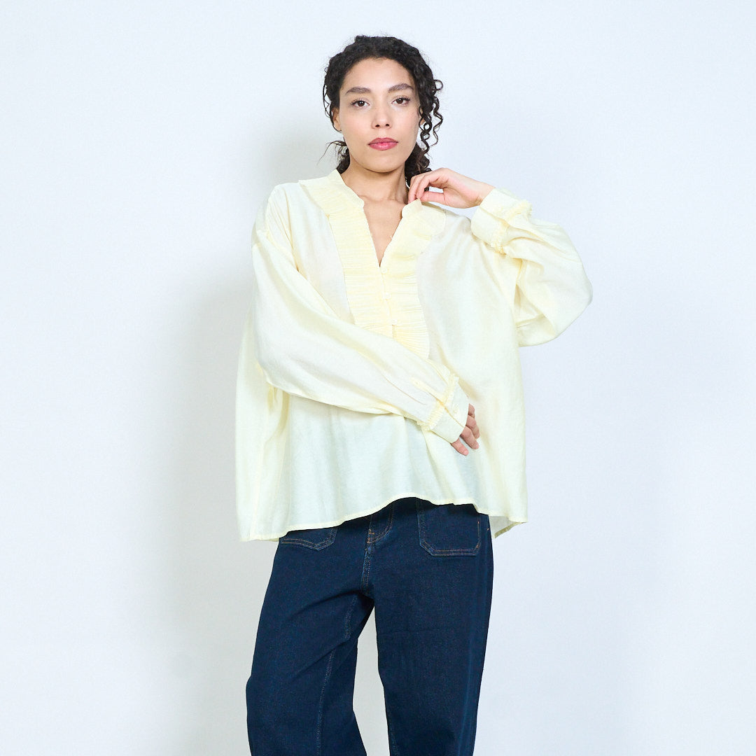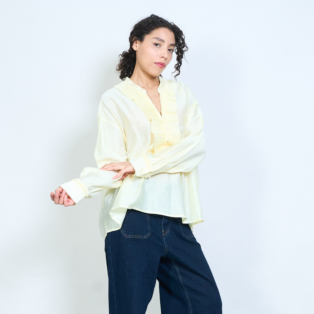 Pleated ruffle trim v-neck loose fit long sleeve blouse wholesale