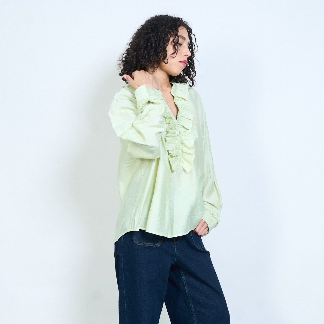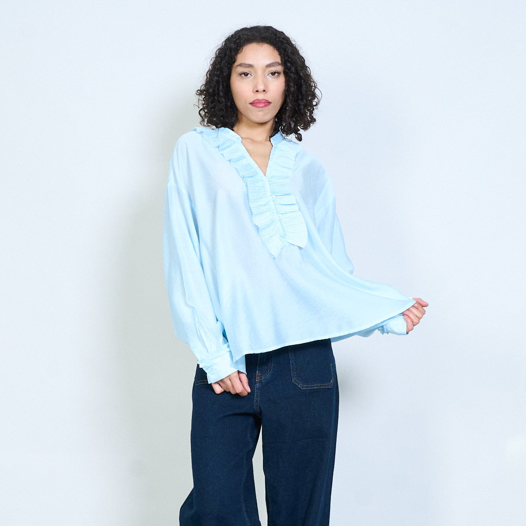 - Elegant blouse featuring pleated ruffle trim along the v-neckline