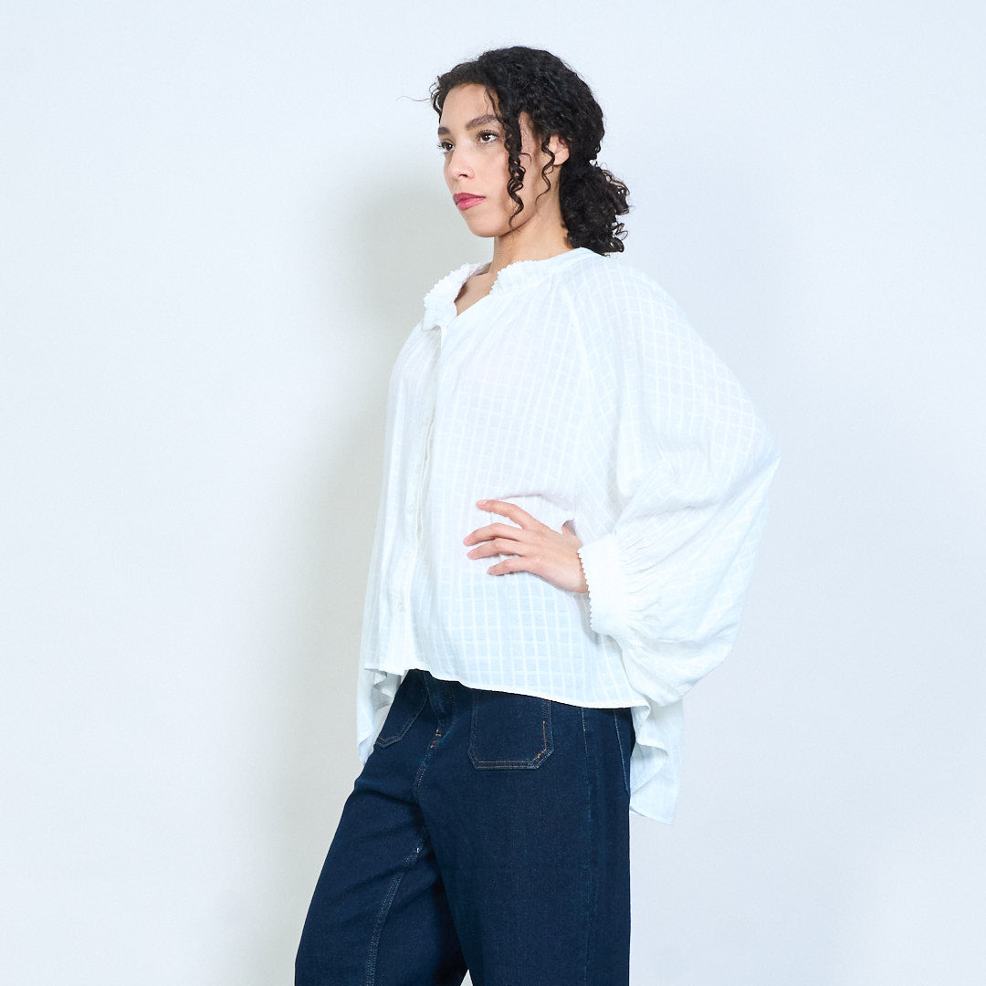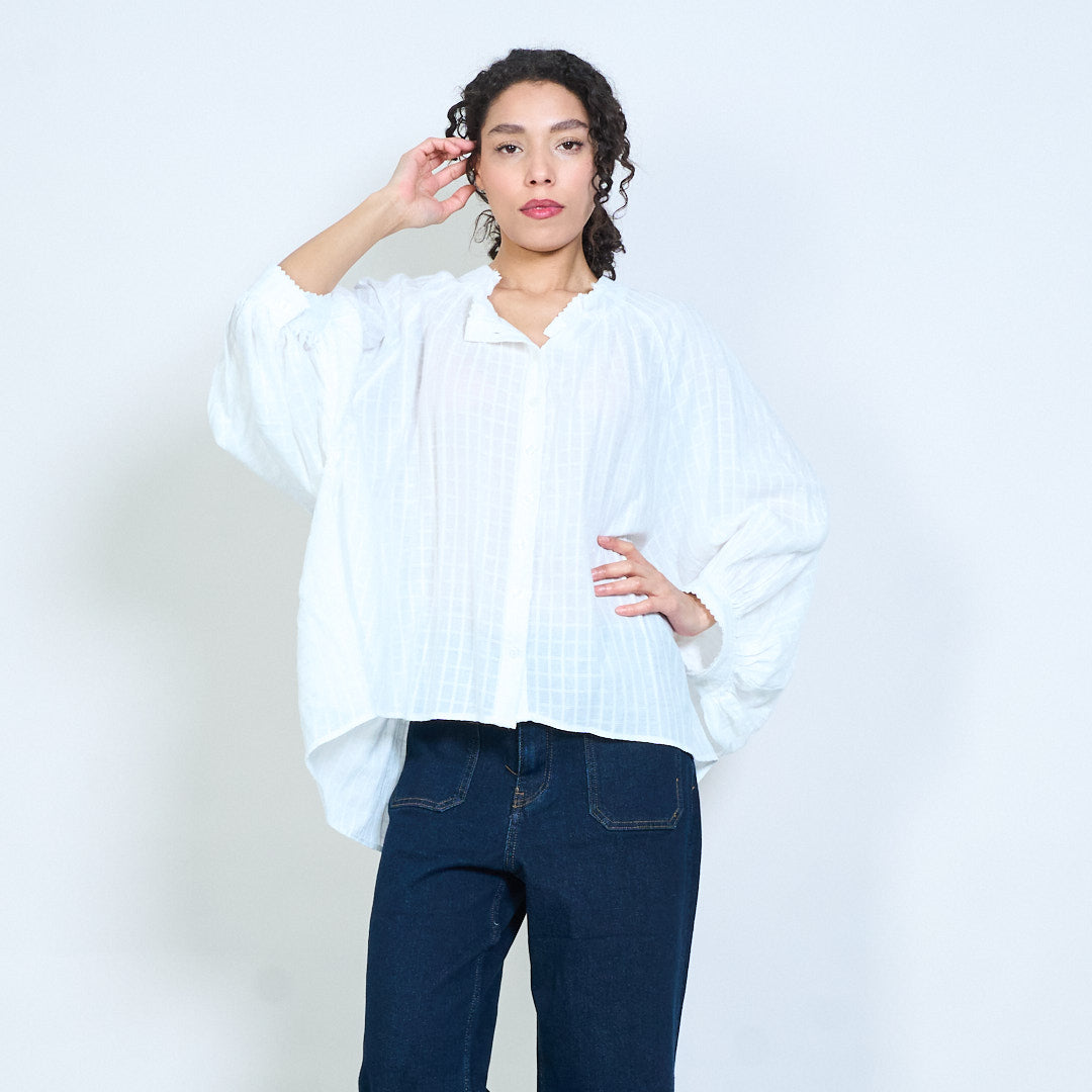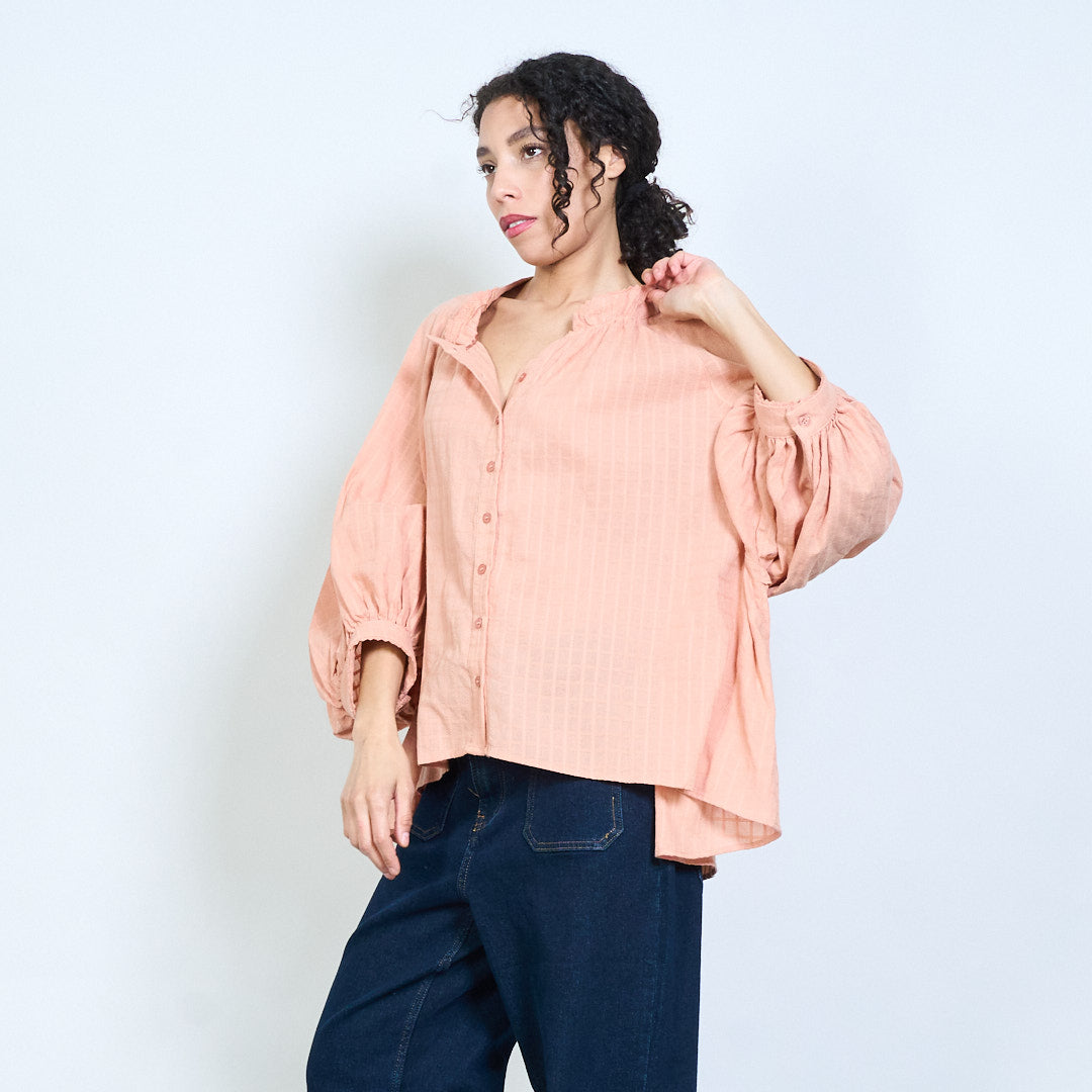 Ruffle neckline button-down textured loose fit long sleeve blouse wholesale