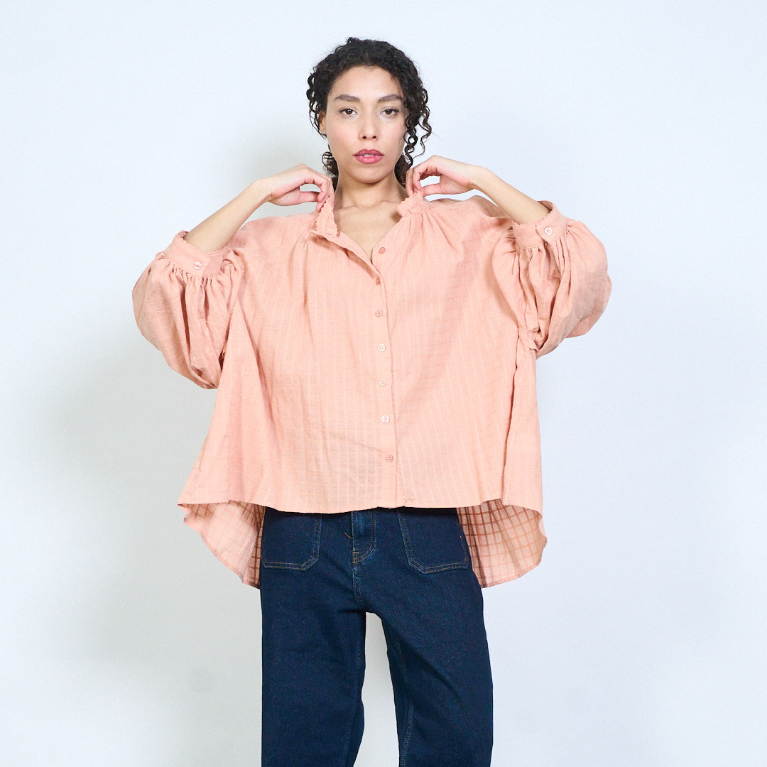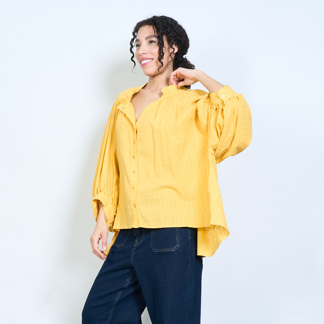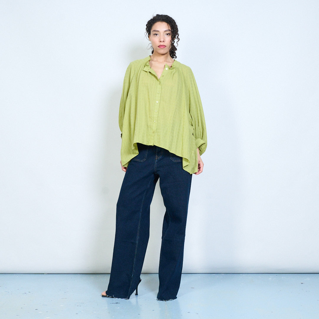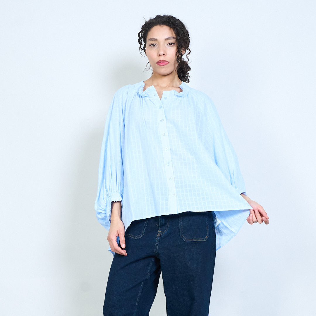 Ruffle neckline button-down textured loose fit long sleeve blouse wholesale