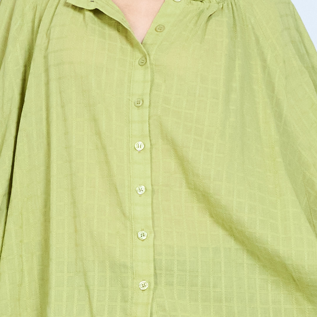 • Button-down front design with subtle gathered detailing around the collar