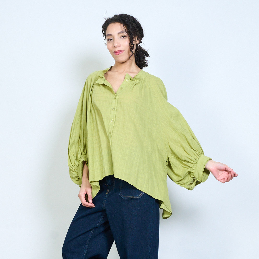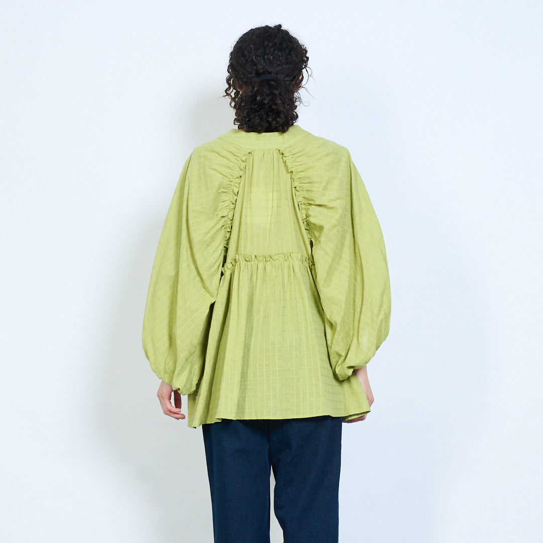 • Long voluminous sleeves with elasticated cuffs for soft structure