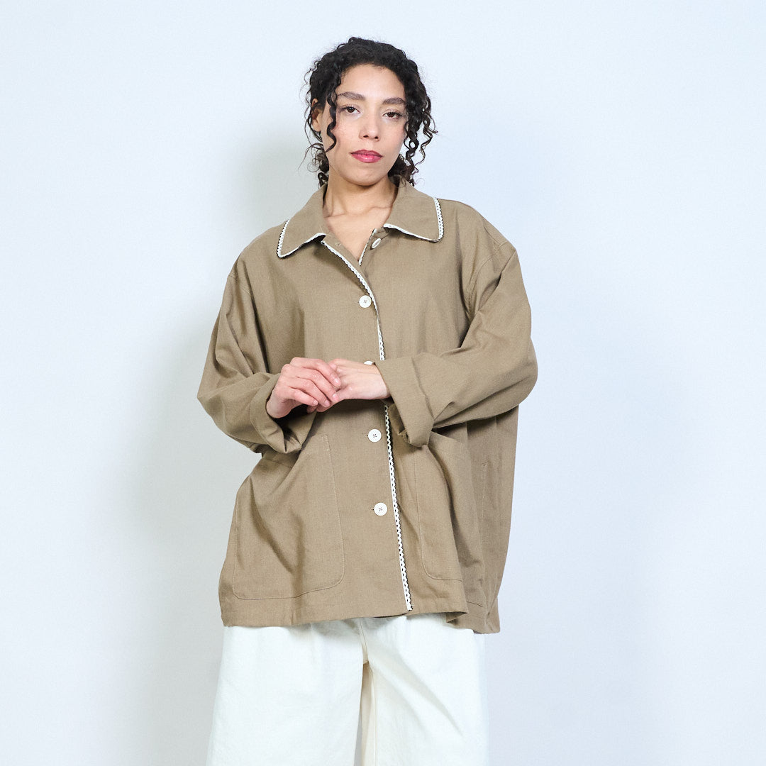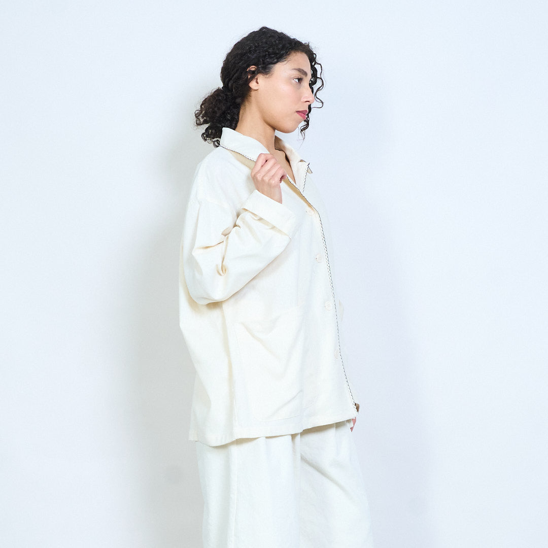 - Relaxed blouse featuring a rounded collar with delicate scallop trim detailing