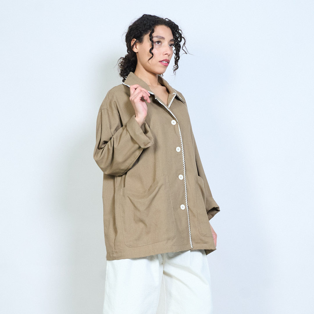 Scallop trim collar button-front relaxed blouse with front pockets wholesale