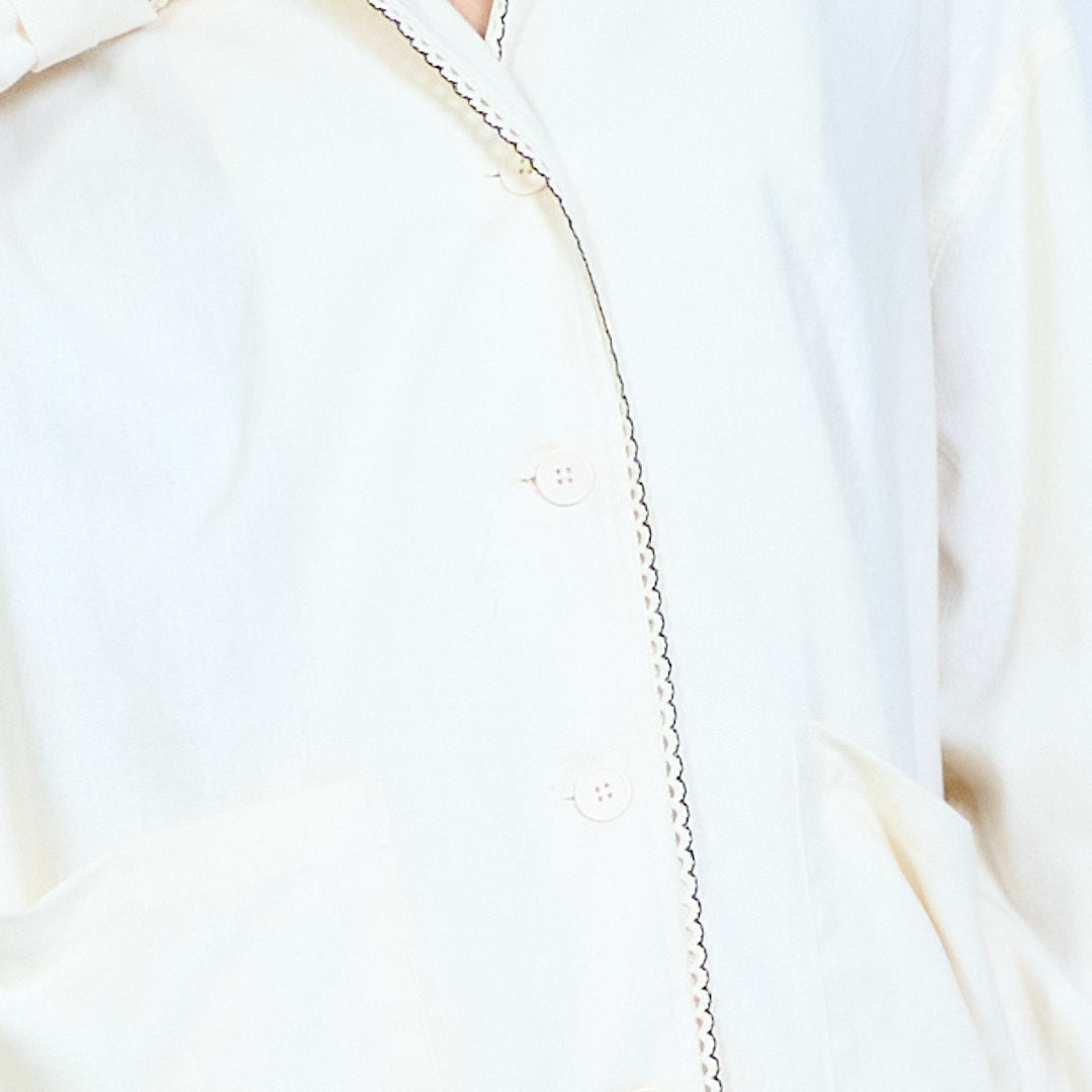 - Button-front closure with decorative scallop edge along the placket