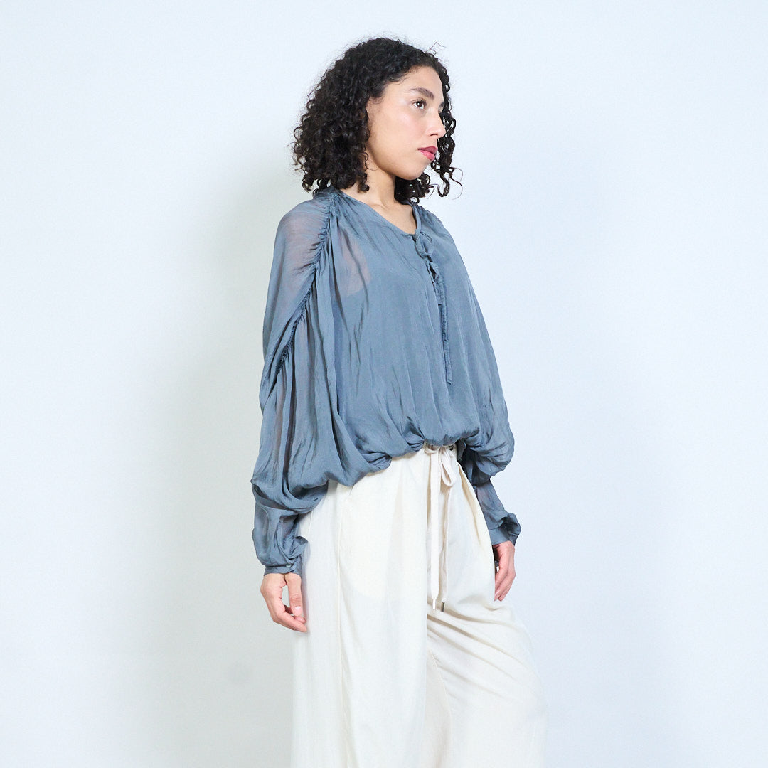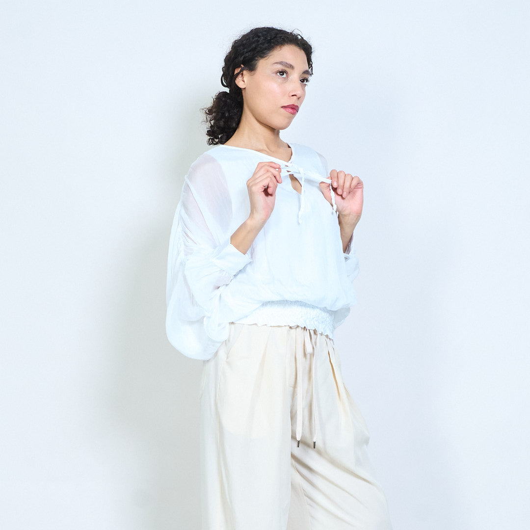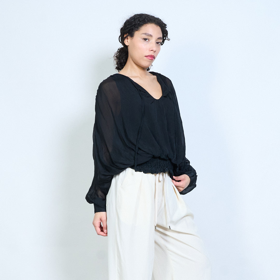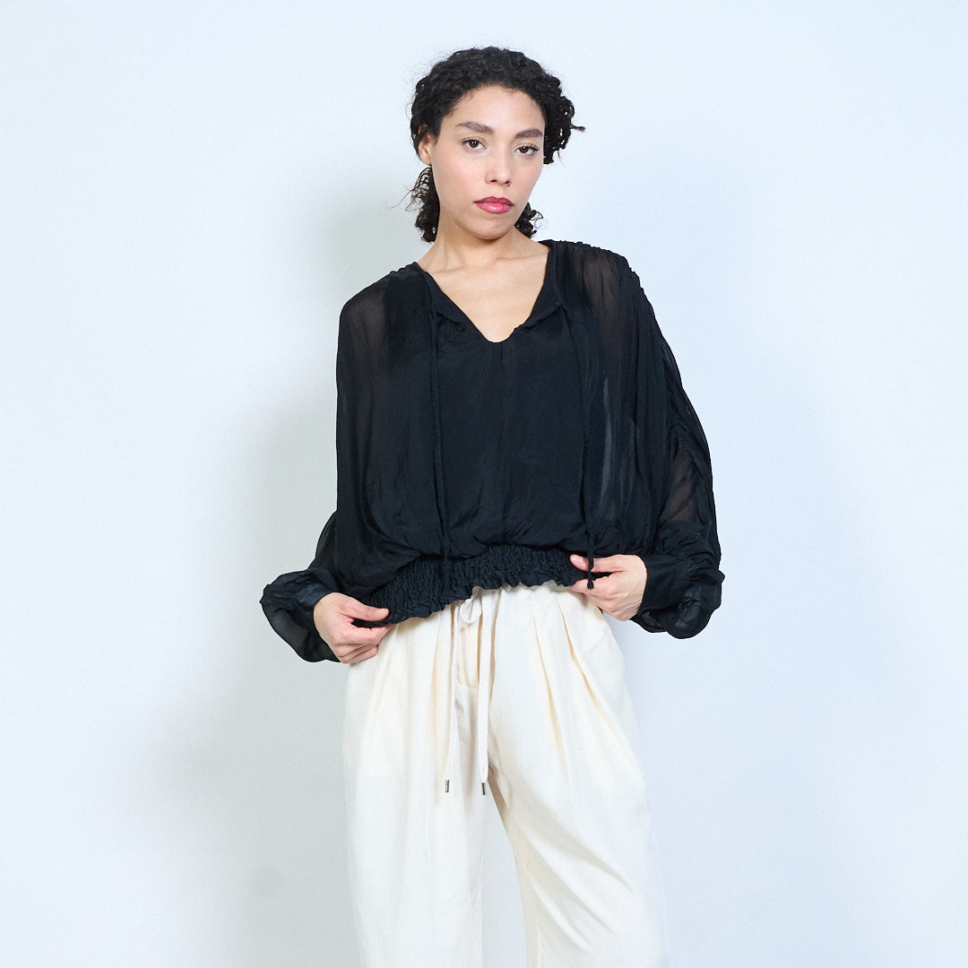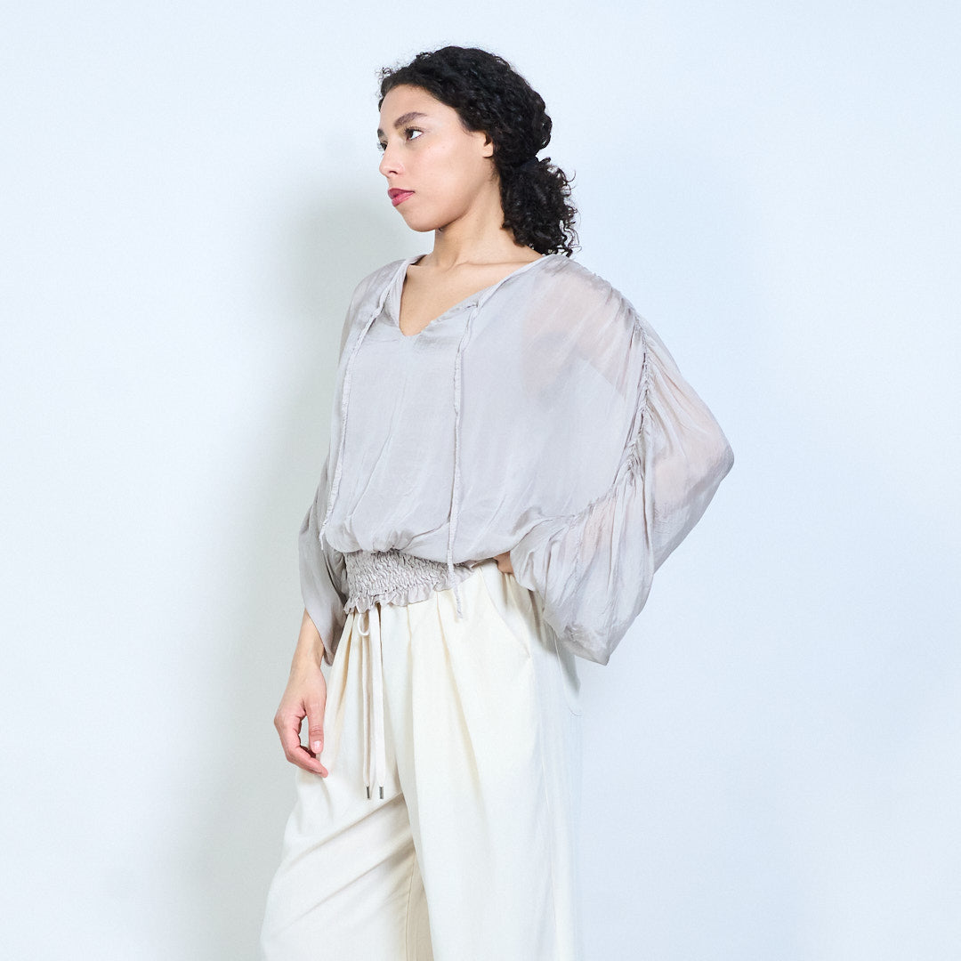 Sheer ruched sleeve tie-neck blouse with smocked hem wholesale