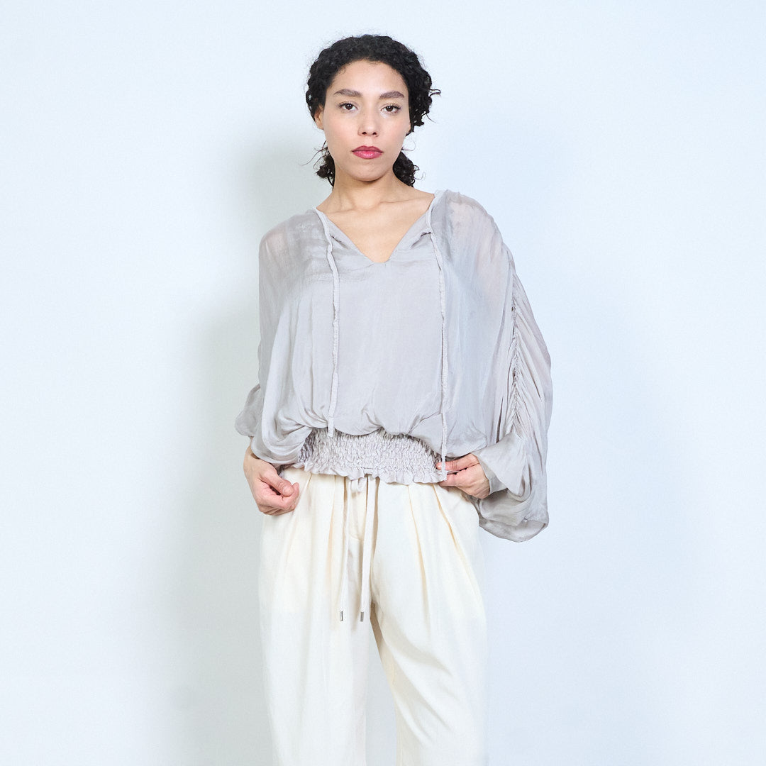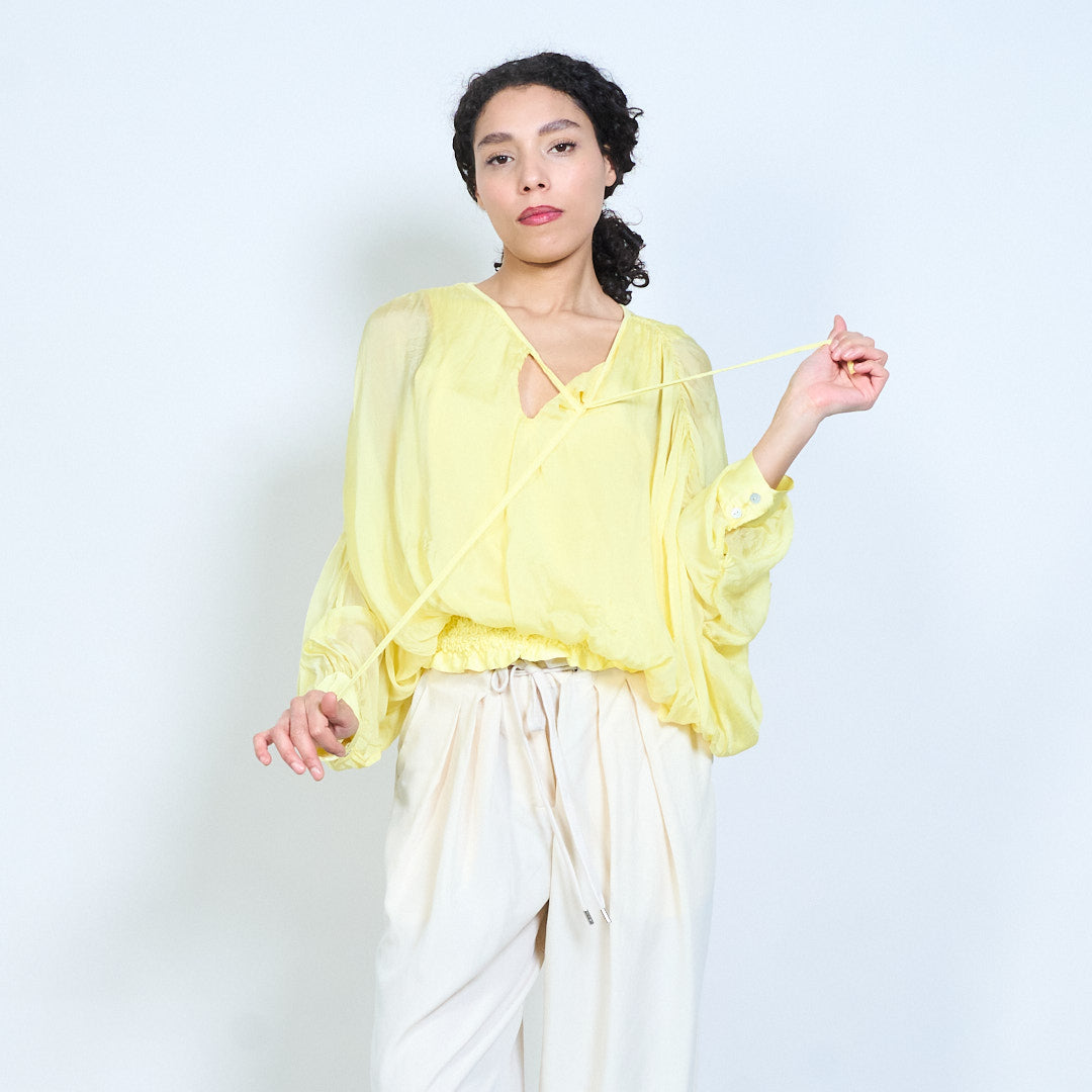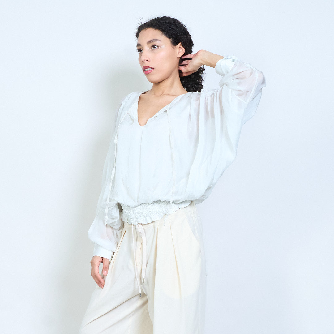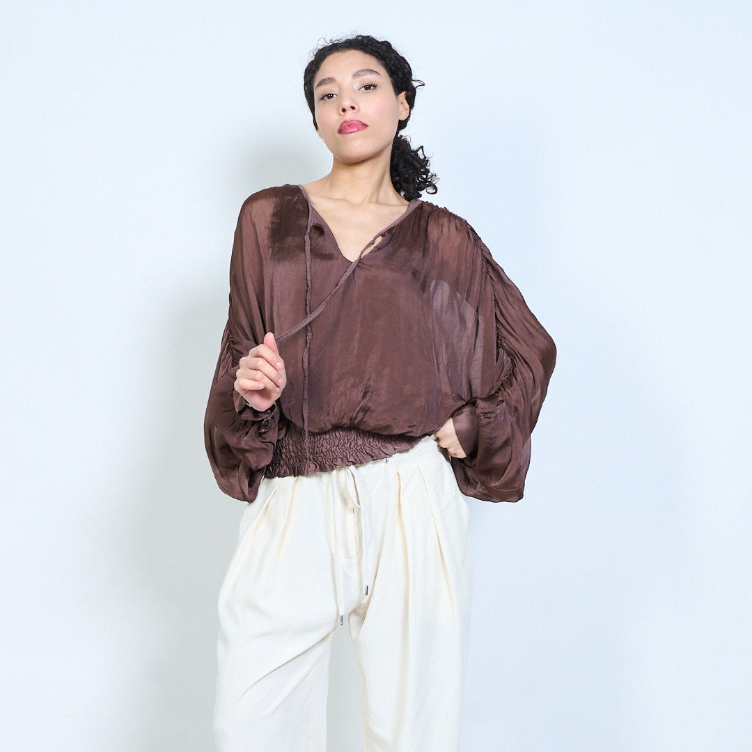 Sheer ruched sleeve tie-neck blouse with smocked hem wholesale