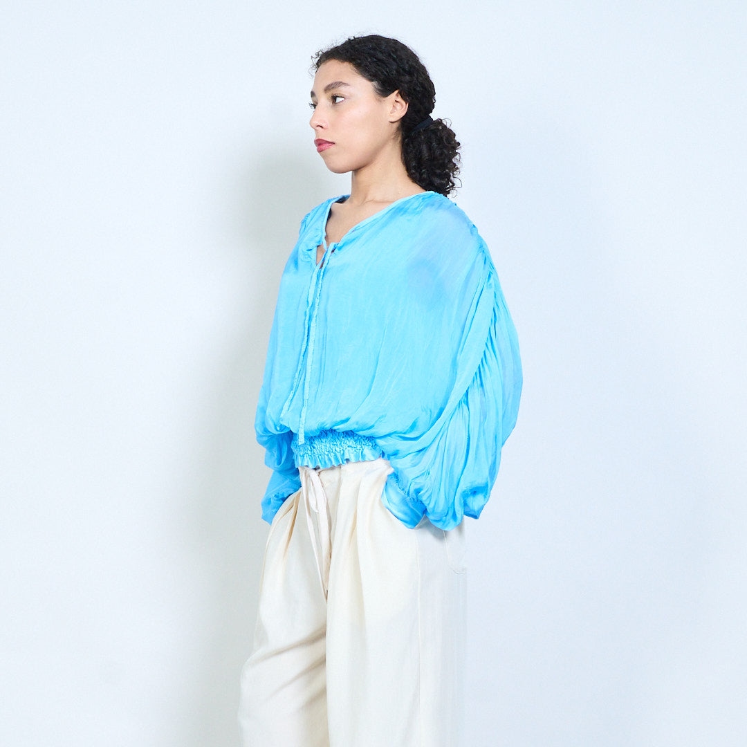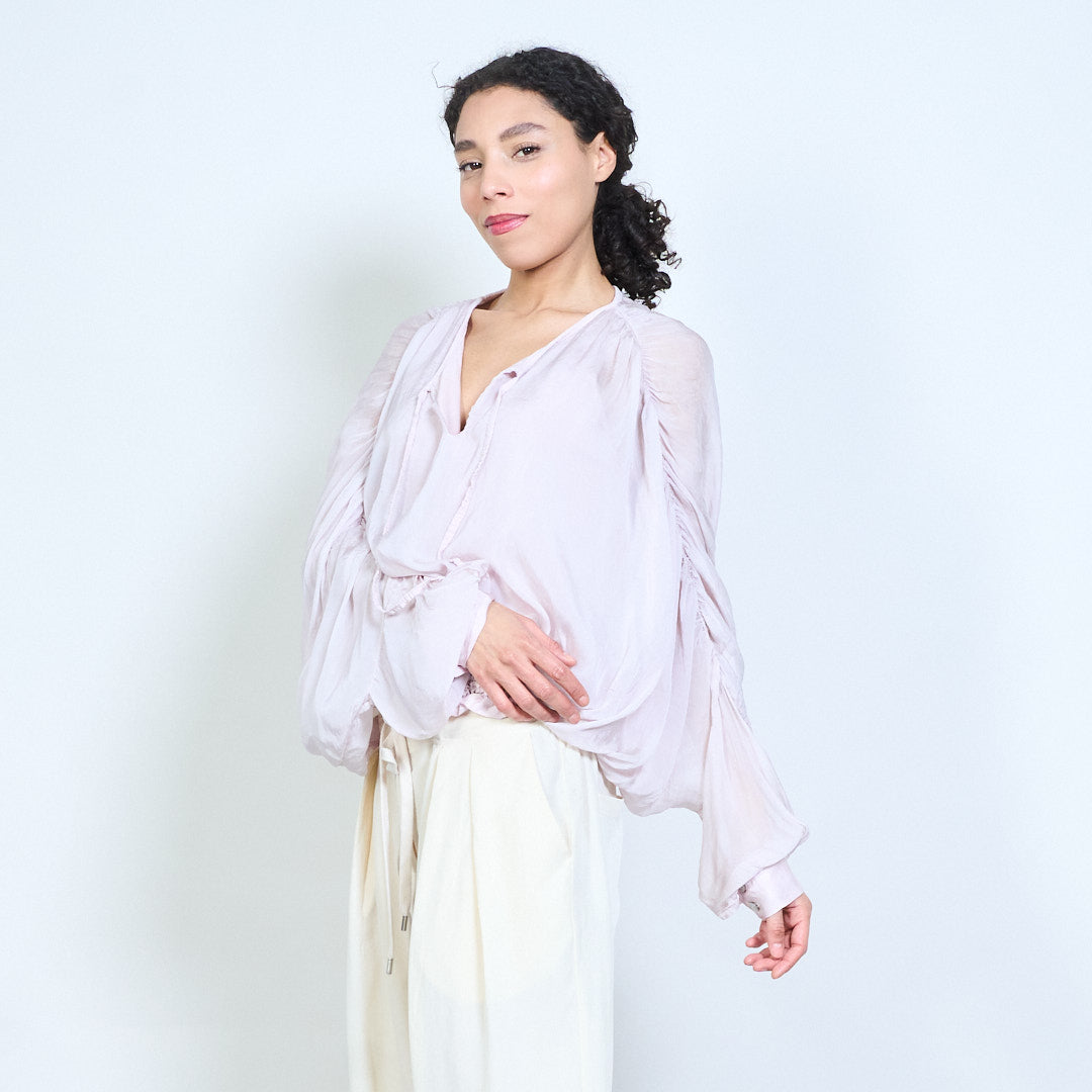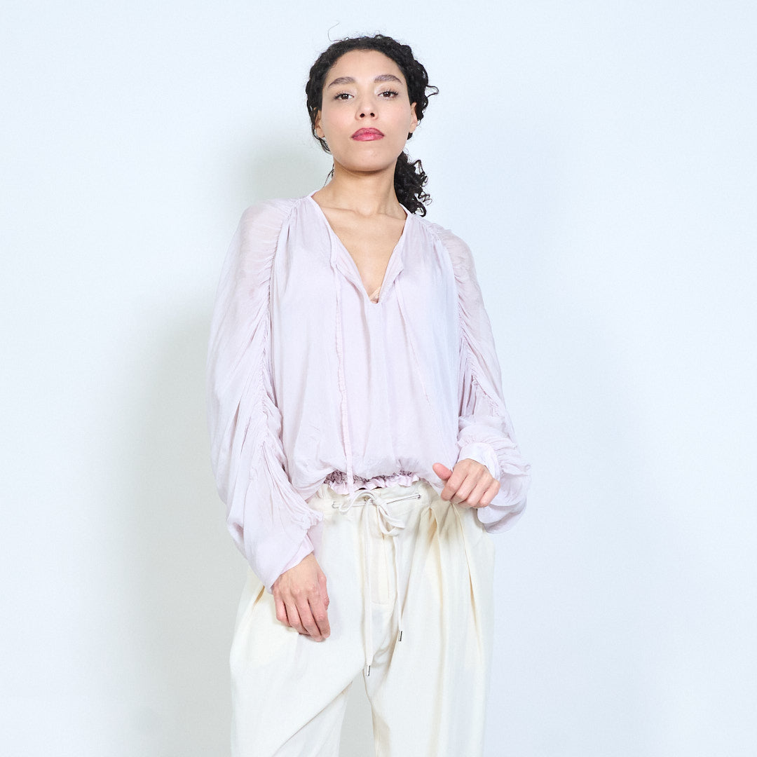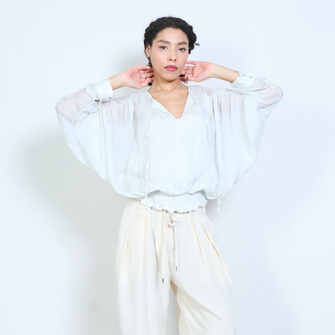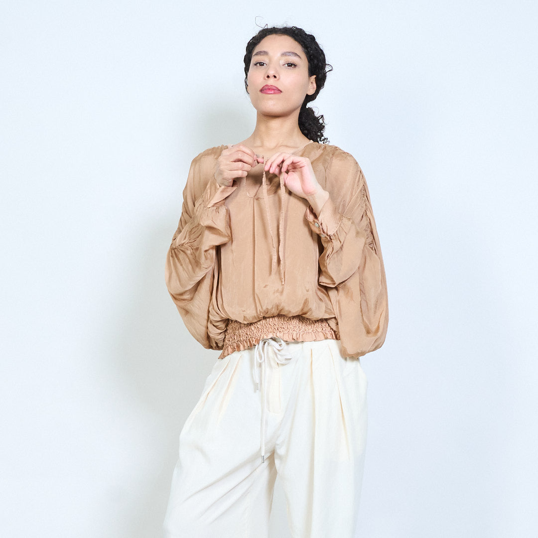 Sheer ruched sleeve tie-neck blouse with smocked hem wholesale