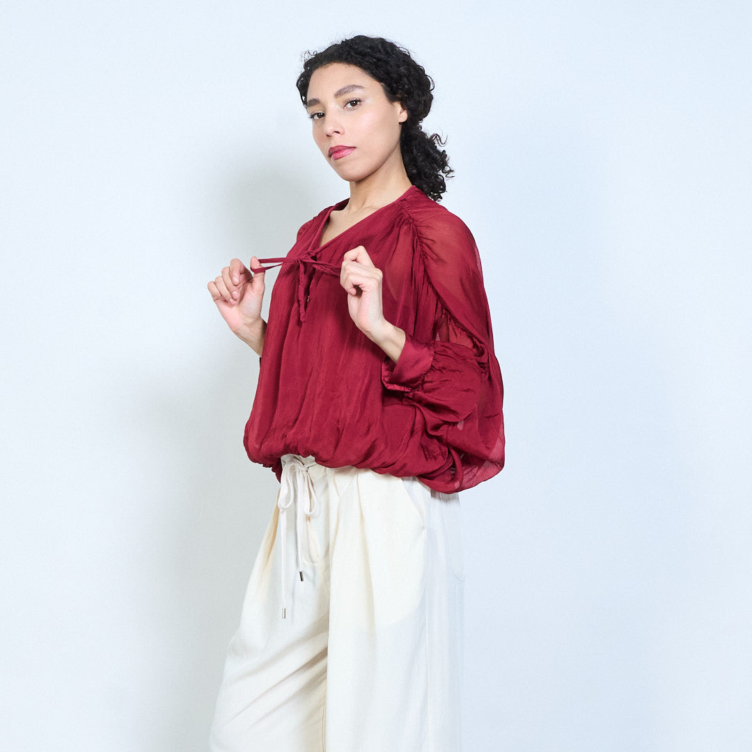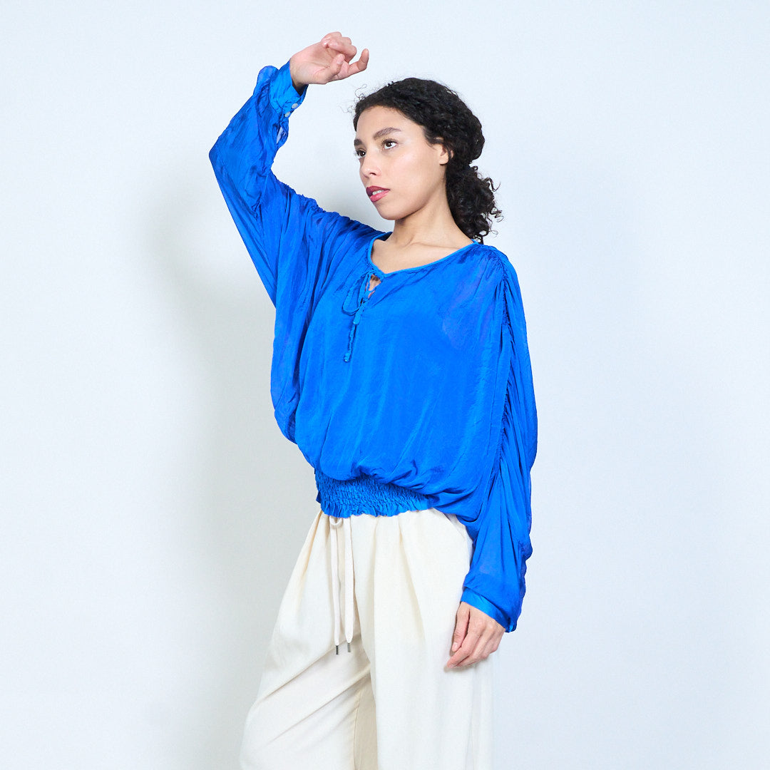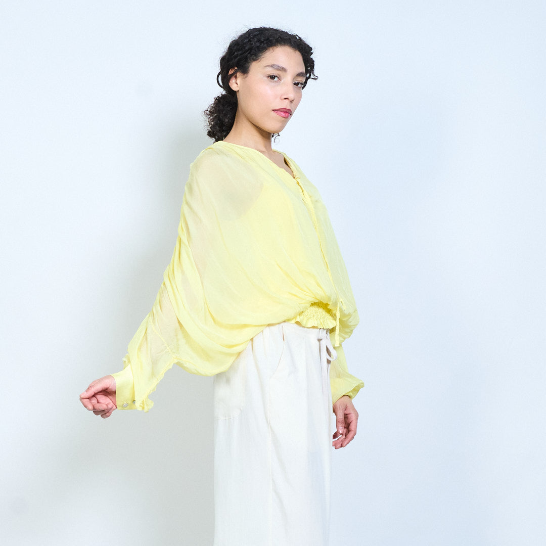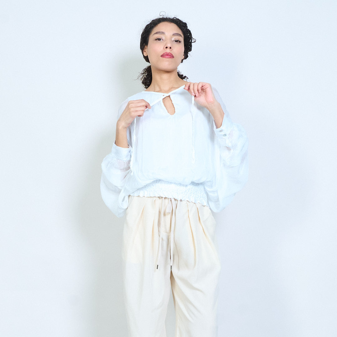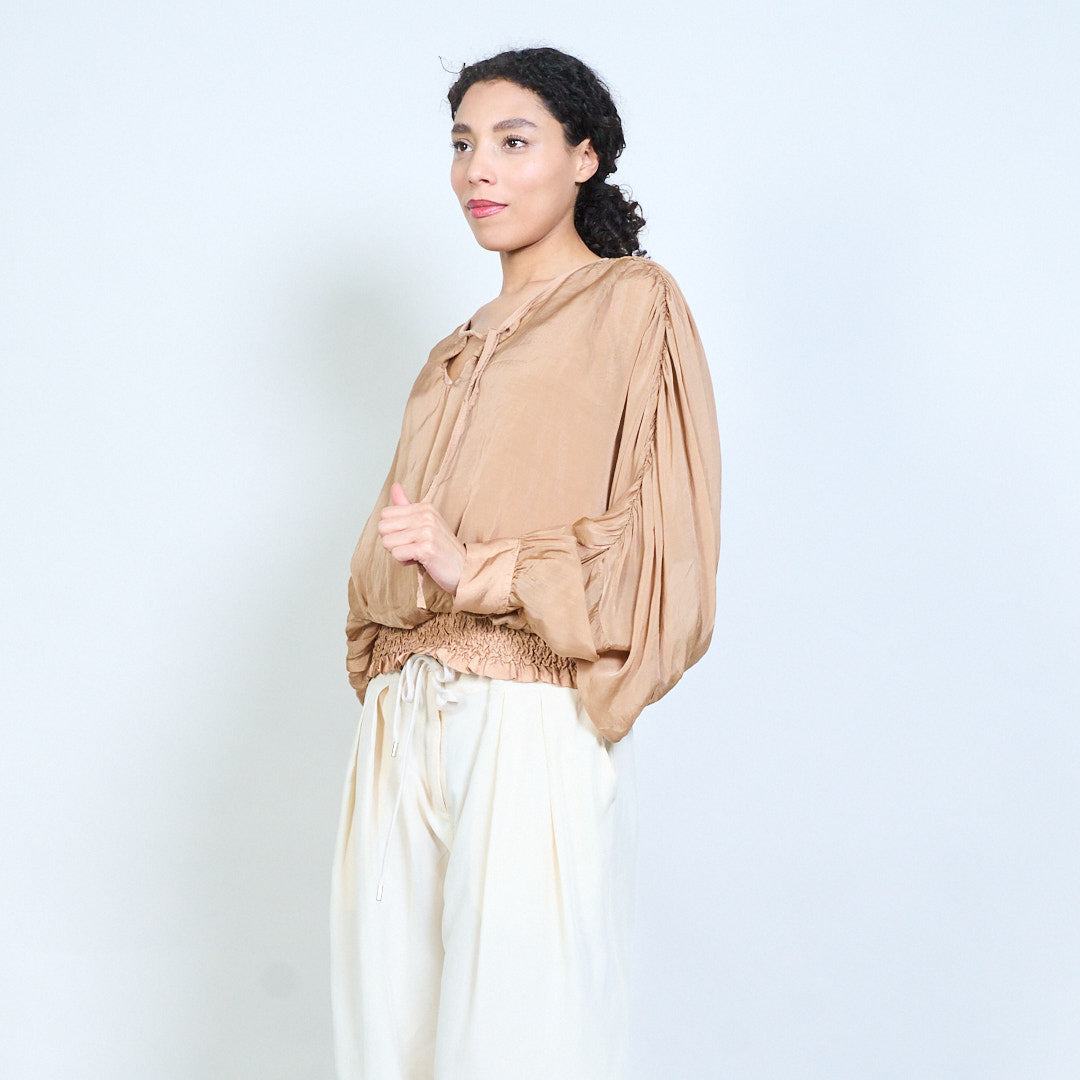Sheer ruched sleeve tie-neck blouse with smocked hem wholesale