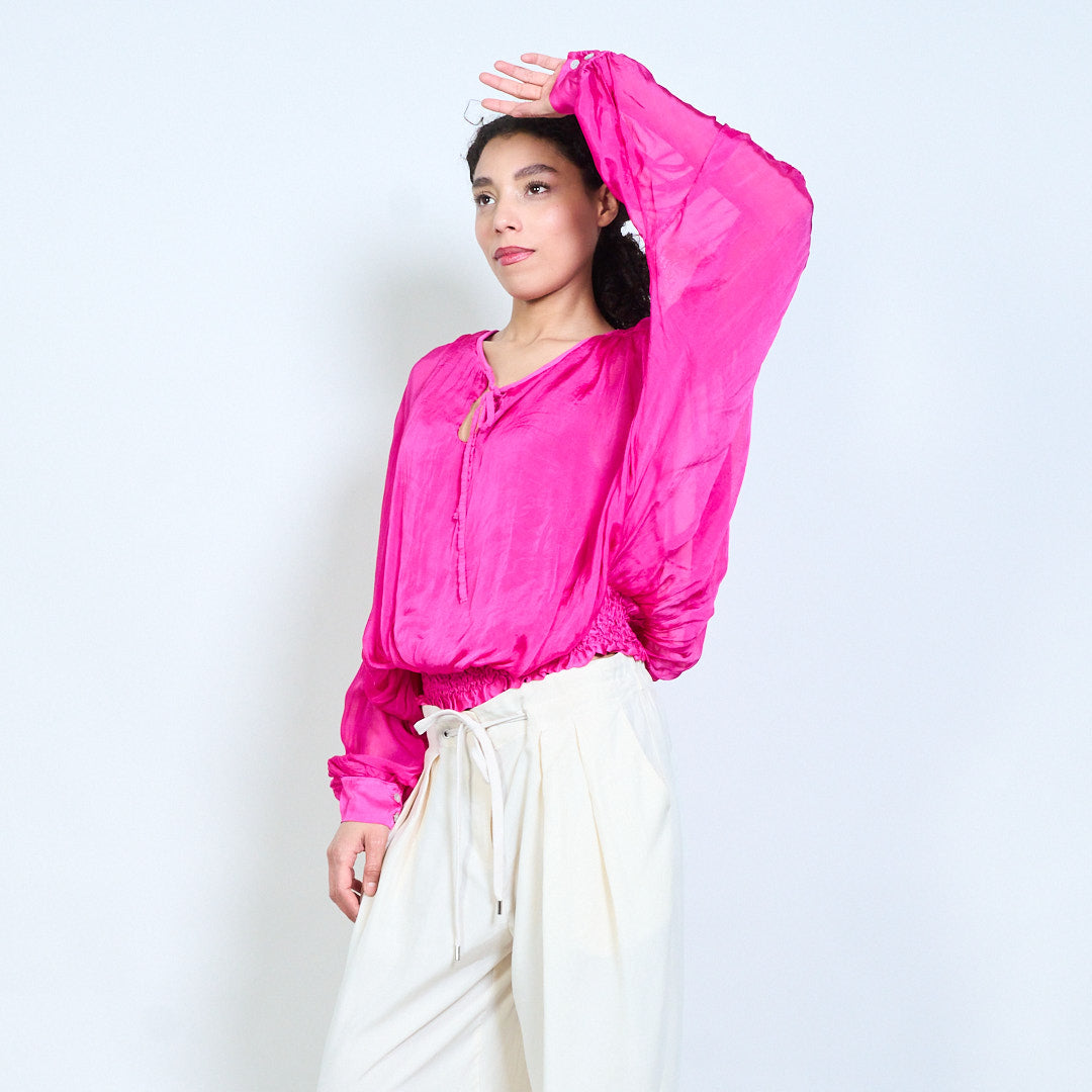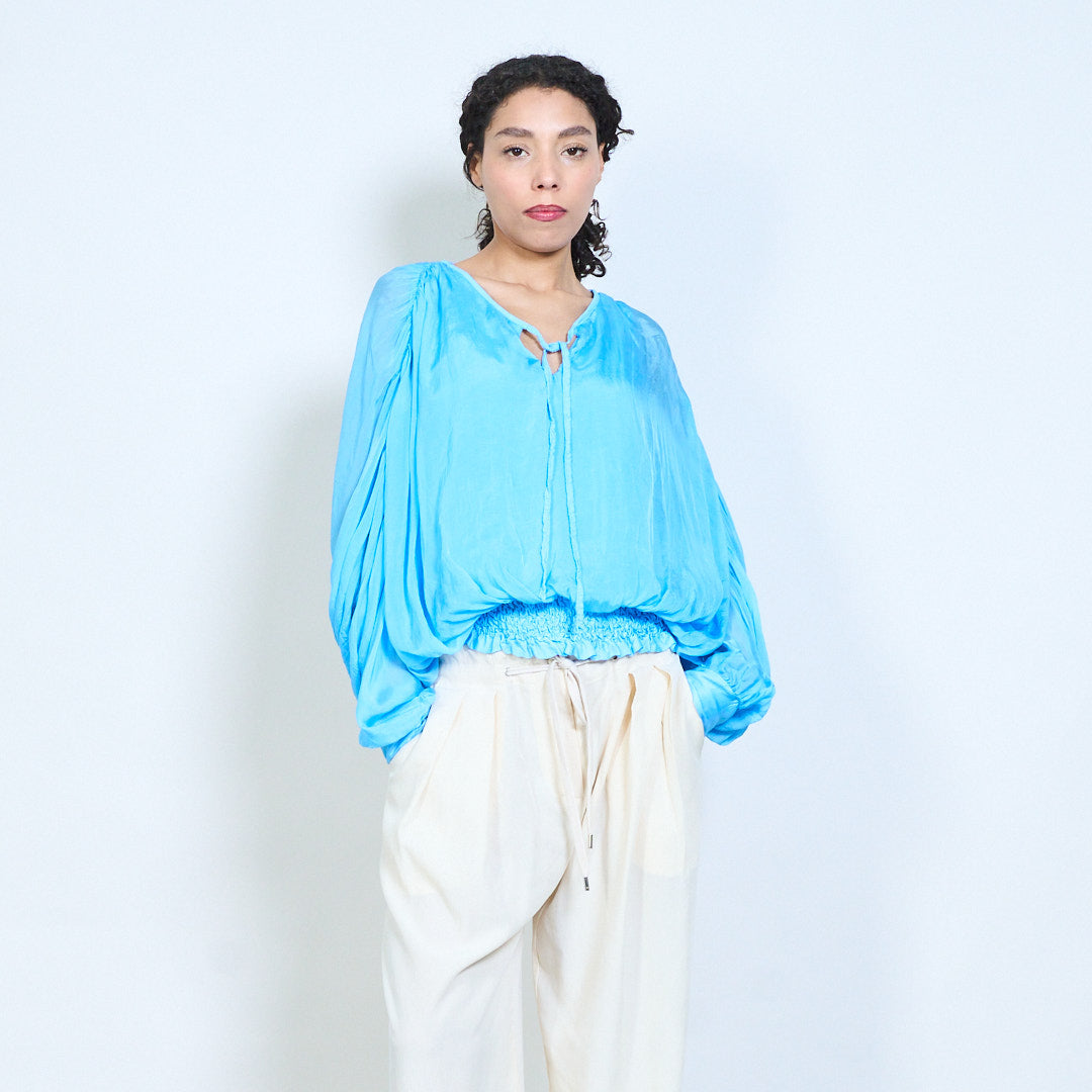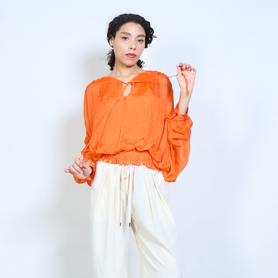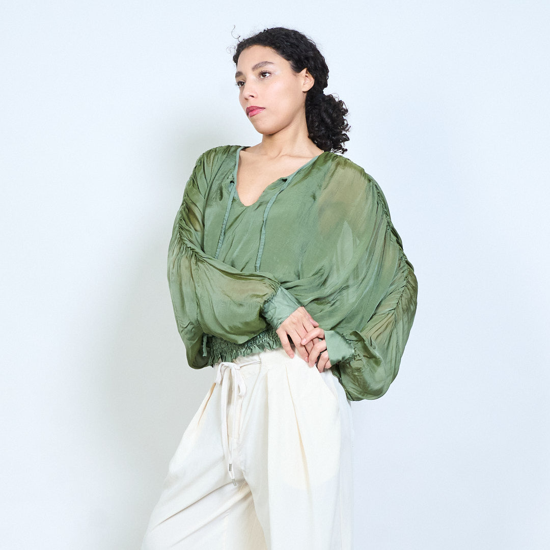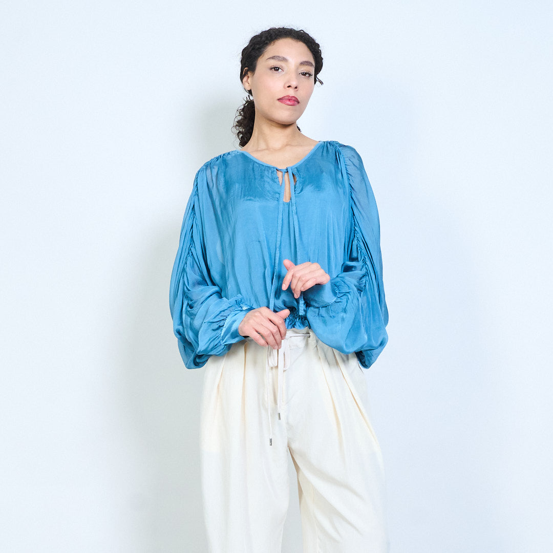 Sheer ruched sleeve tie-neck blouse with smocked hem wholesale