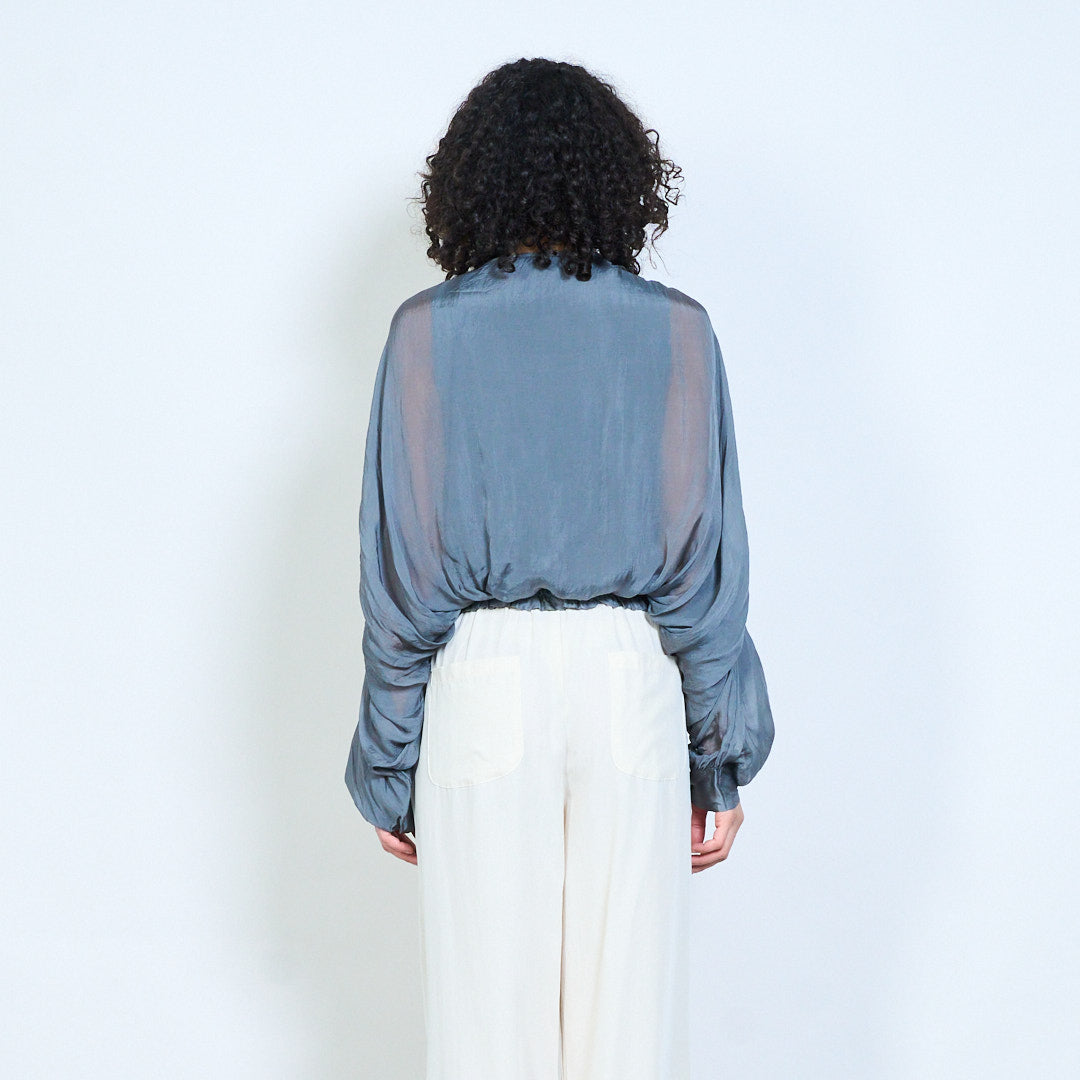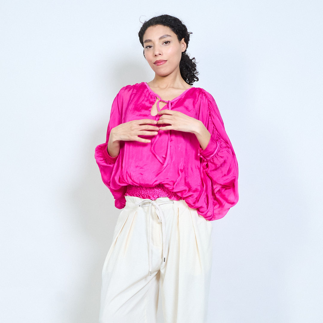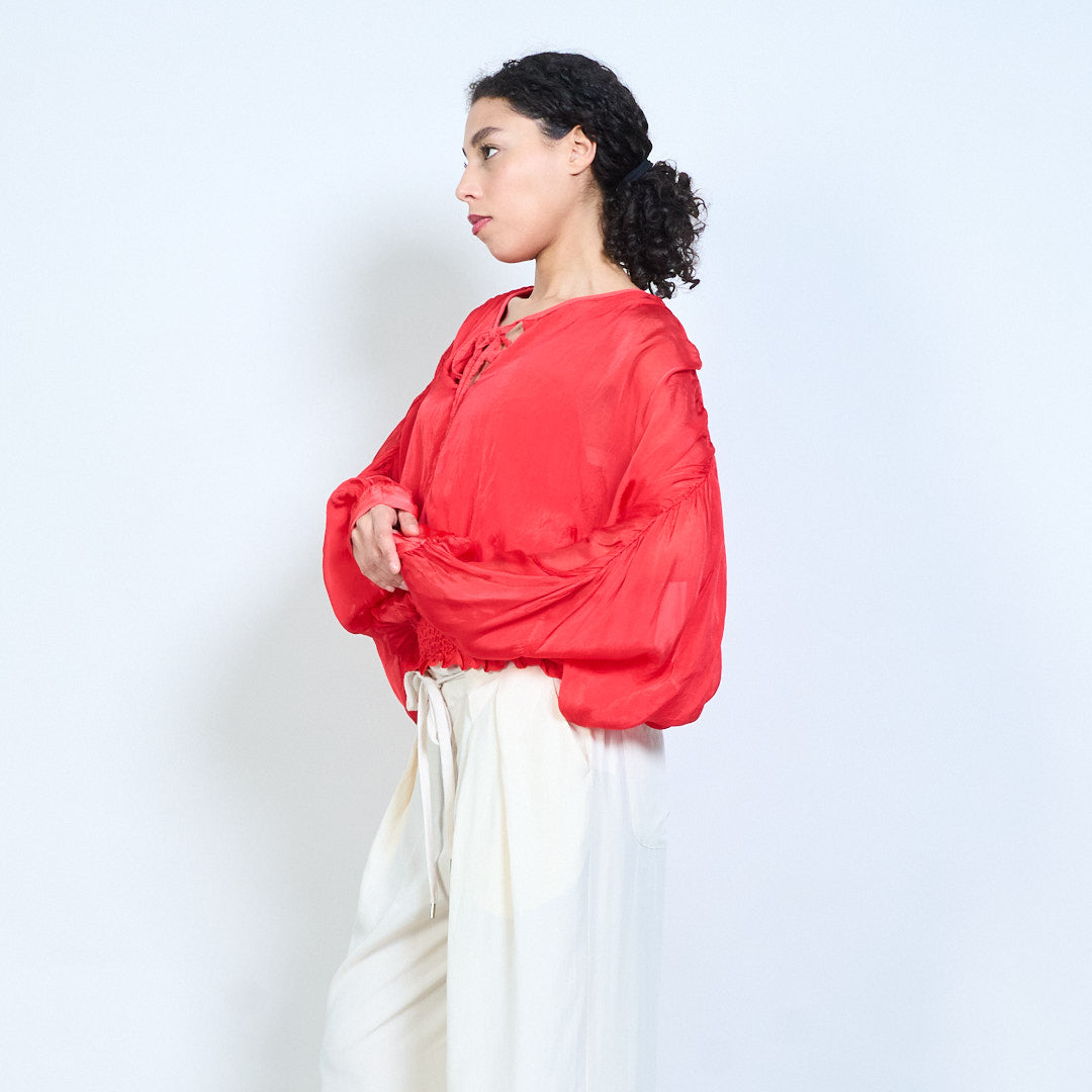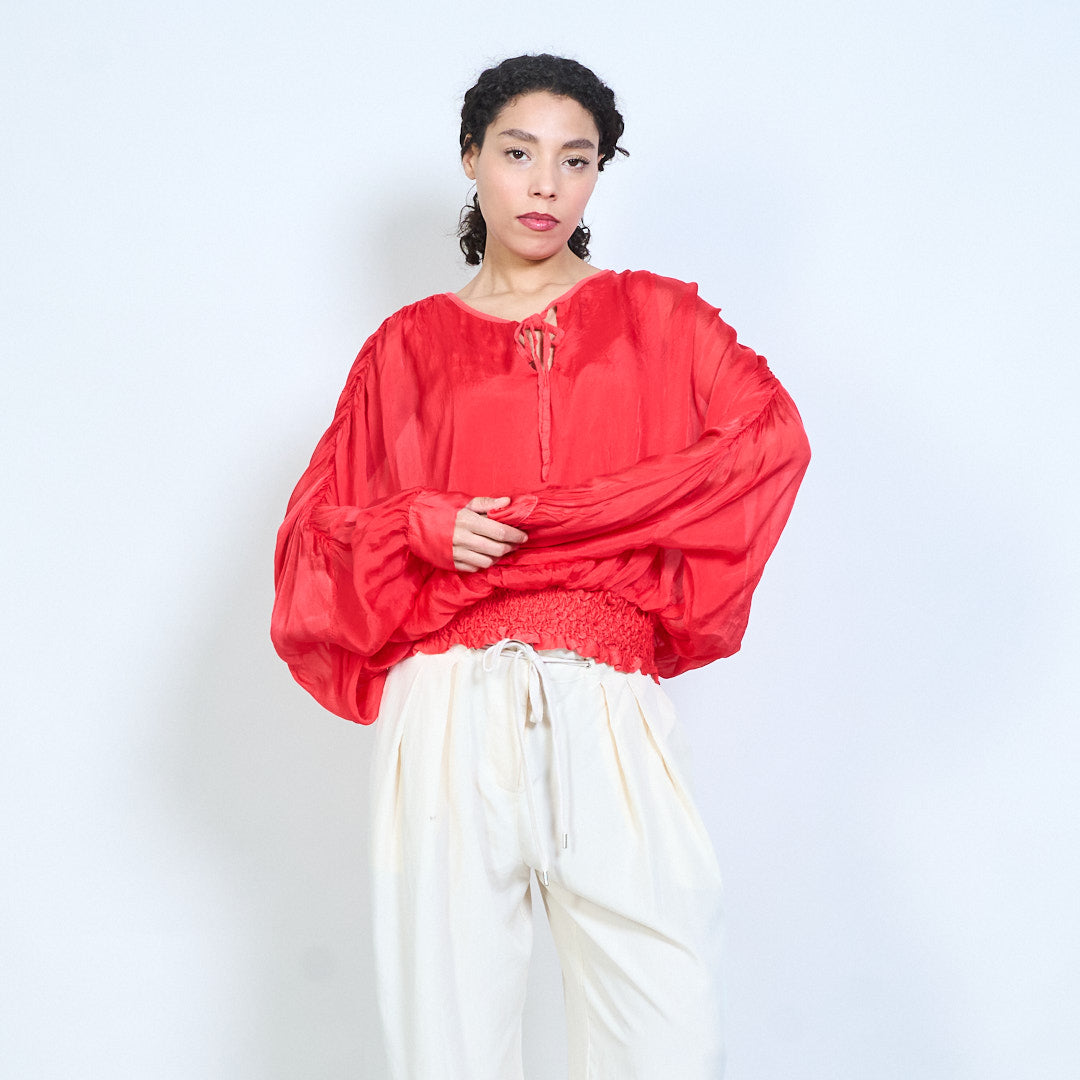 Sheer ruched sleeve tie-neck blouse with smocked hem wholesale