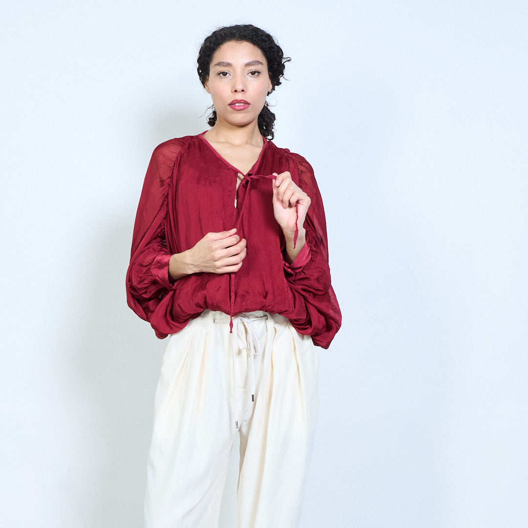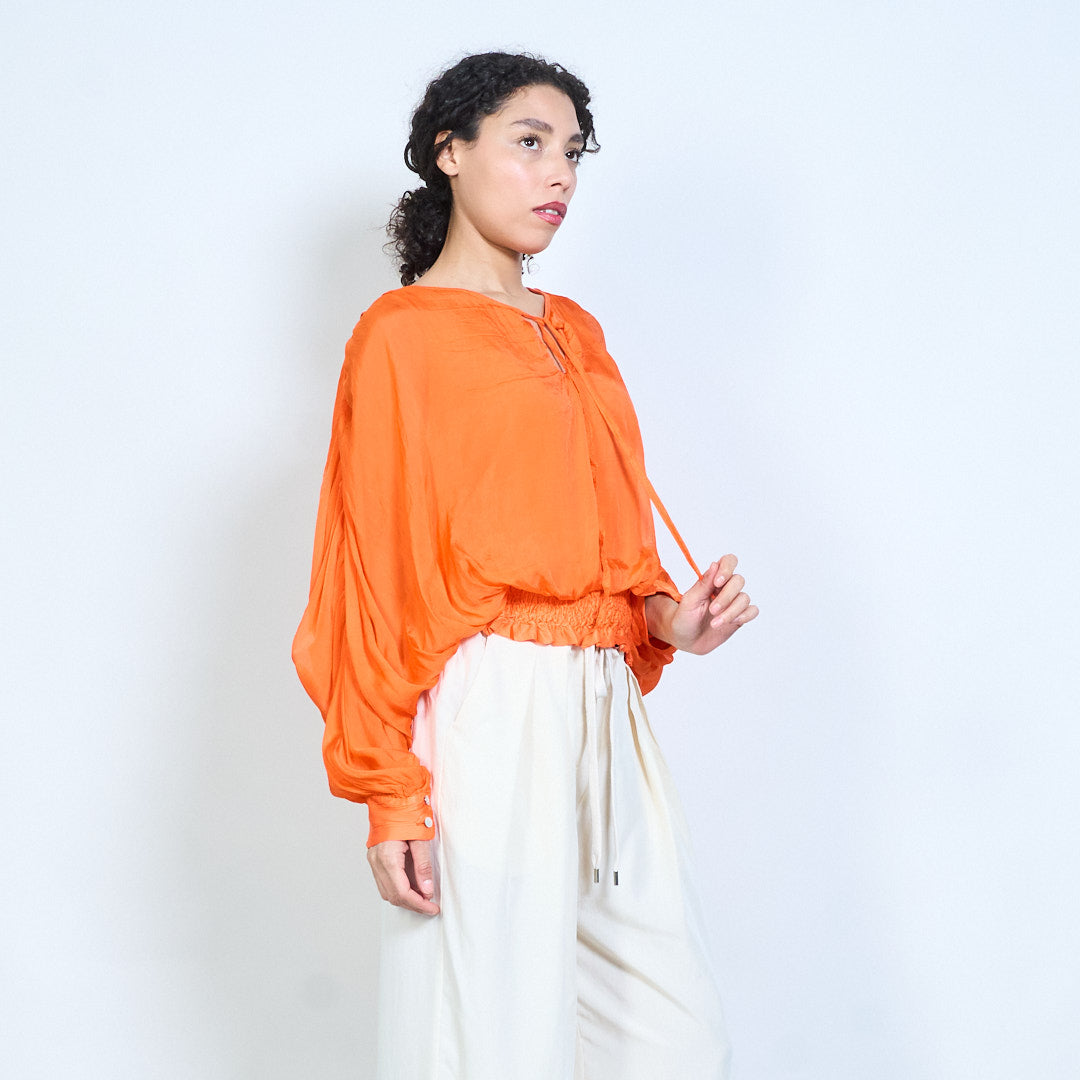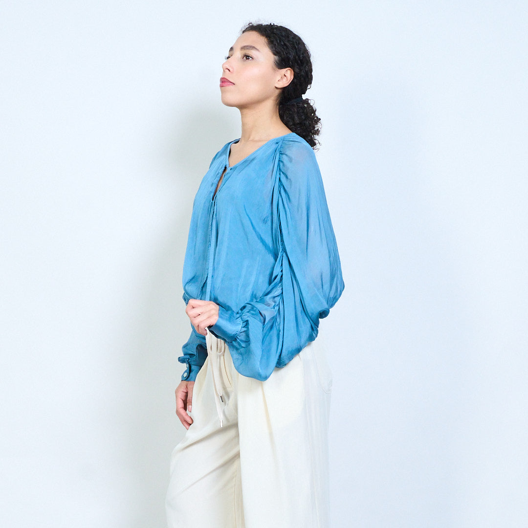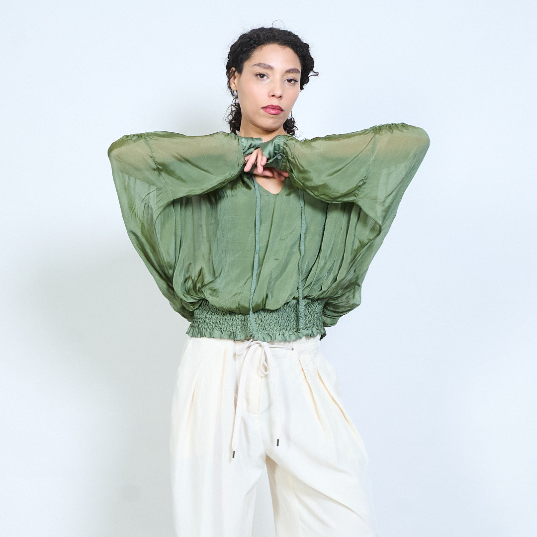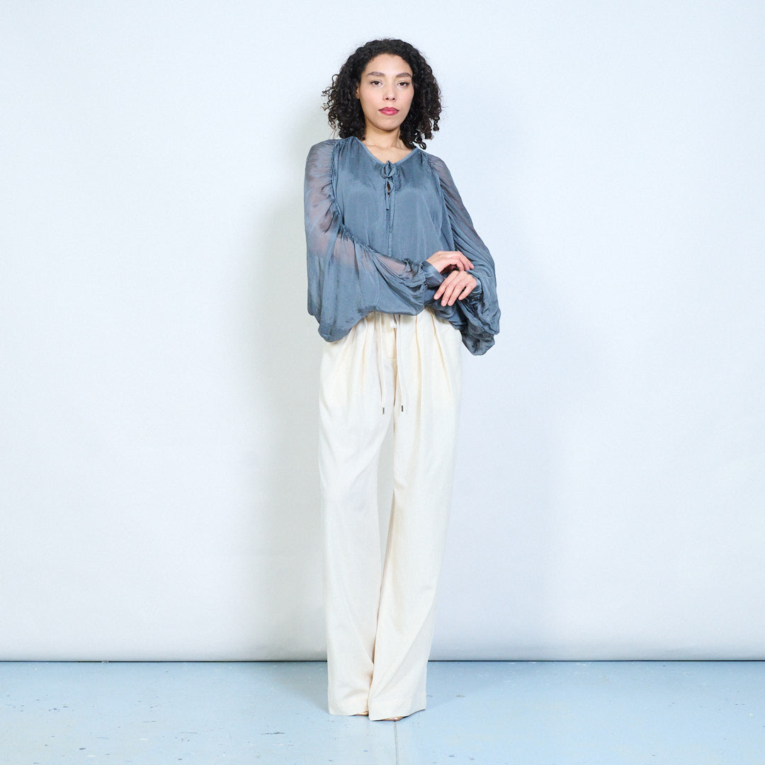 Sheer ruched sleeve tie-neck blouse with smocked hem wholesale