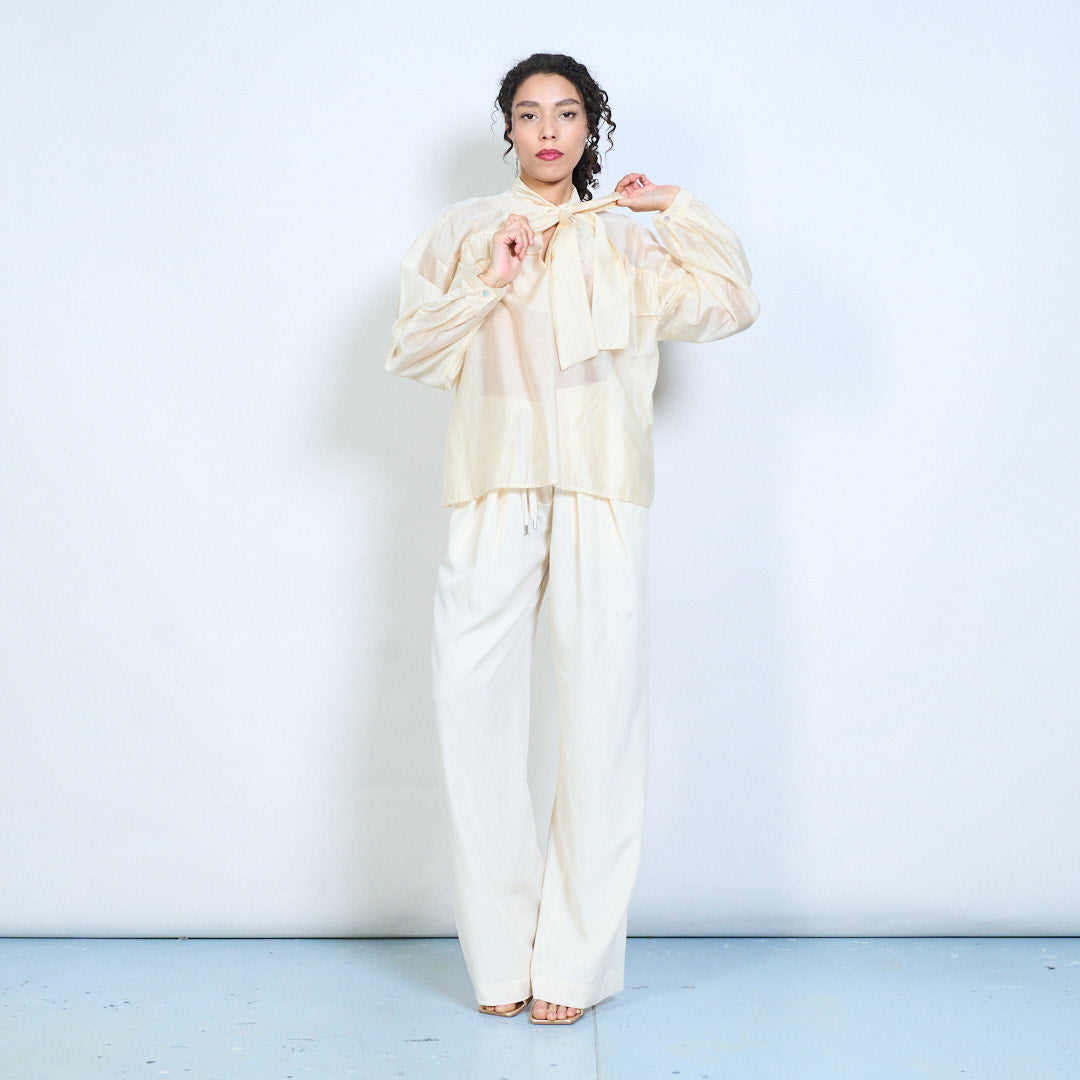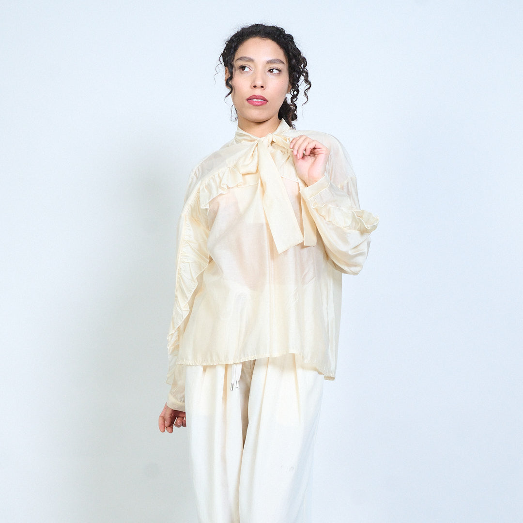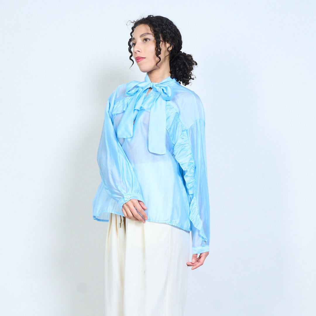 - Elegant sheer blouse featuring a statement bow tie neckline detail