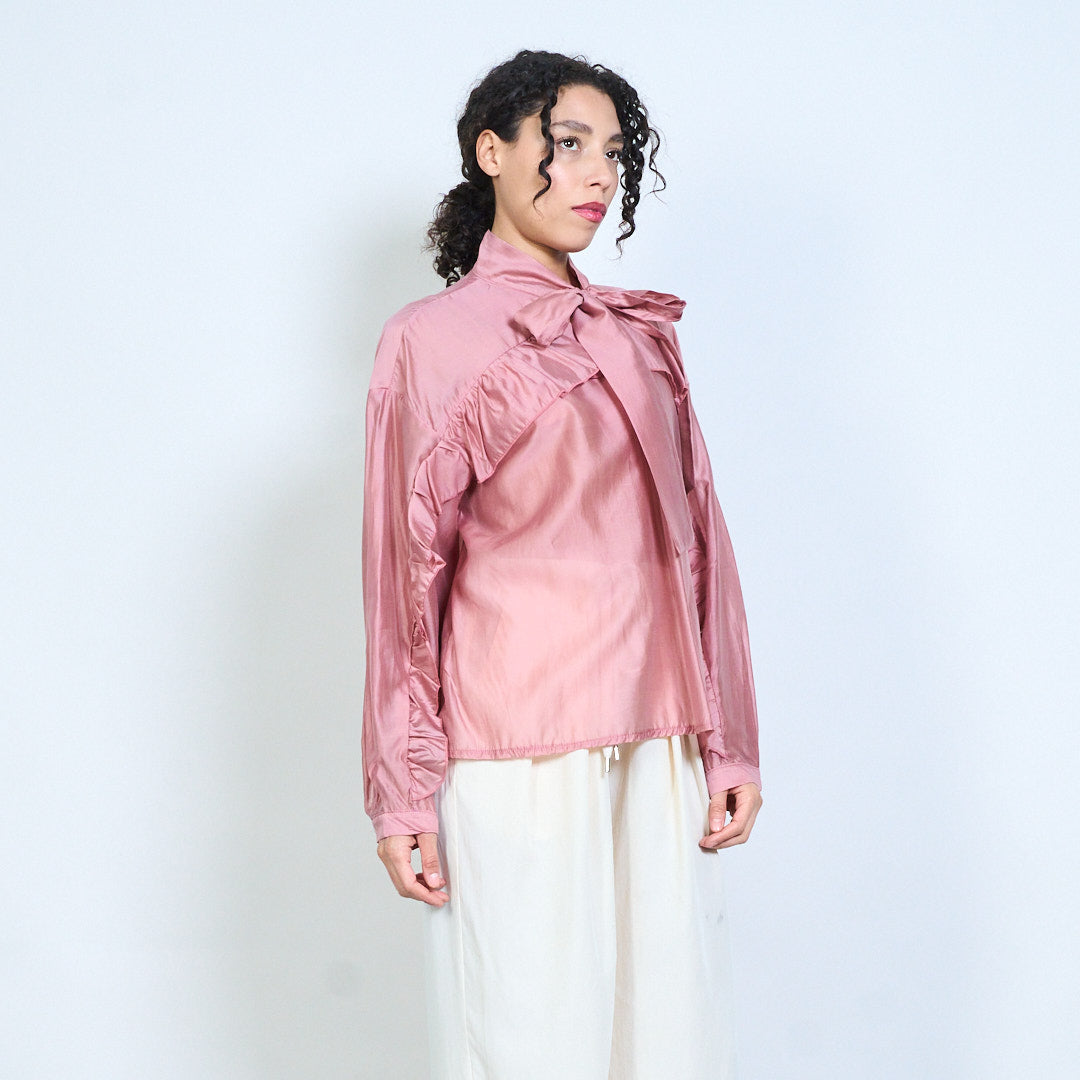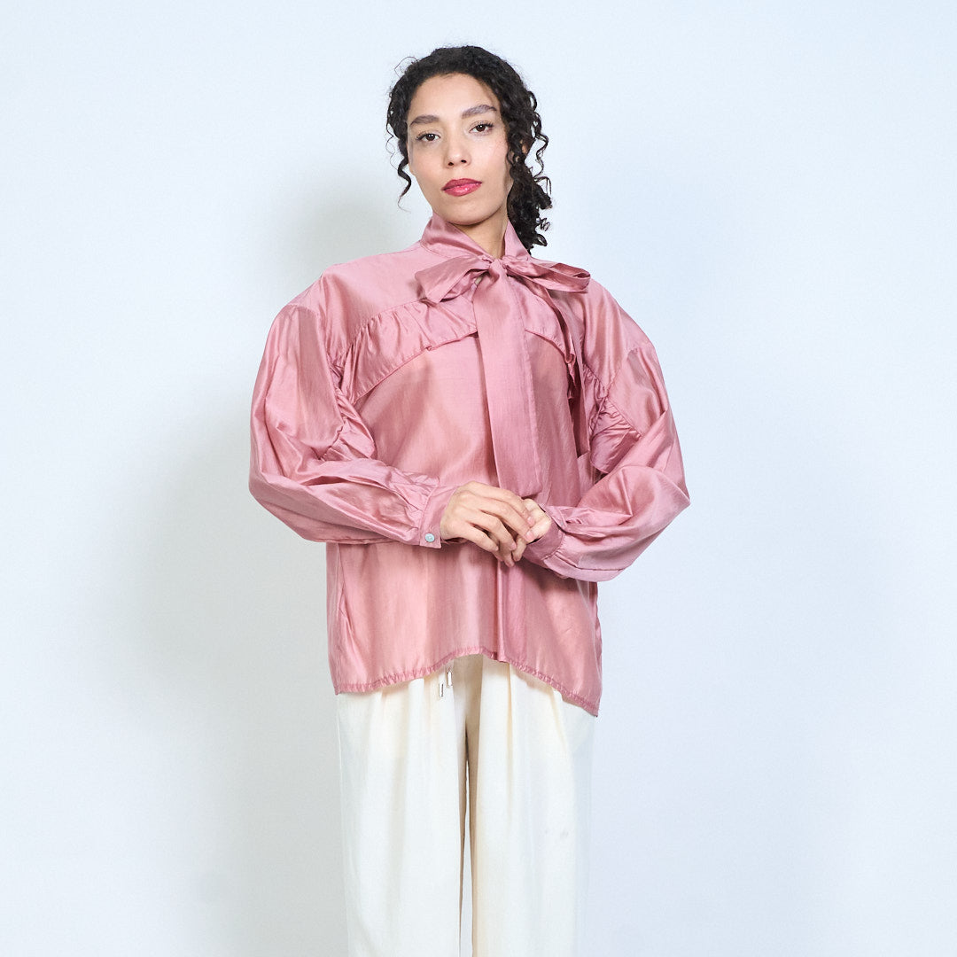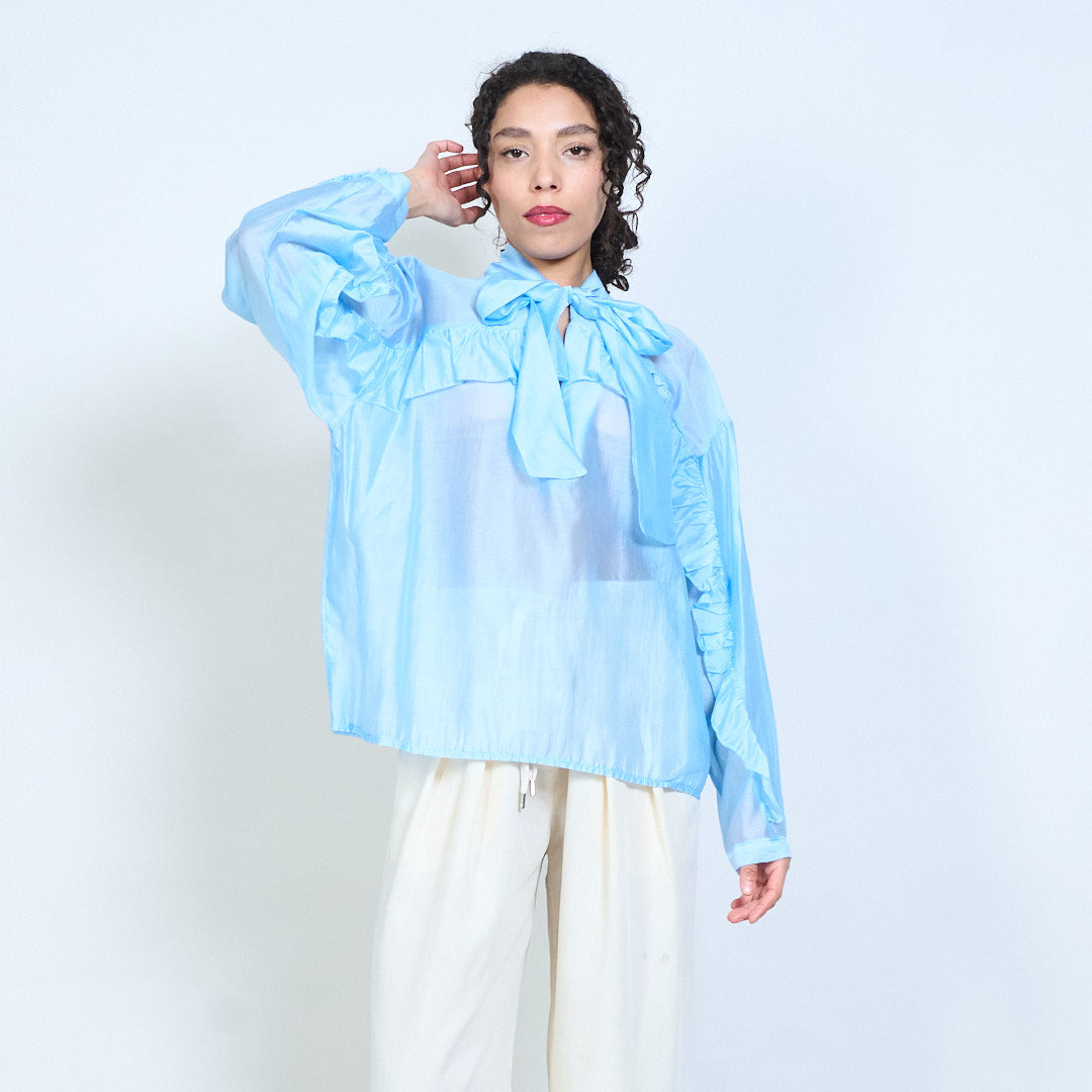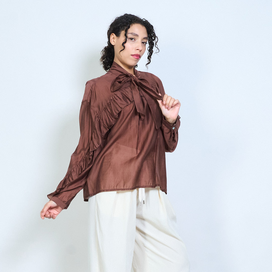 - Elegant sheer blouse featuring a statement bow tie neckline detail