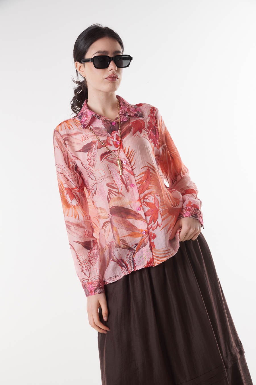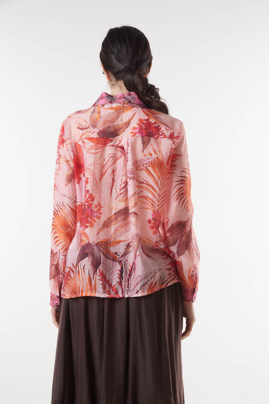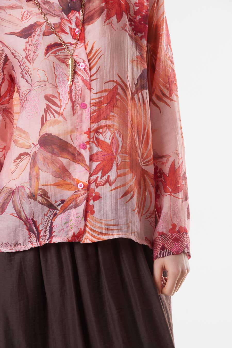 Tropical floral print sheer collared button front blouse wholesale