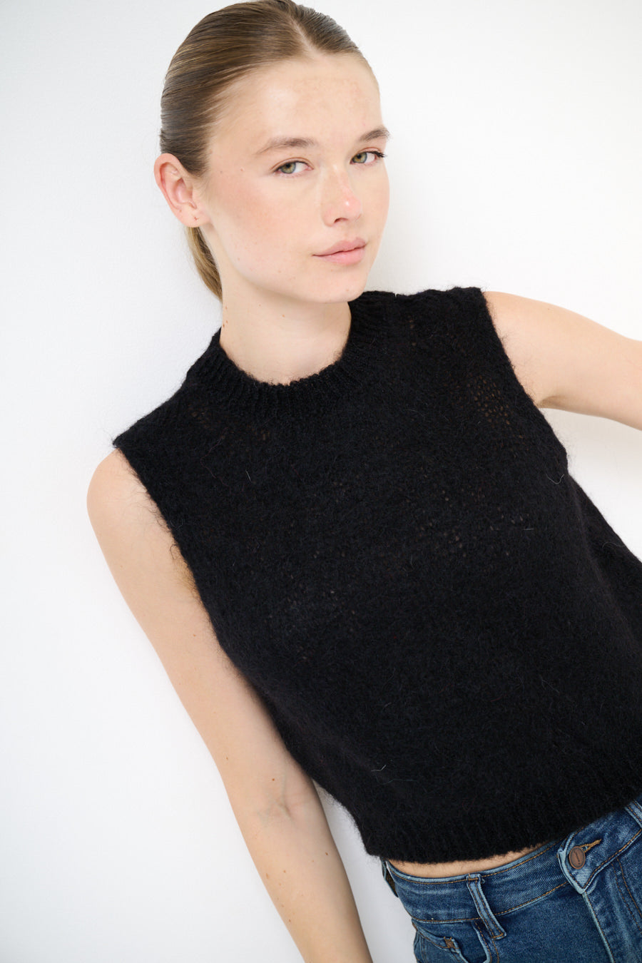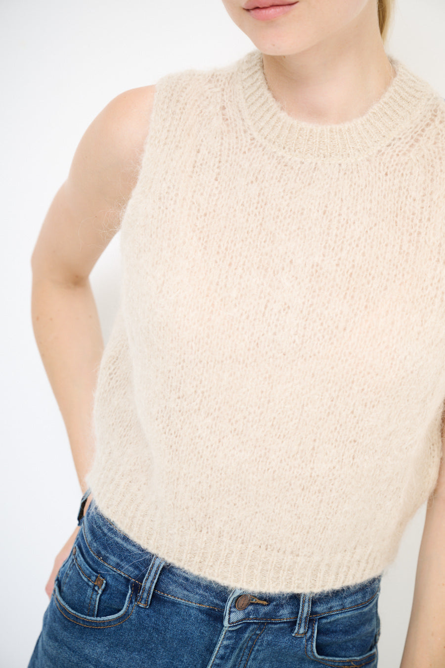 - Sleeveless cut with rib trim edges