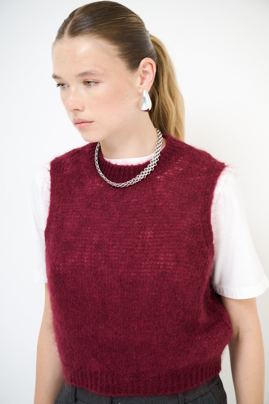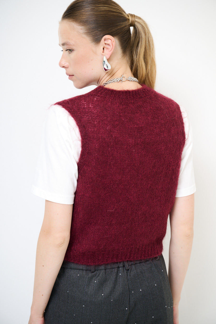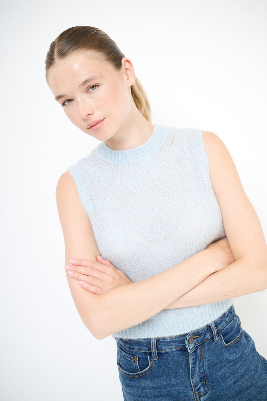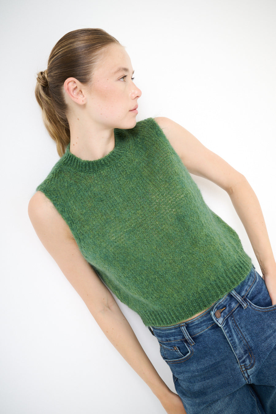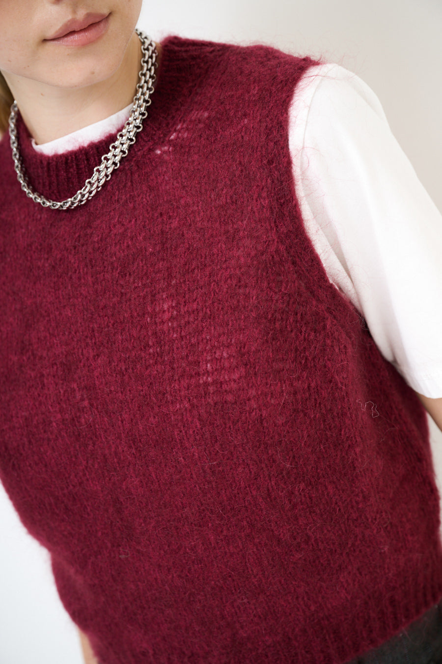 Sleeveless fuzzy knit crew neck vest wholesale