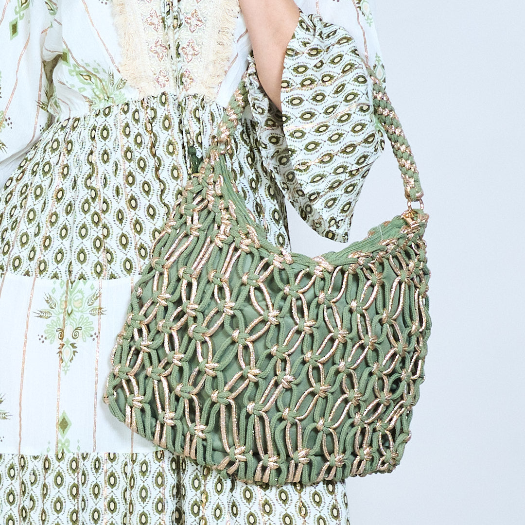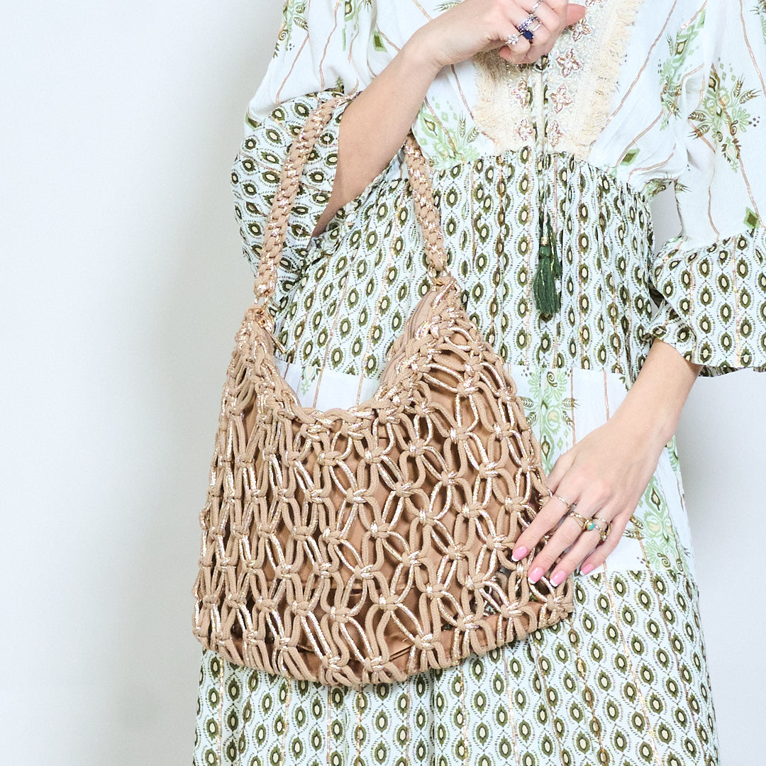 Handwoven braided fabric shoulder bag with metallic detail wholesale