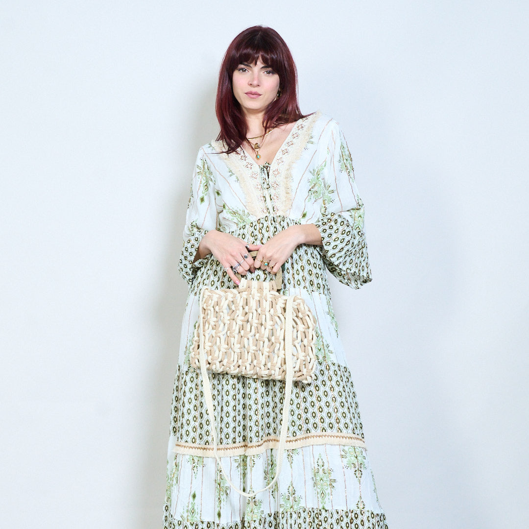Handwoven braided fabric tote with wooden handles wholesale