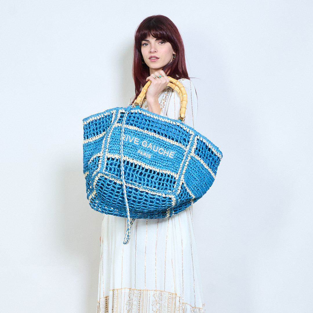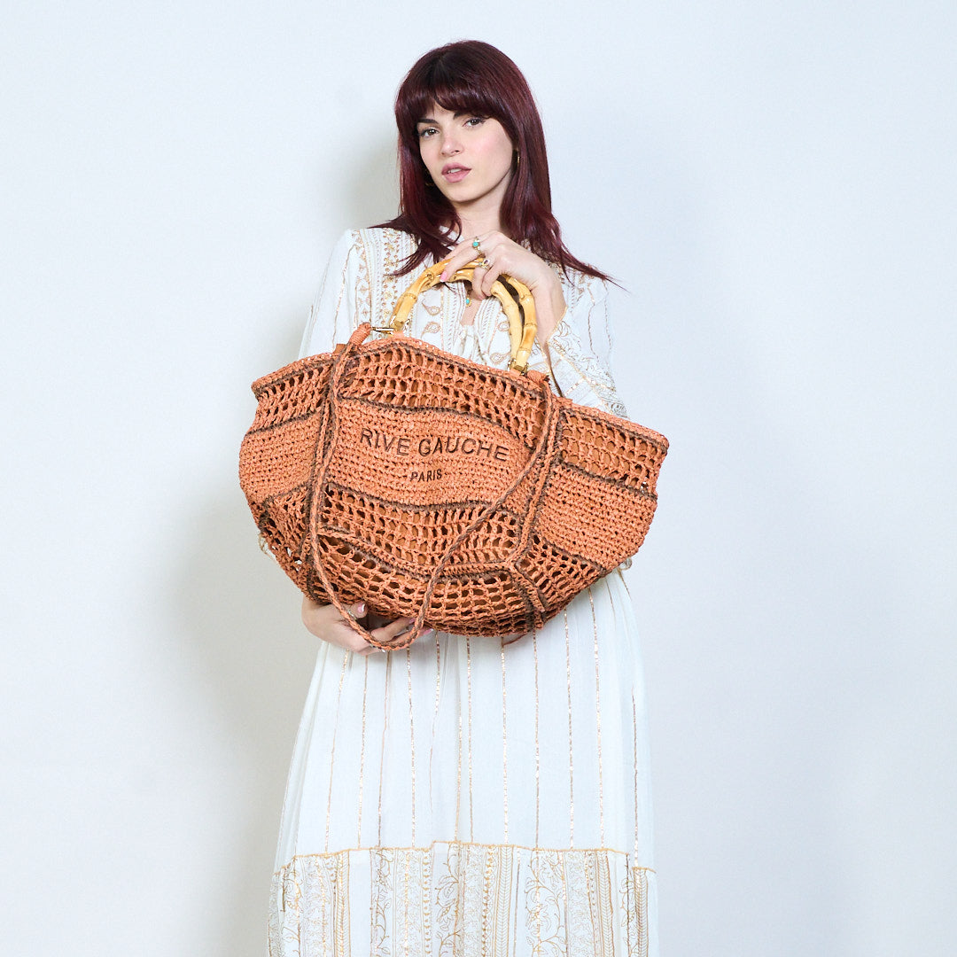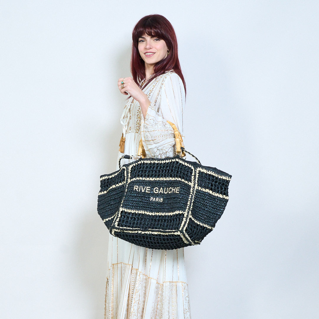 Handwoven straw tote " RIVE GAUCHE PARIS" with bamboo handles wholesale
