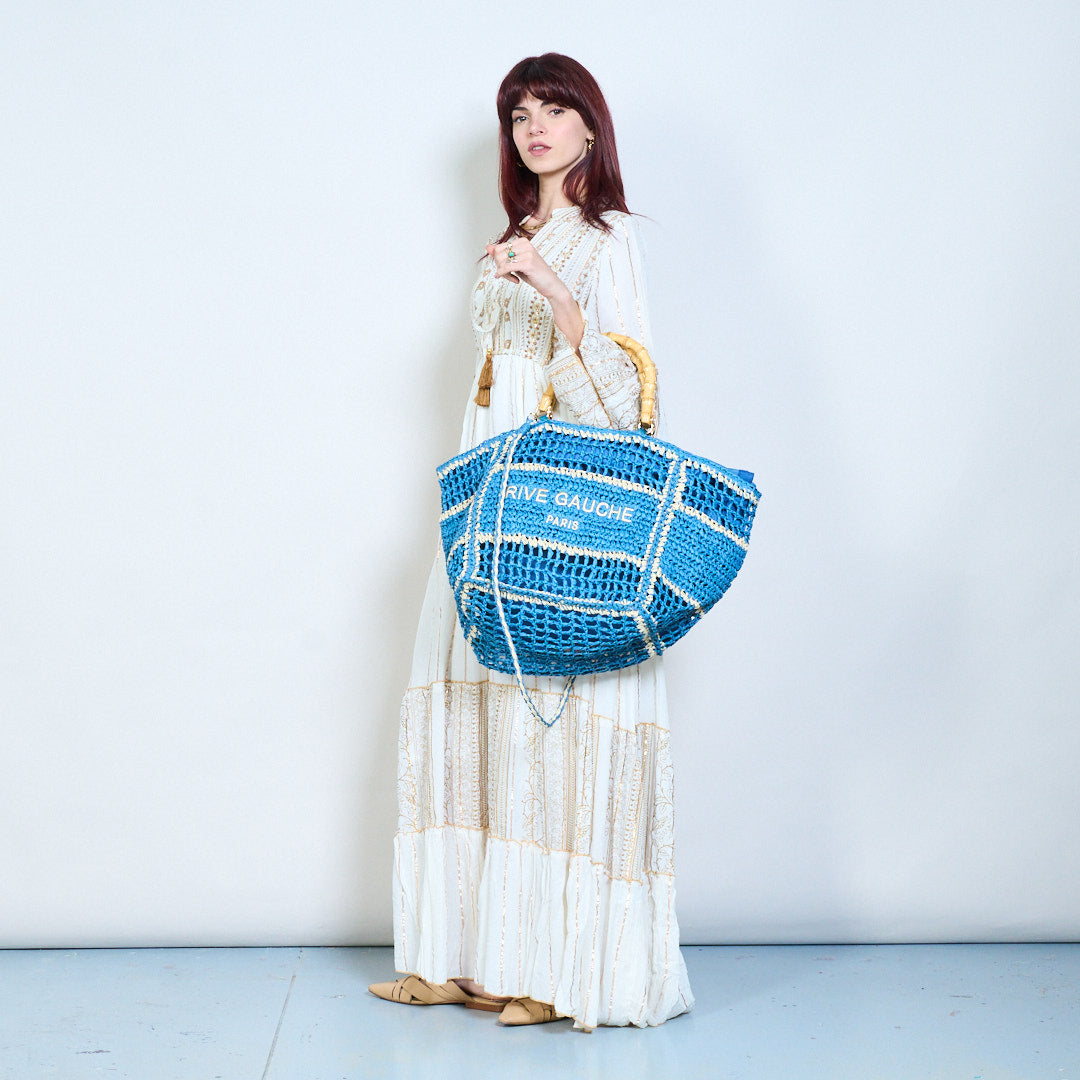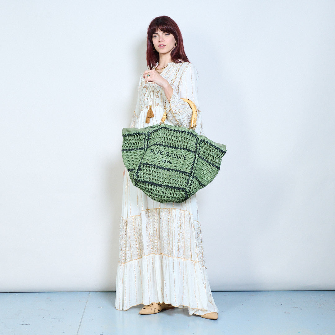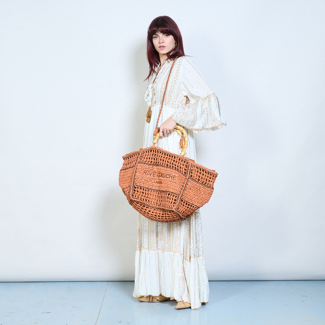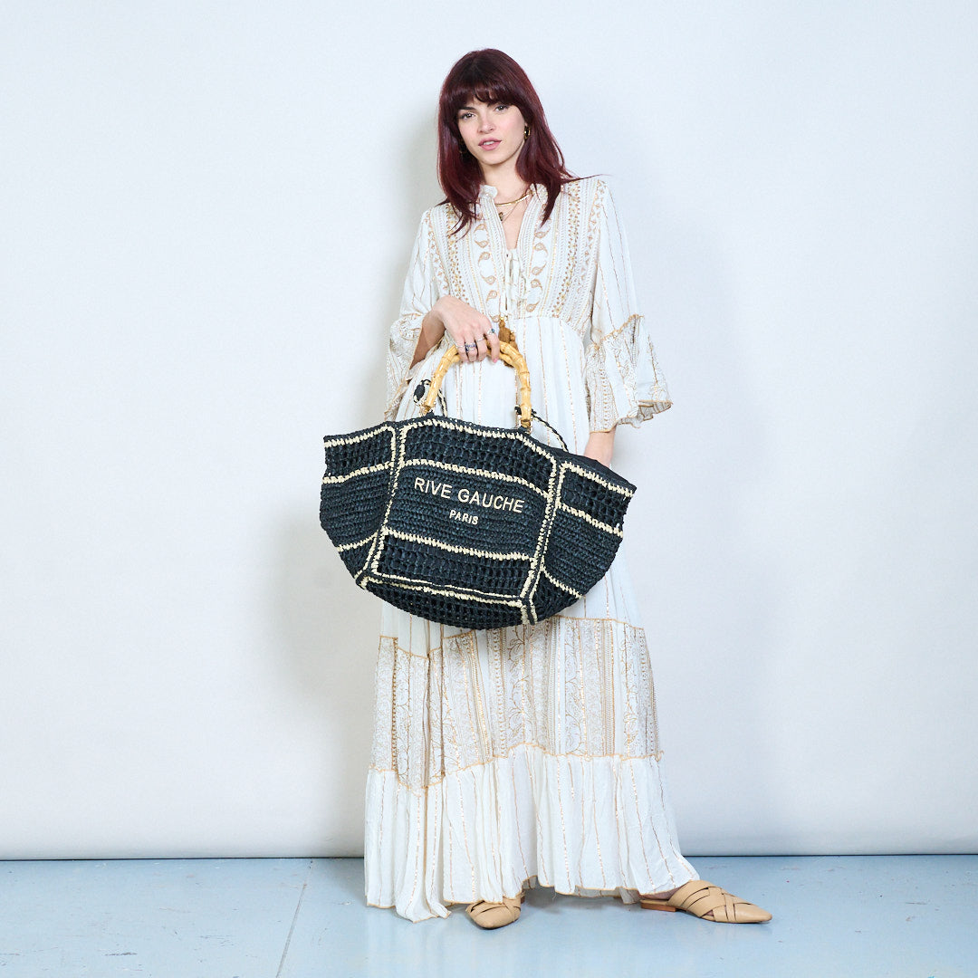 Handwoven straw tote " RIVE GAUCHE PARIS" with bamboo handles wholesale