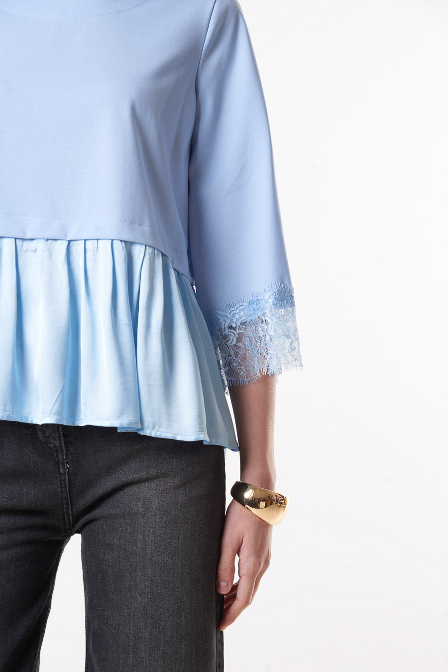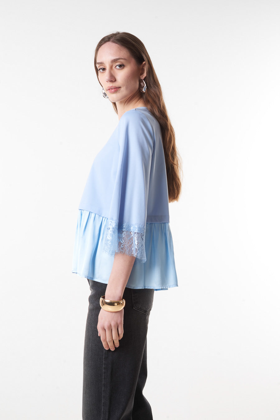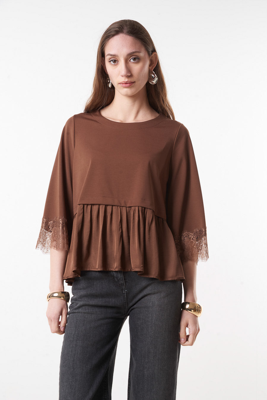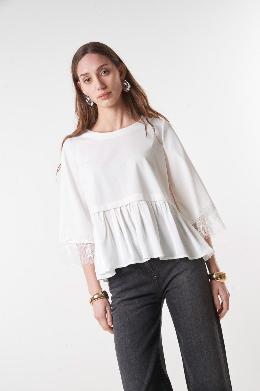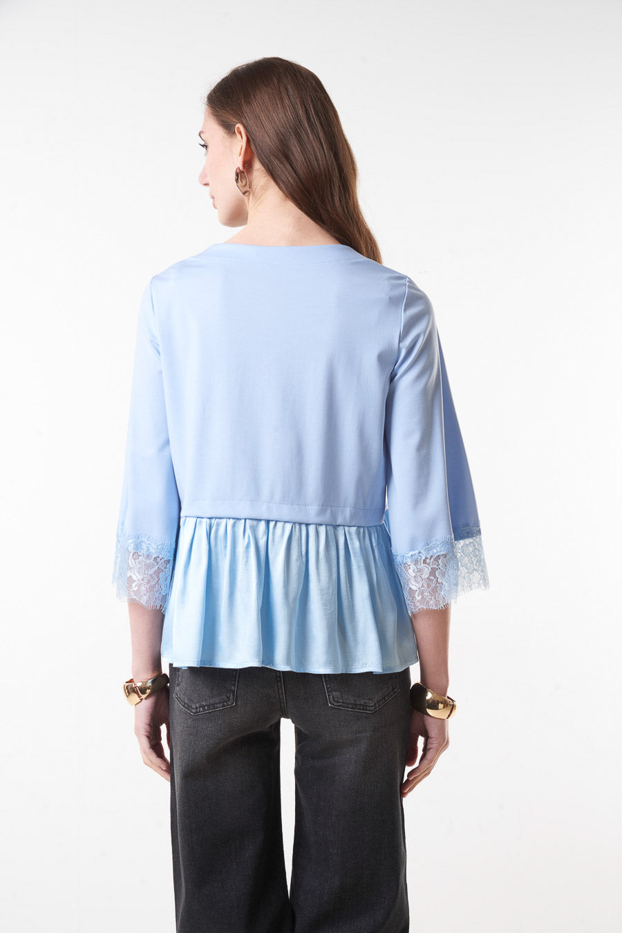Flared peplum blouse with lace sleeve detail wholesale