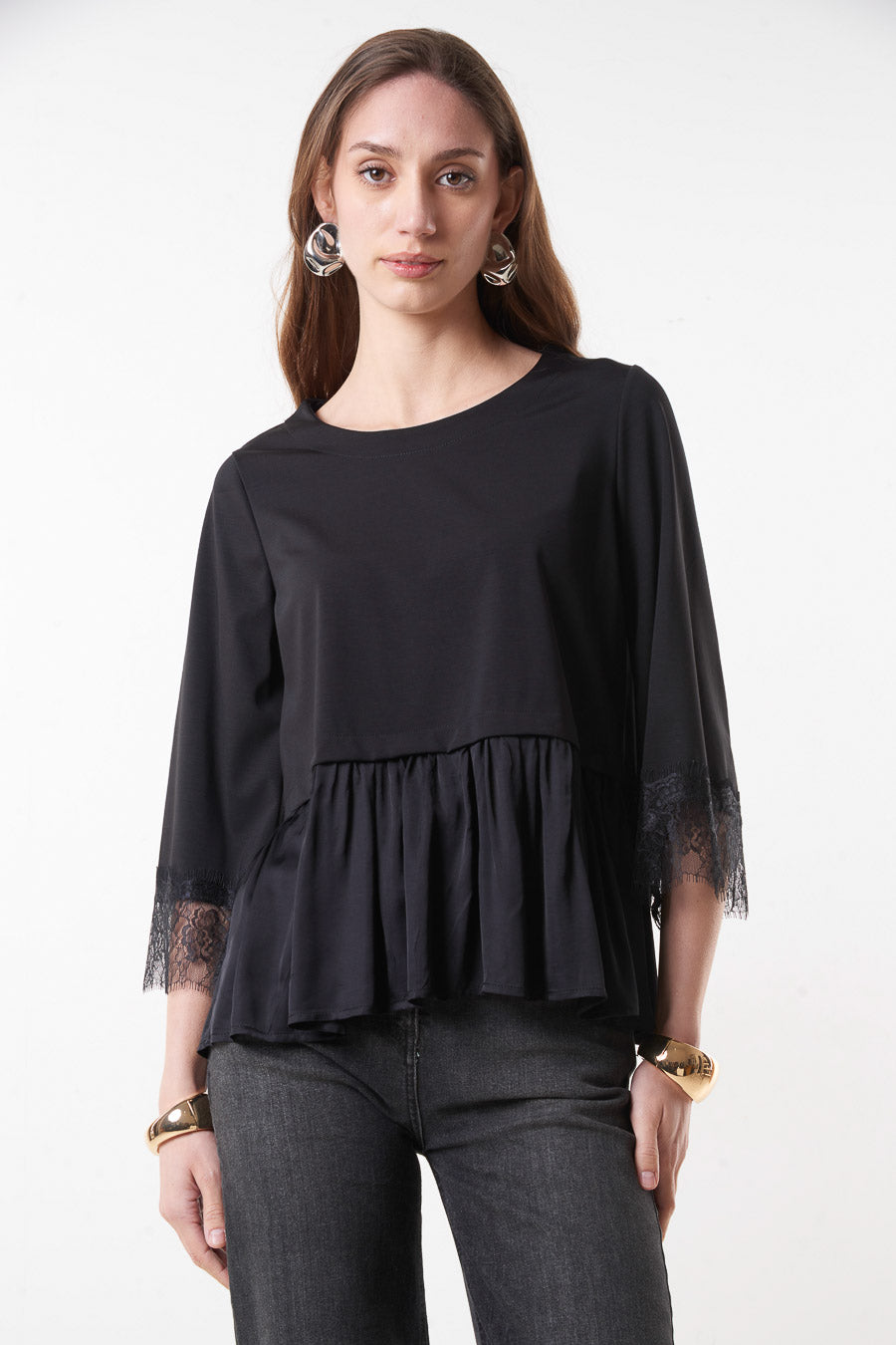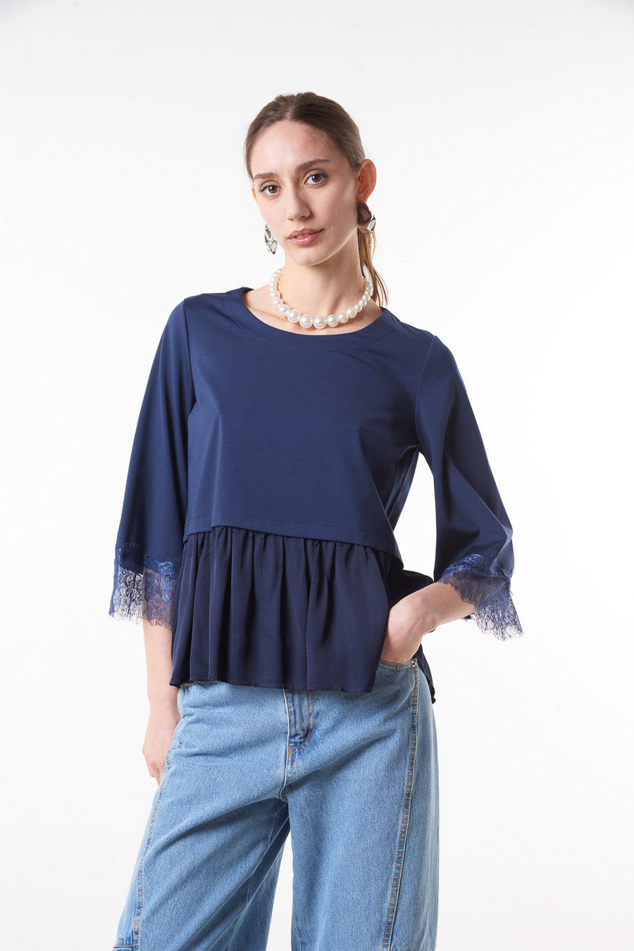 - 3/4 sleeves with delicate lace trim detail