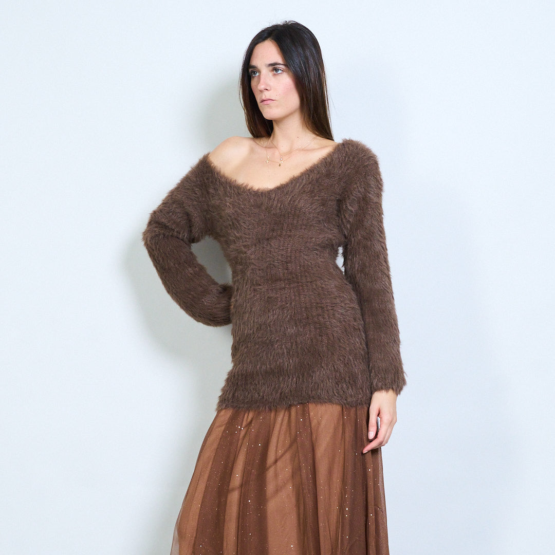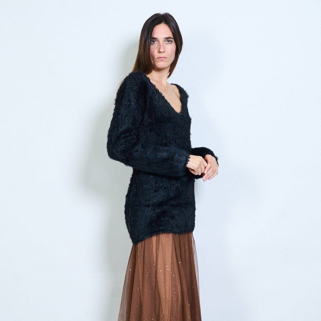 Fuzzy deep v-neck fitted longline pullover wholesale