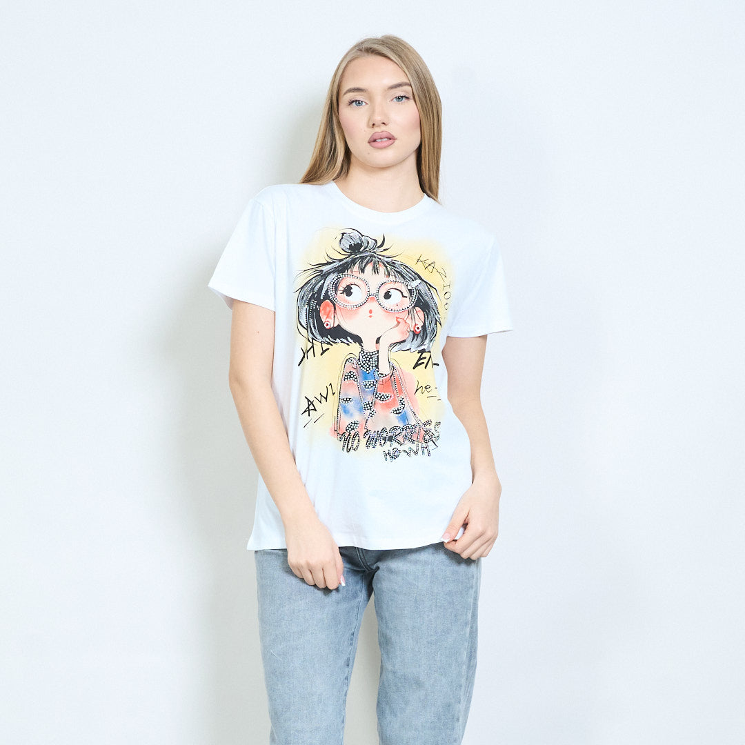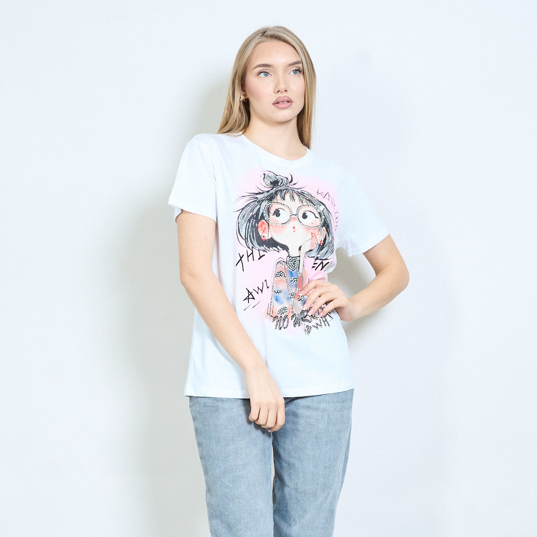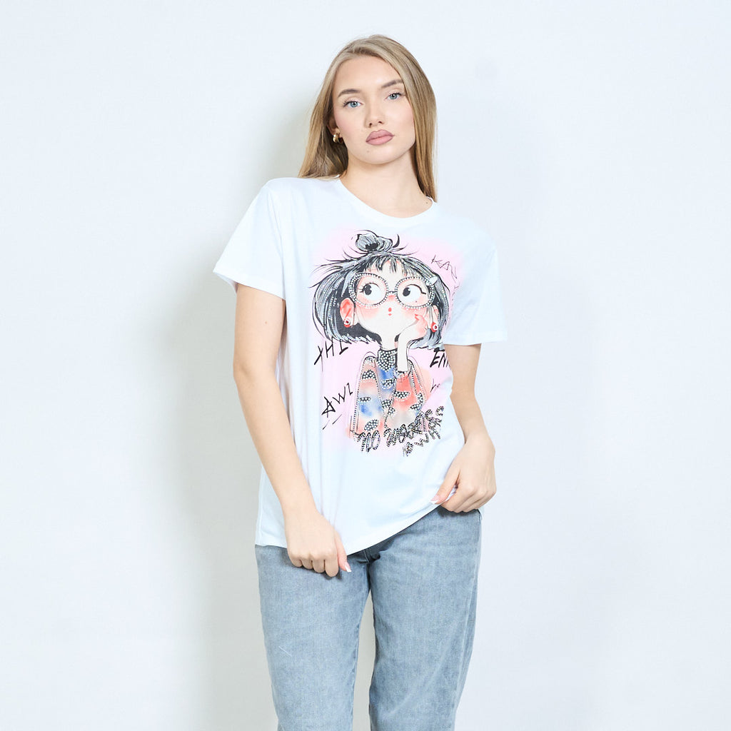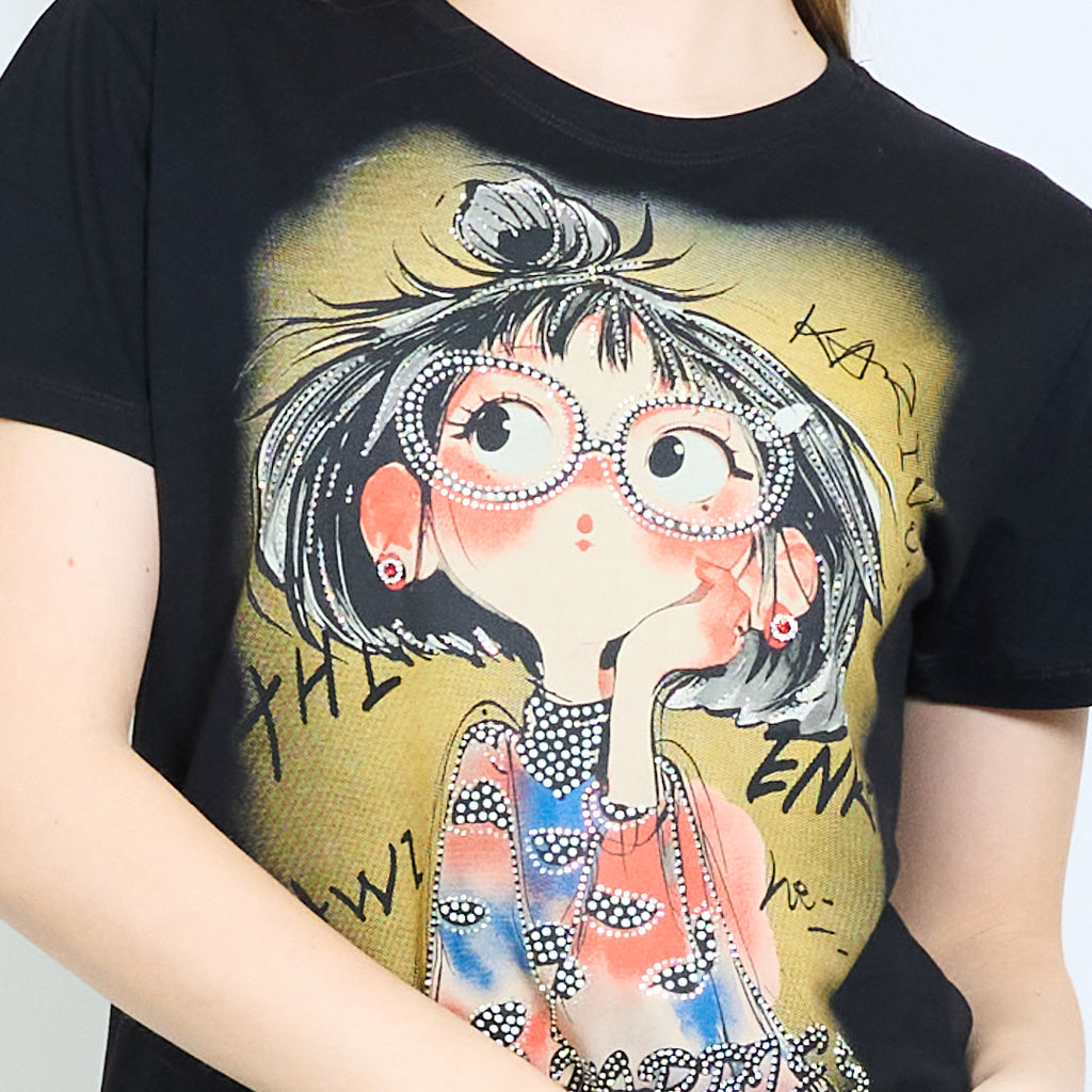 Rhinestones cartoon girl sketch graphic printed t-shirt wholesale