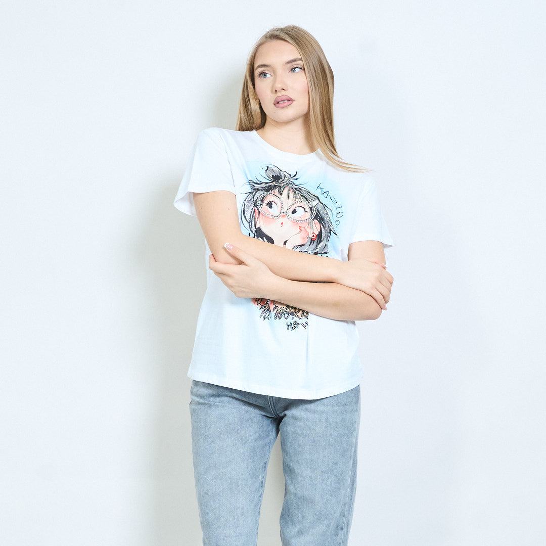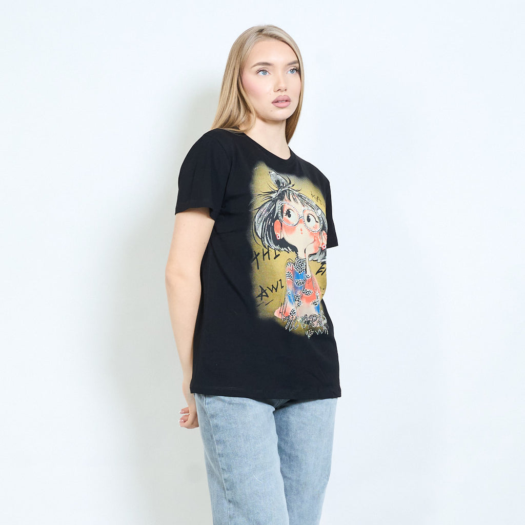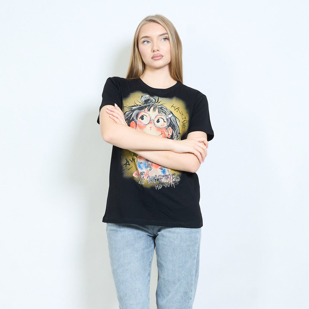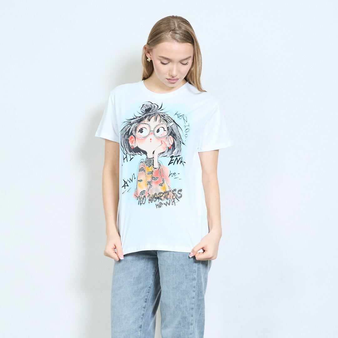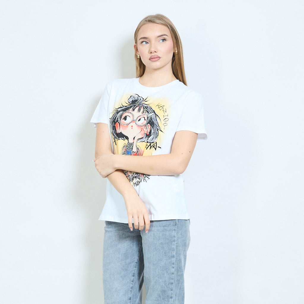 Rhinestones cartoon girl sketch graphic printed t-shirt wholesale