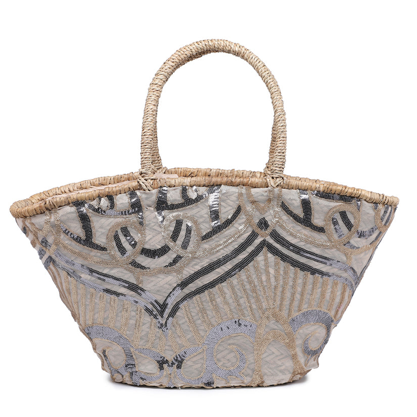Handwoven straw tote with abstract sequin mesh overlay wholesale