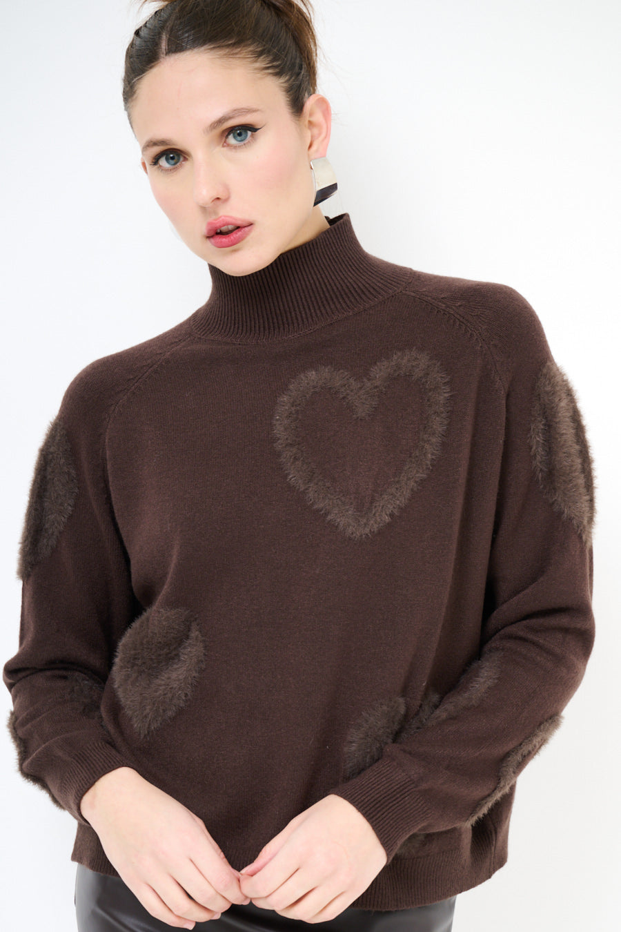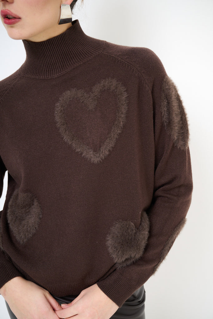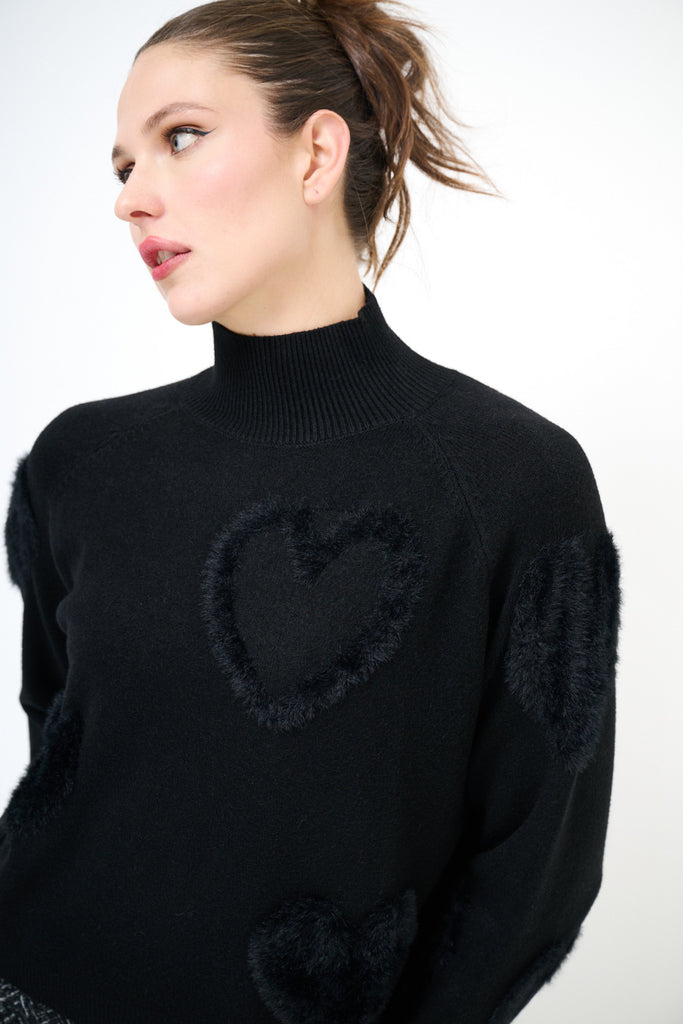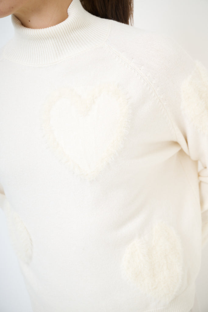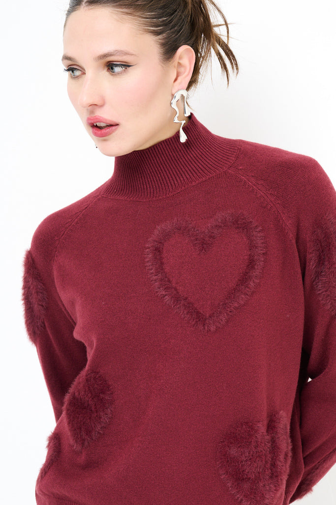 Fuzzy heart patterned mock-neck pullover sweater wholesale