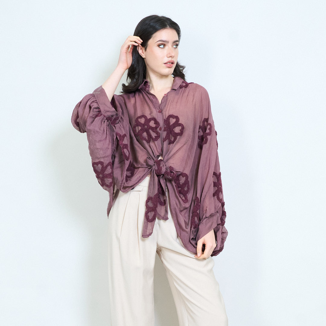 Textured floral applique tie front collared relaxed blouse wholesale