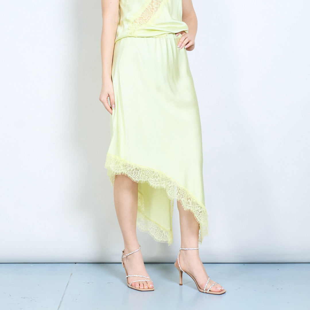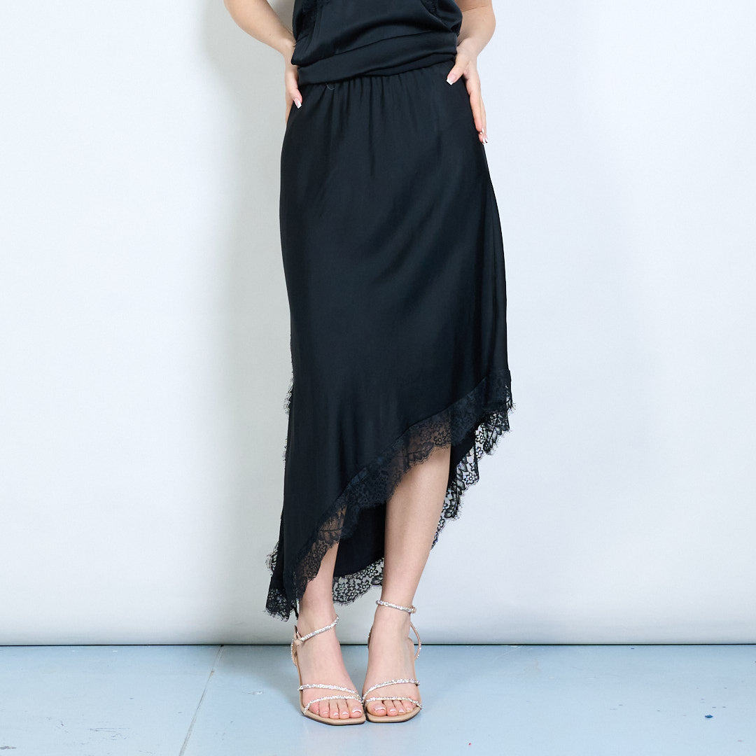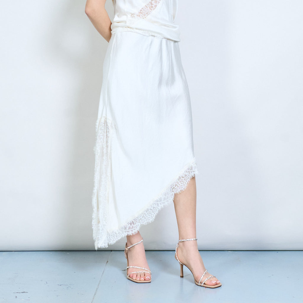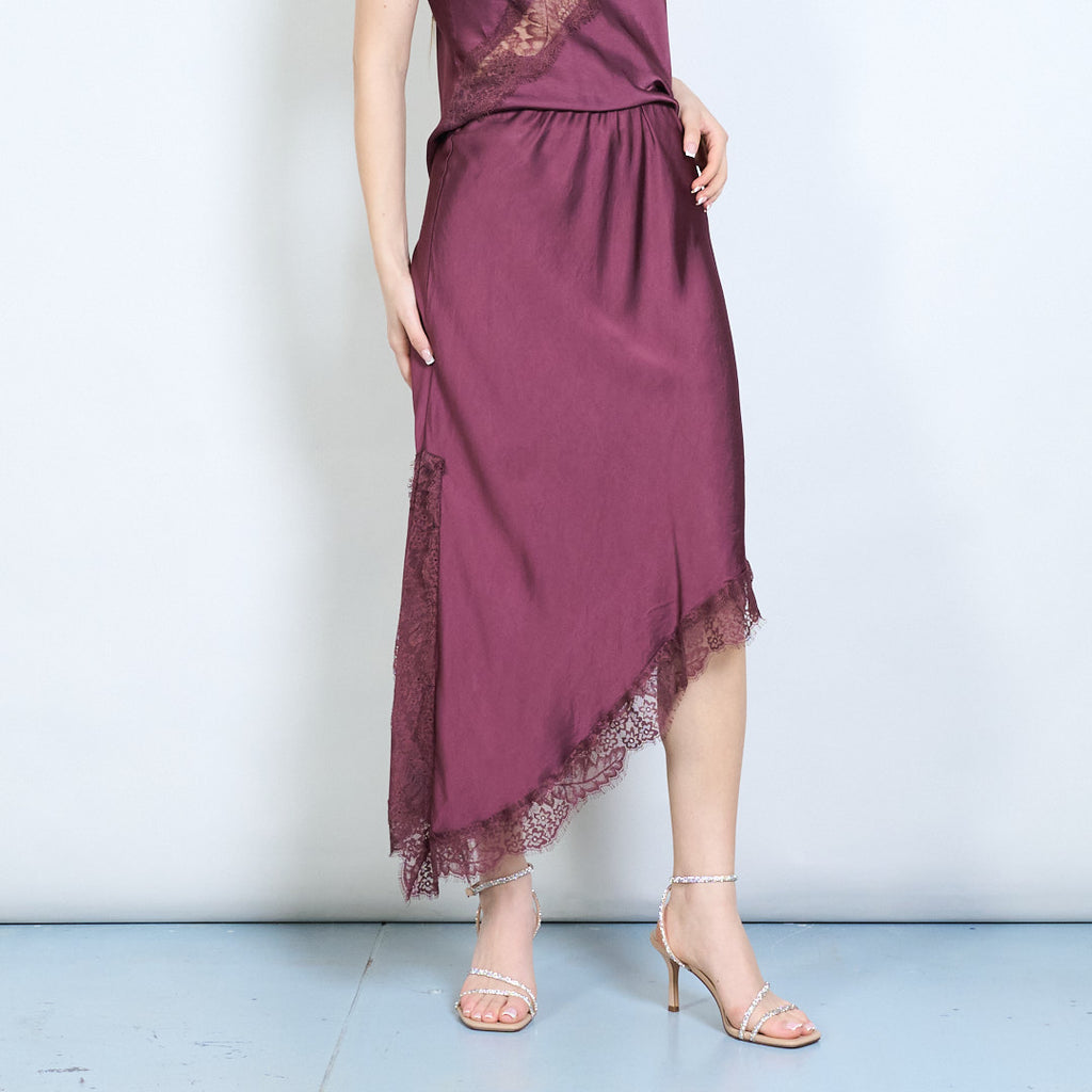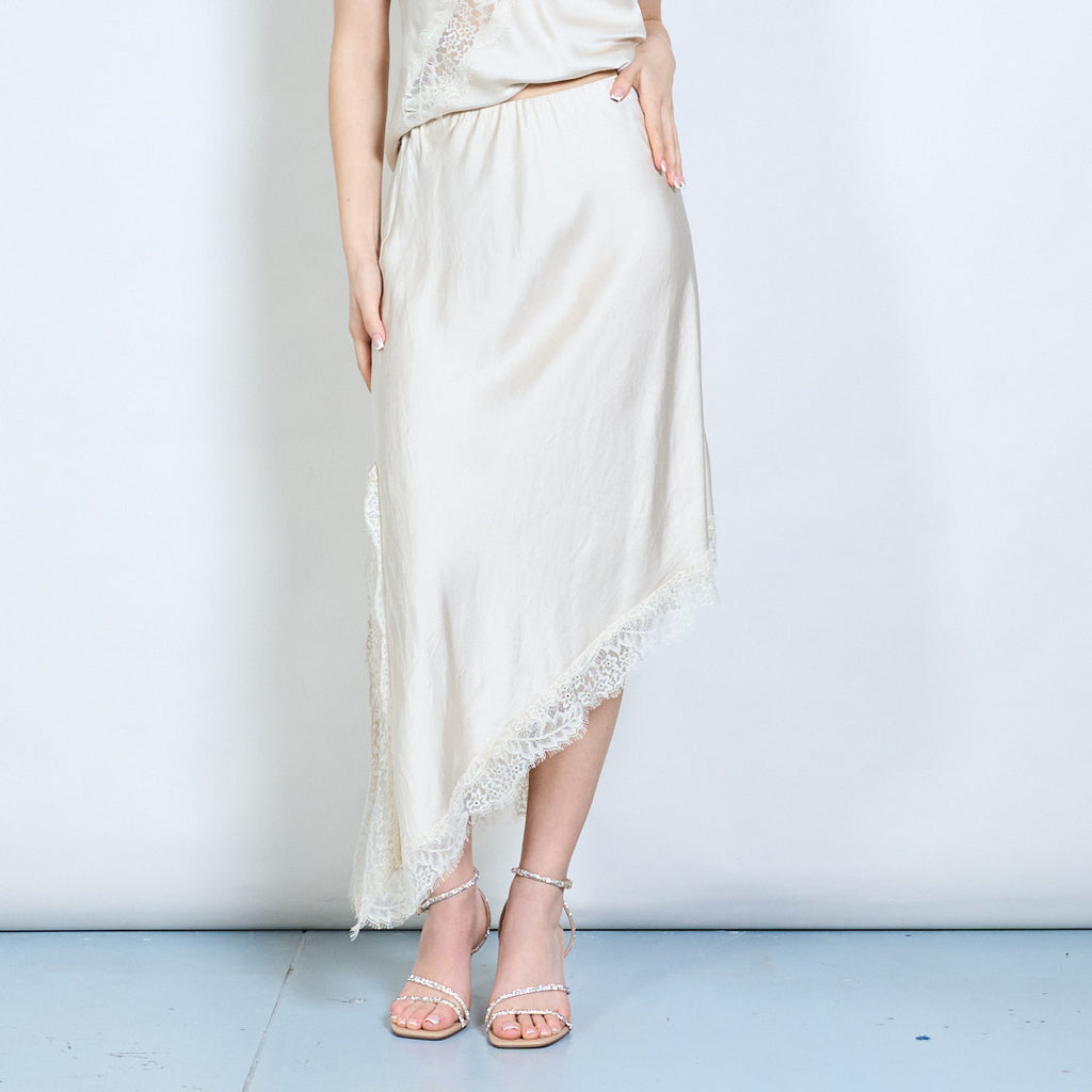 Lace-trim asymmetric satin-look midi skirt wholesale