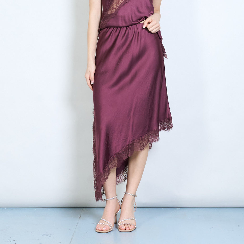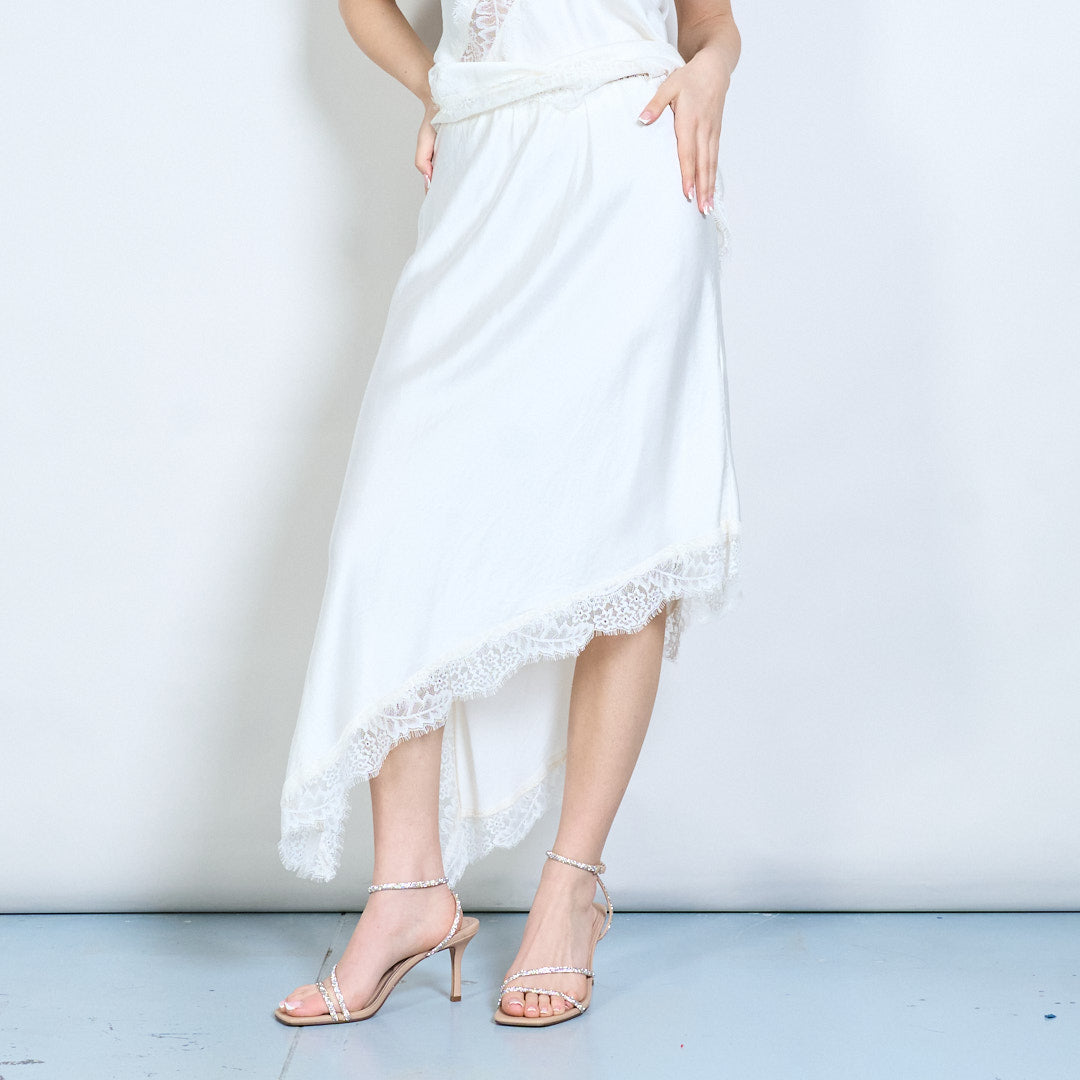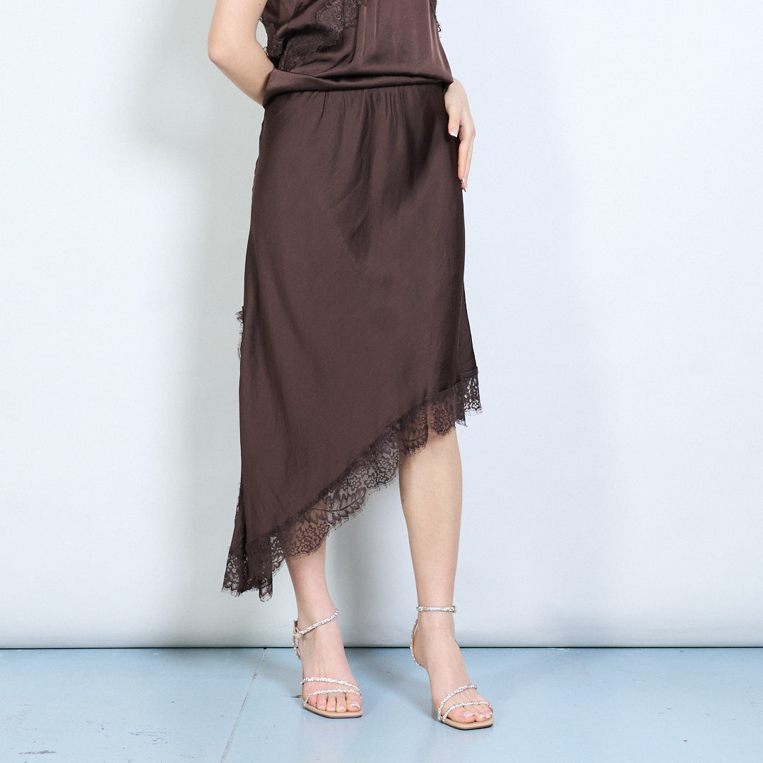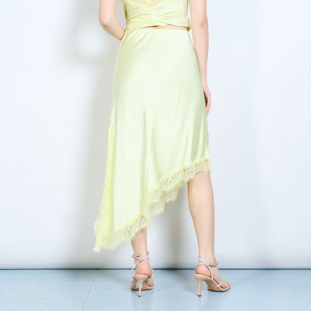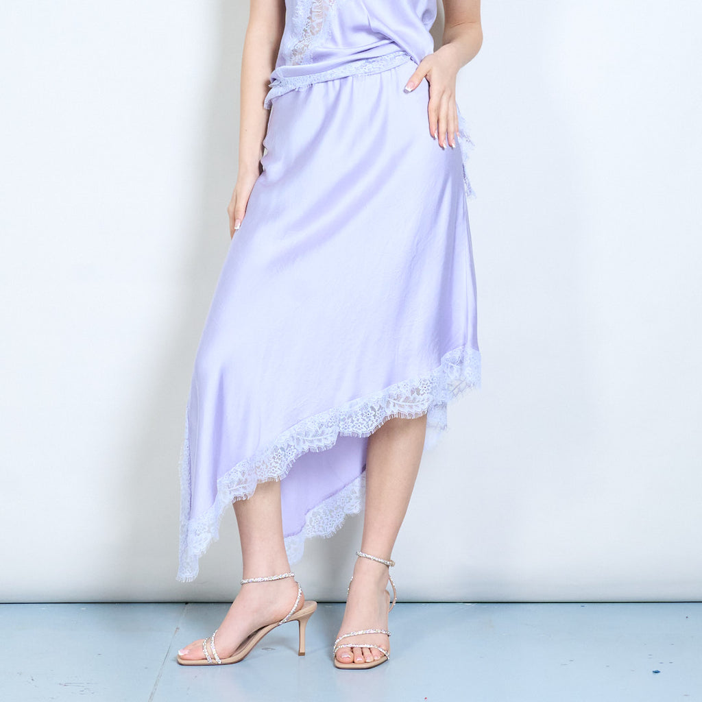 Lace-trim asymmetric satin-look midi skirt wholesale
