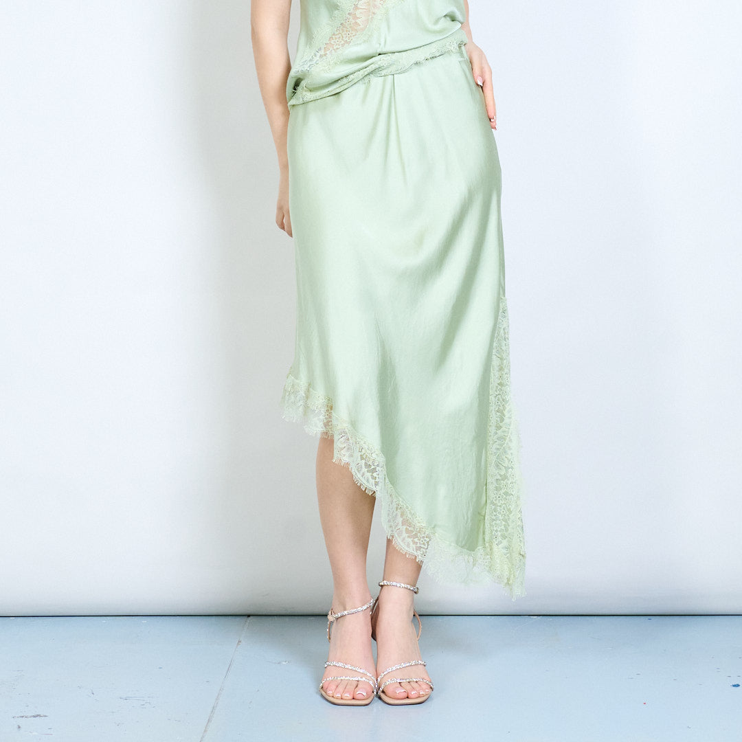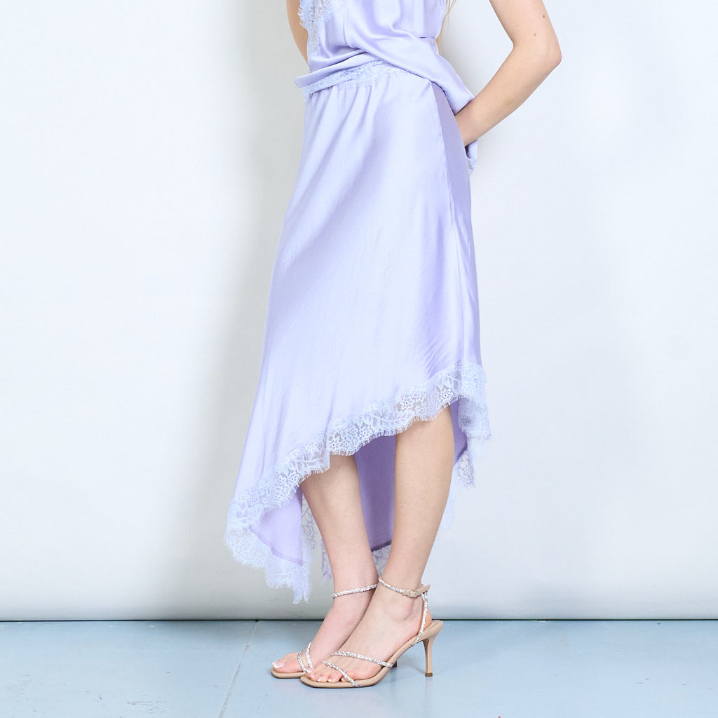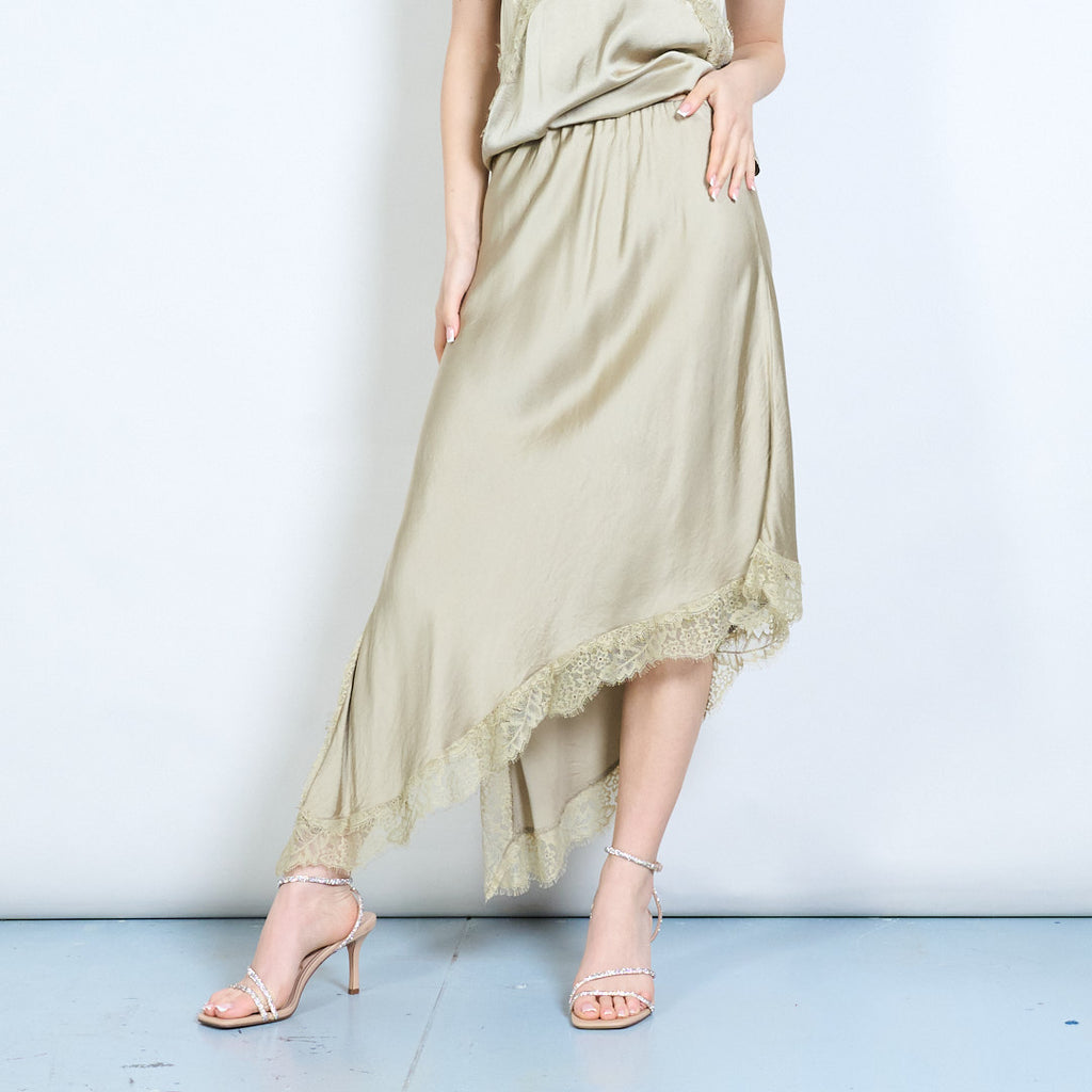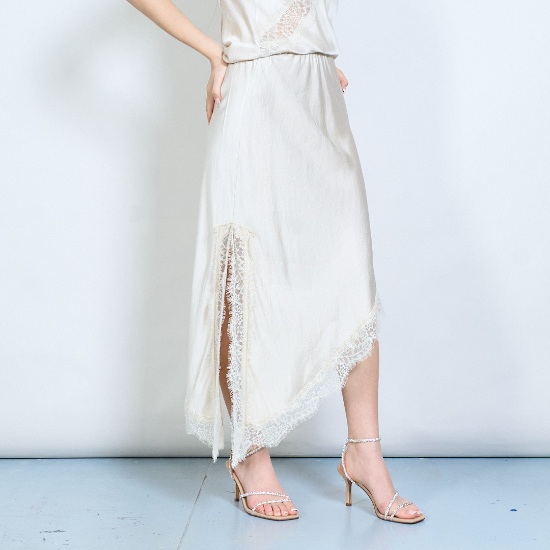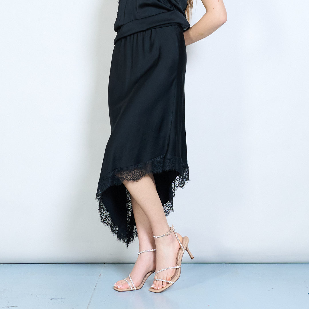Lace-trim asymmetric satin-look midi skirt wholesale