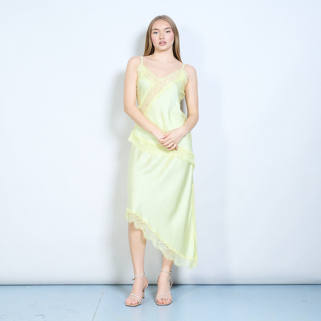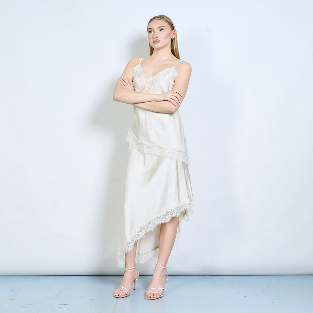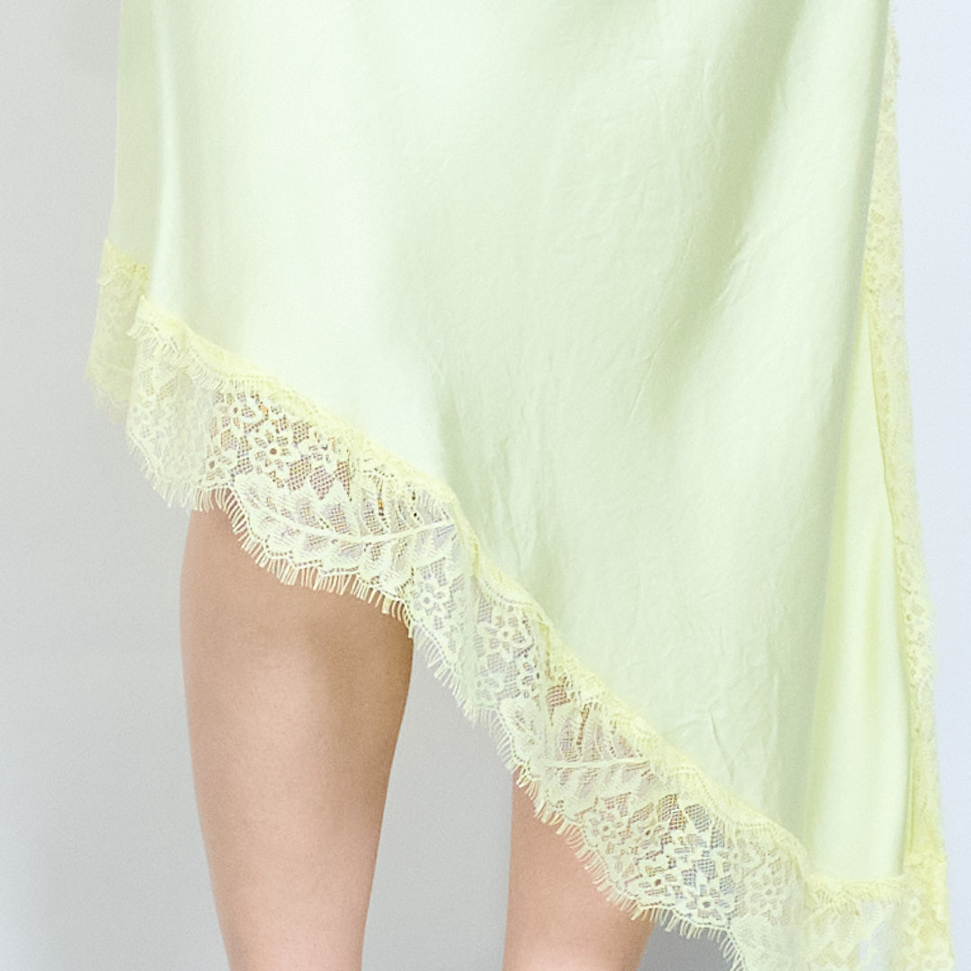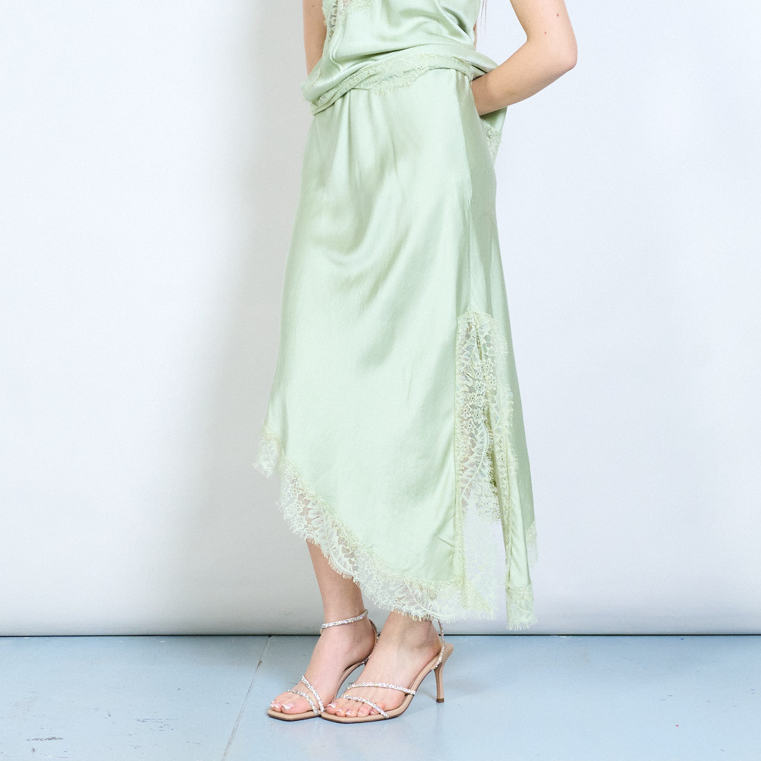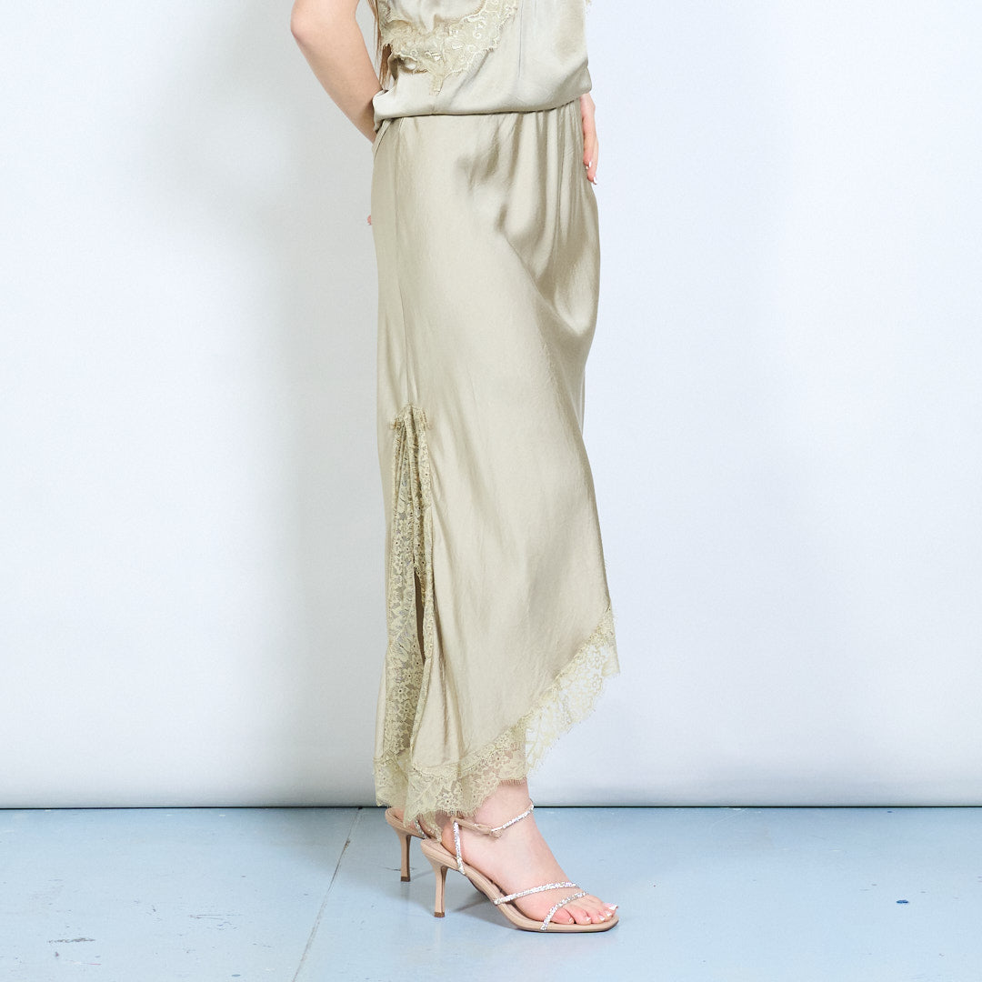 Lace-trim asymmetric satin-look midi skirt wholesale