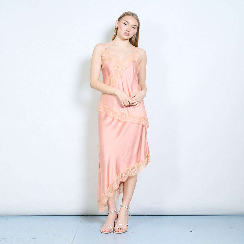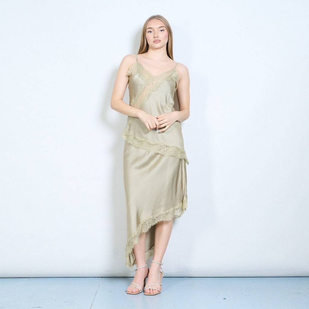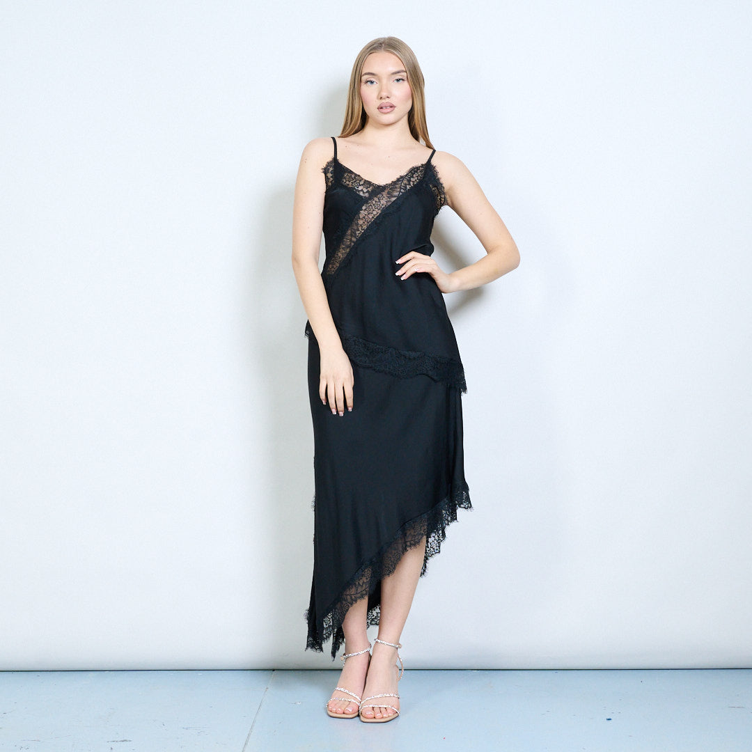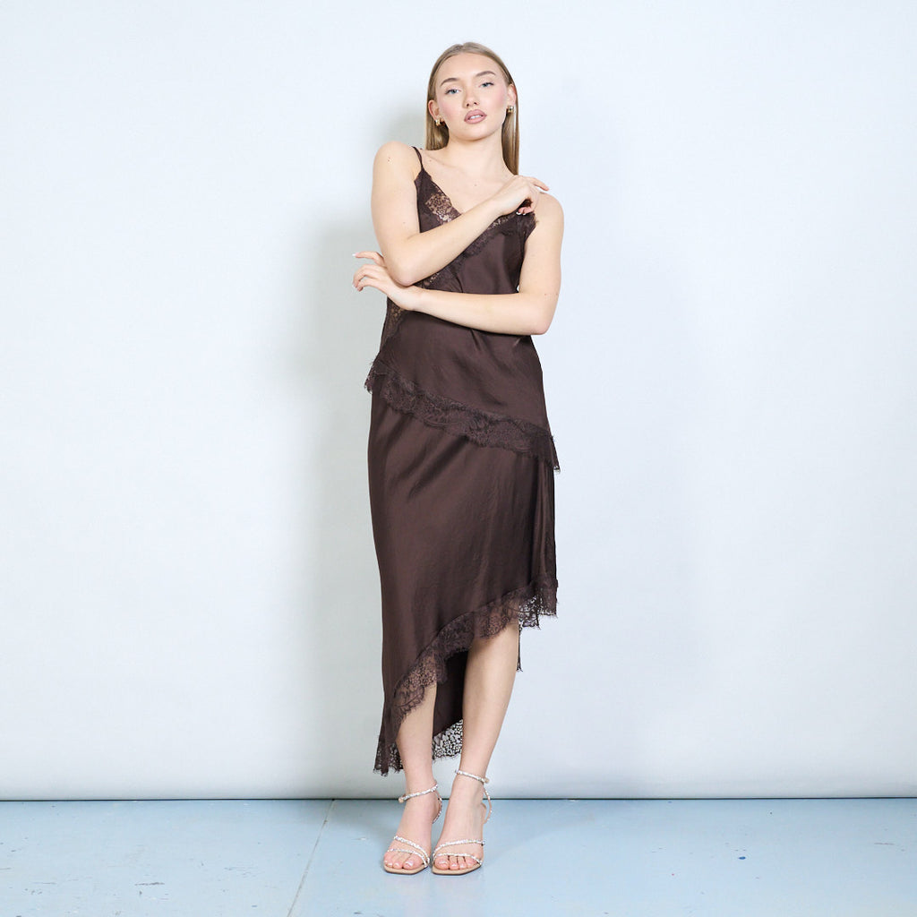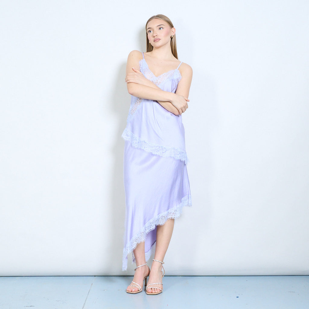 Lace-trim asymmetric satin-look midi skirt wholesale