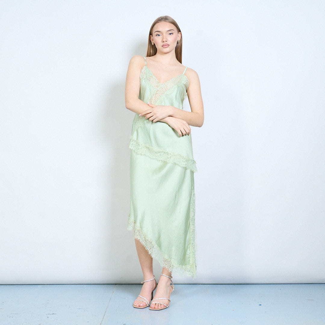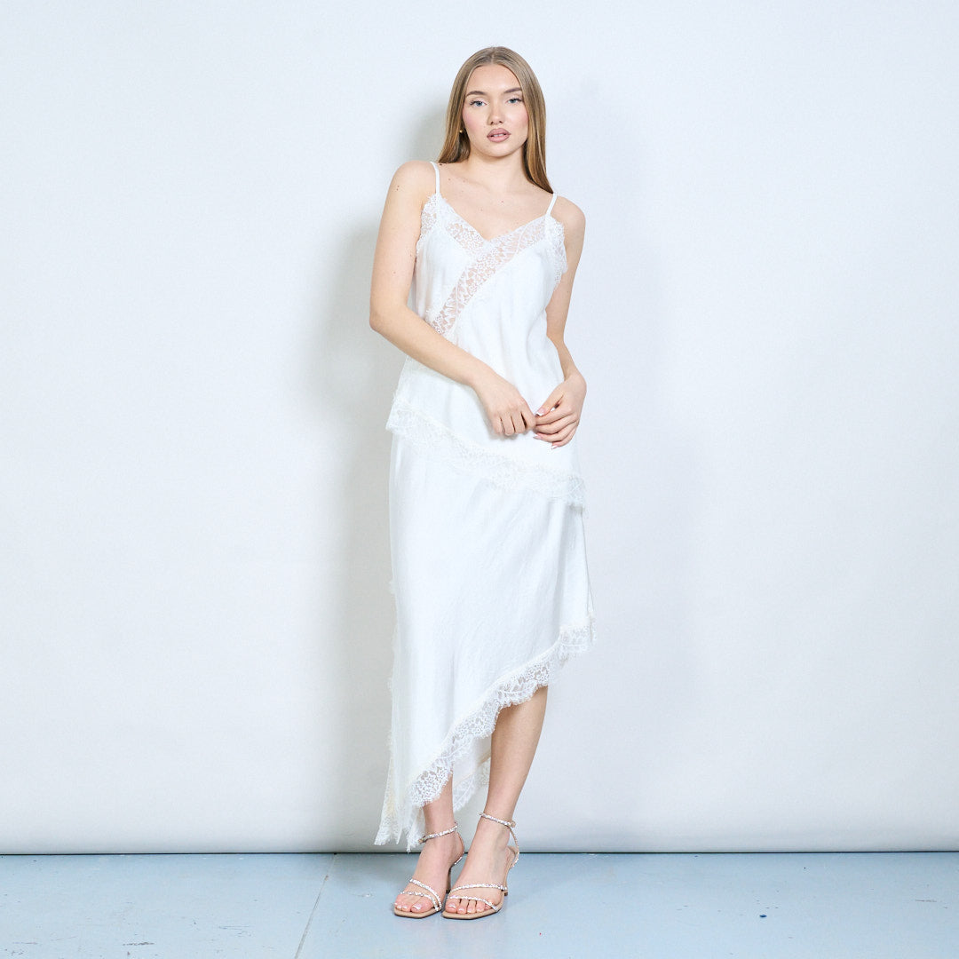- Delicate lace trim placed along the hem for a refined romantic touch