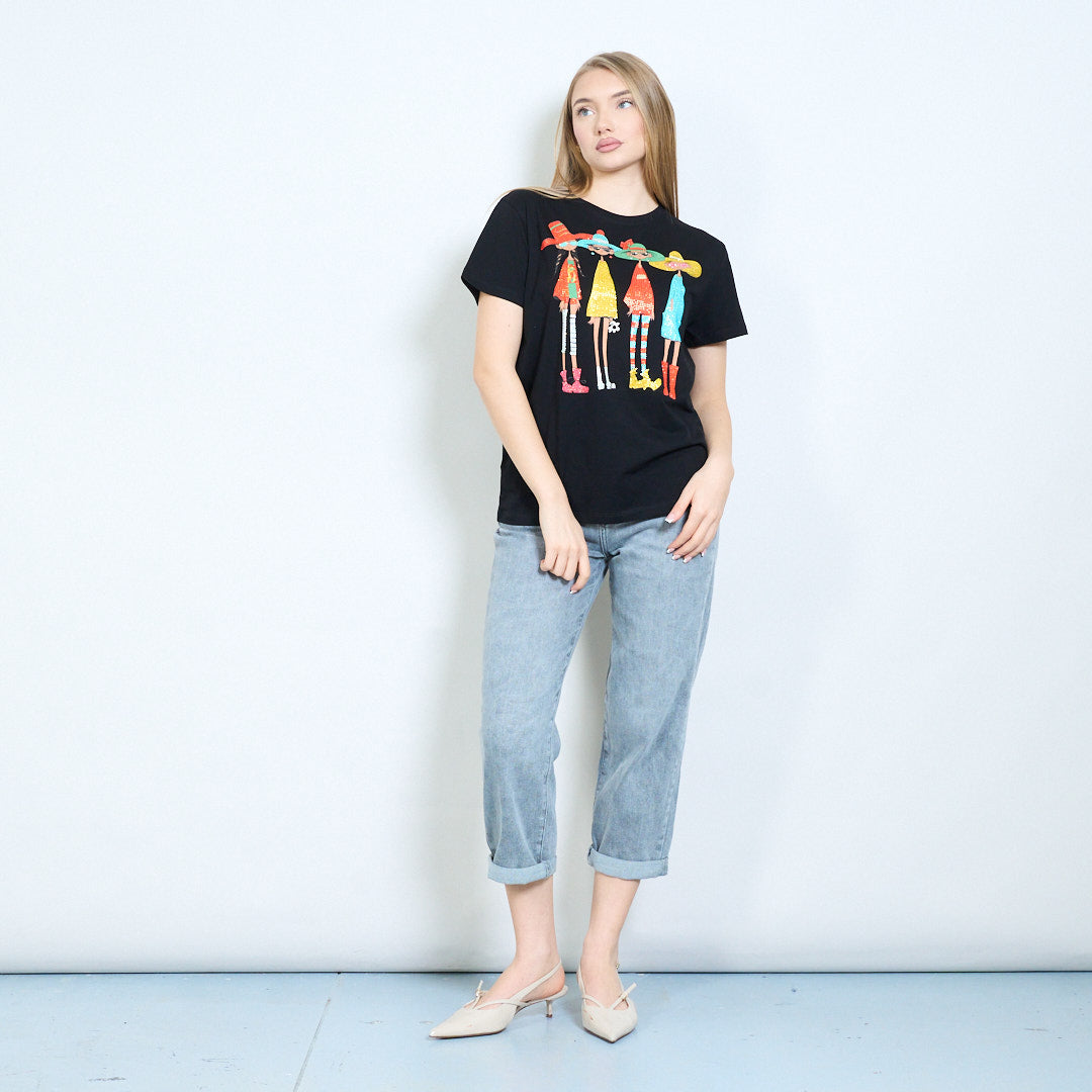 - Decorated with a playful cartoon-girls graphic featuring vibrant outfits and wide-brim hats