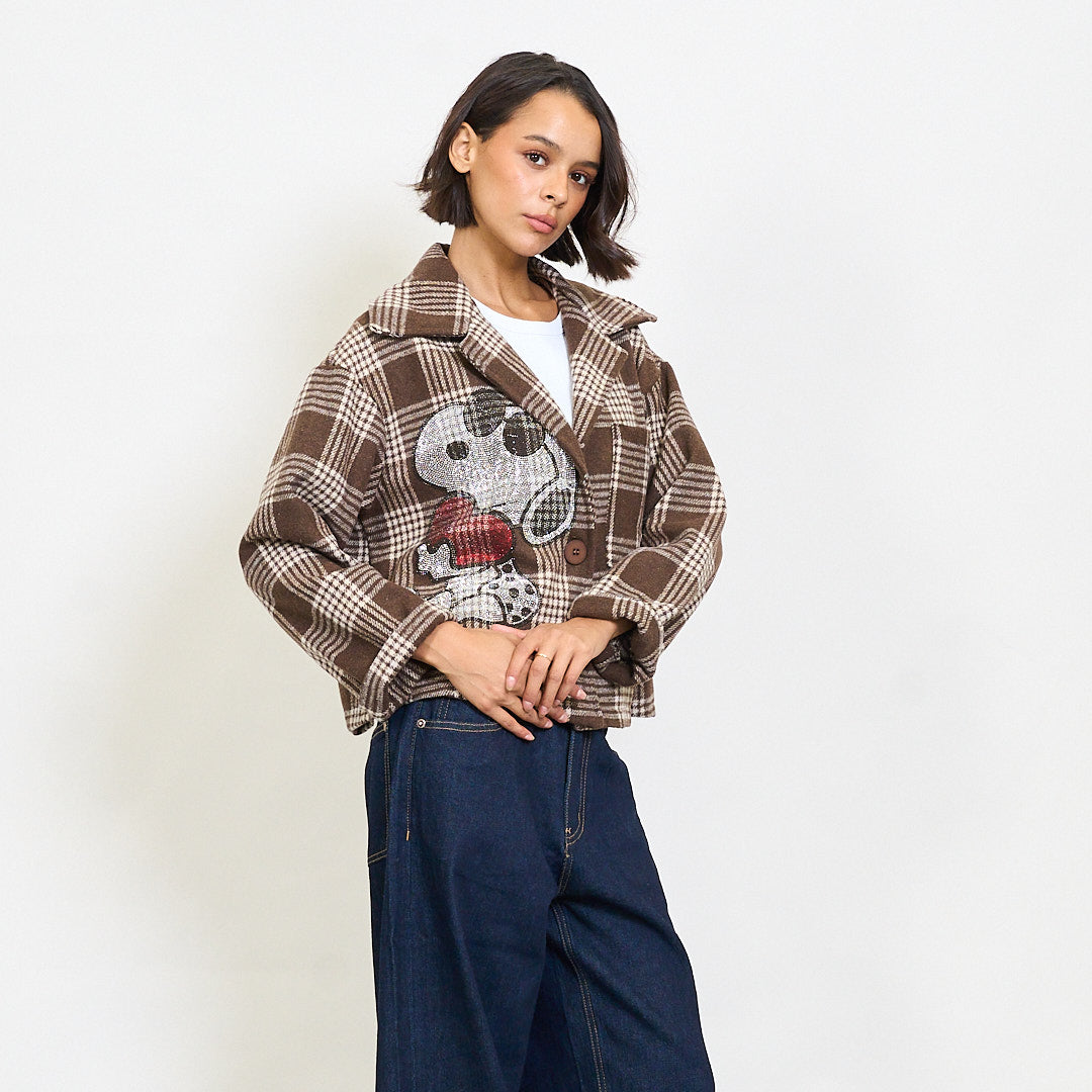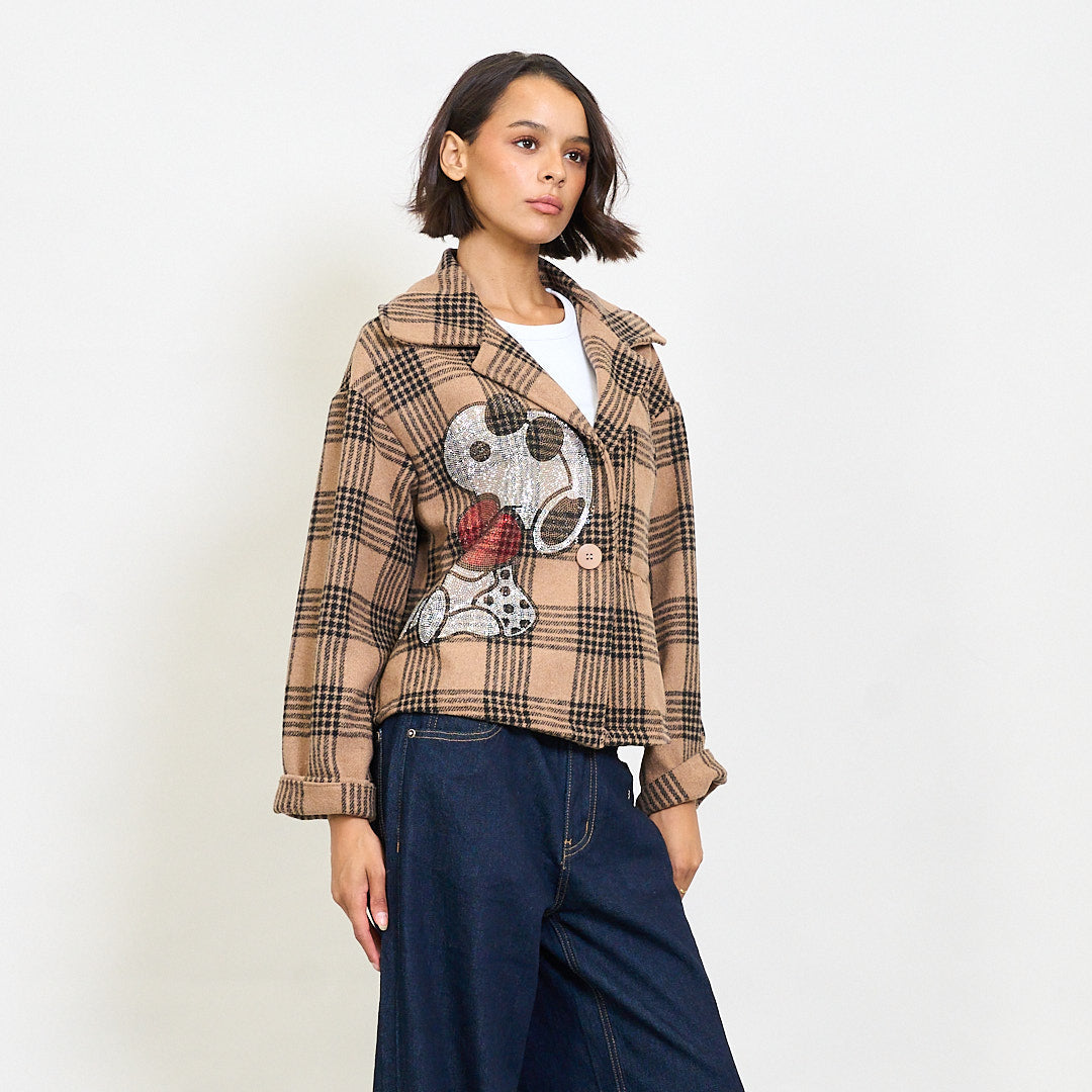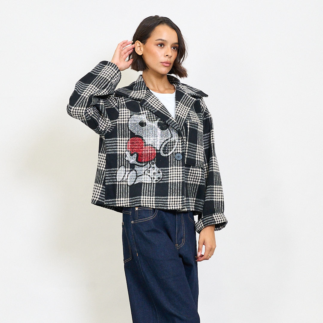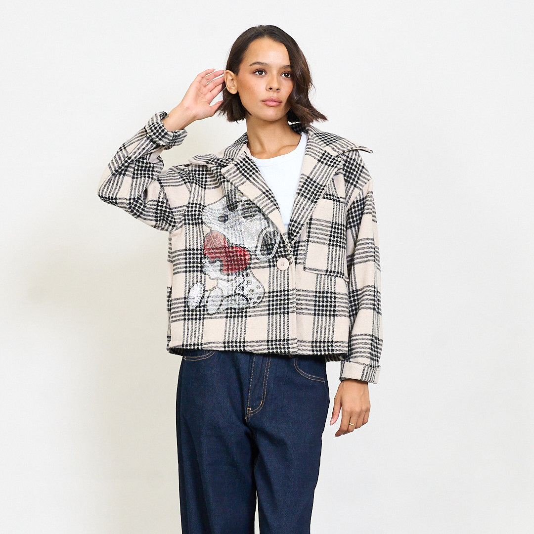 - Cropped blazer with a bold plaid pattern and playful cartoon embroidery