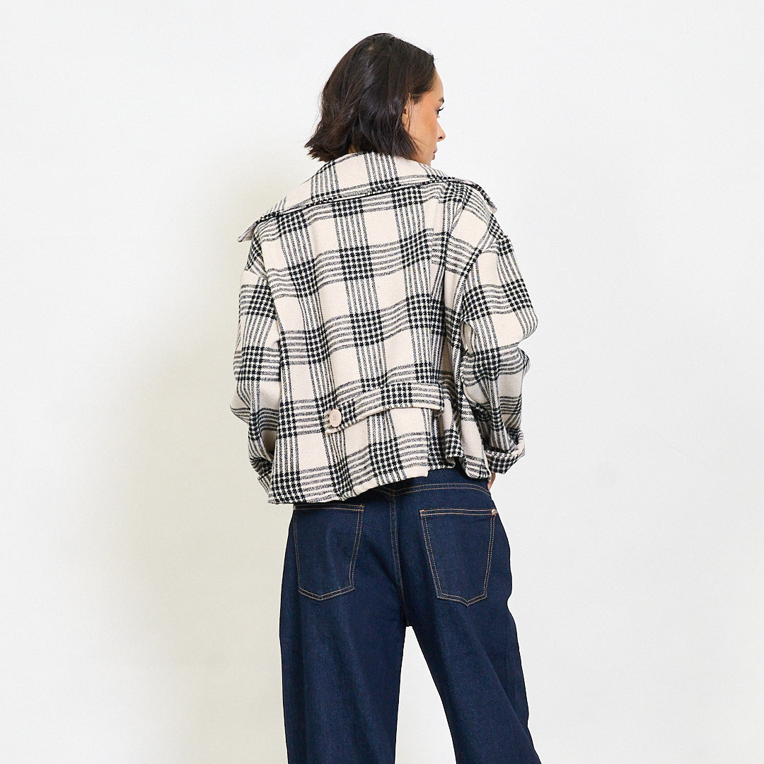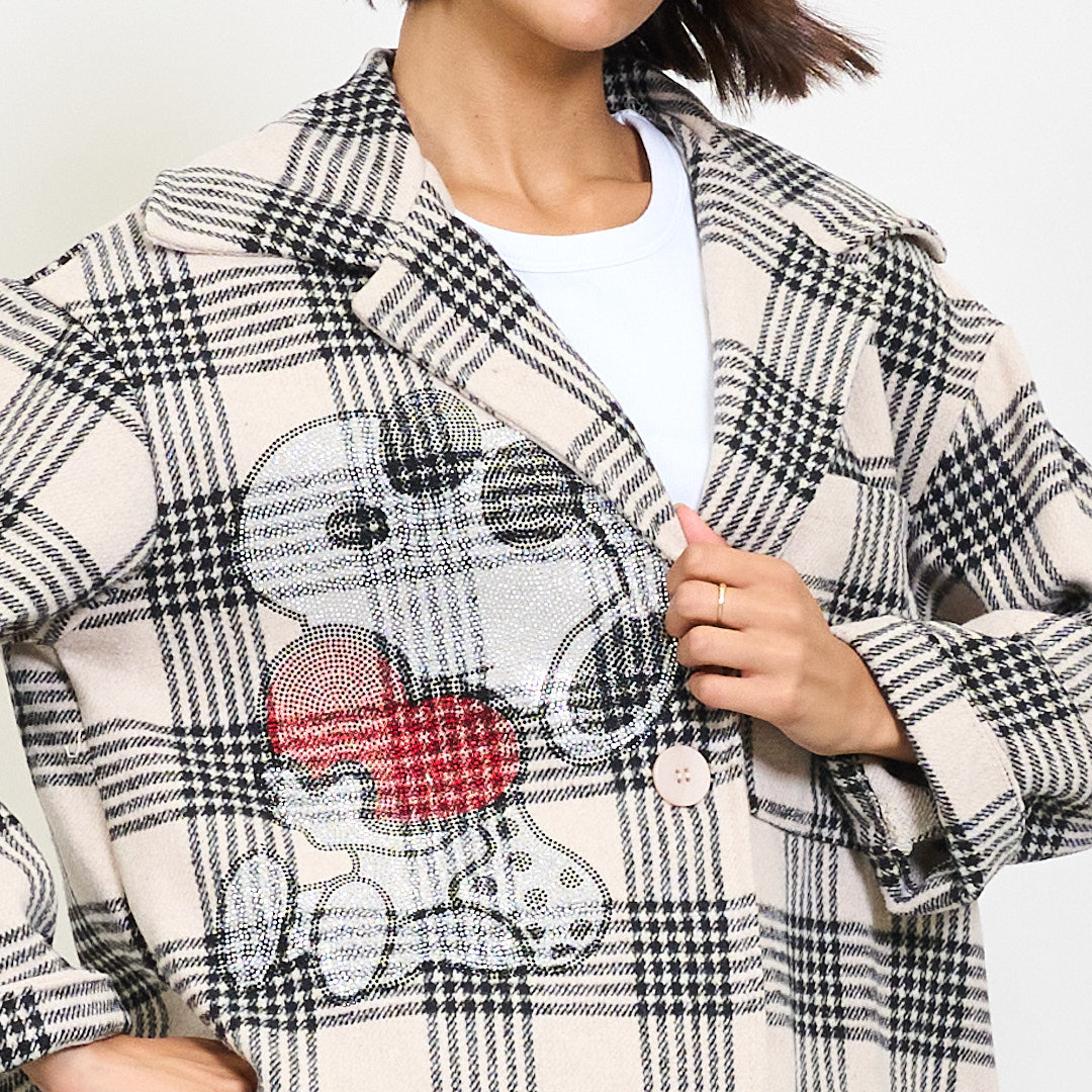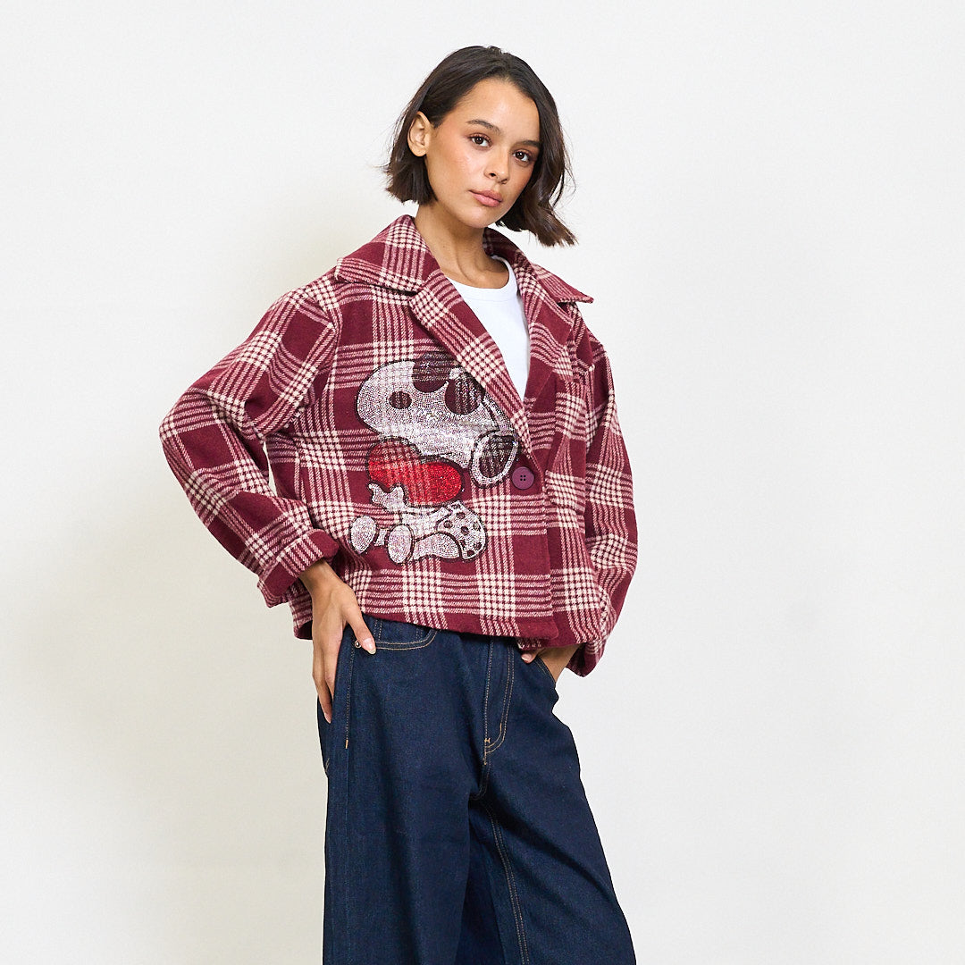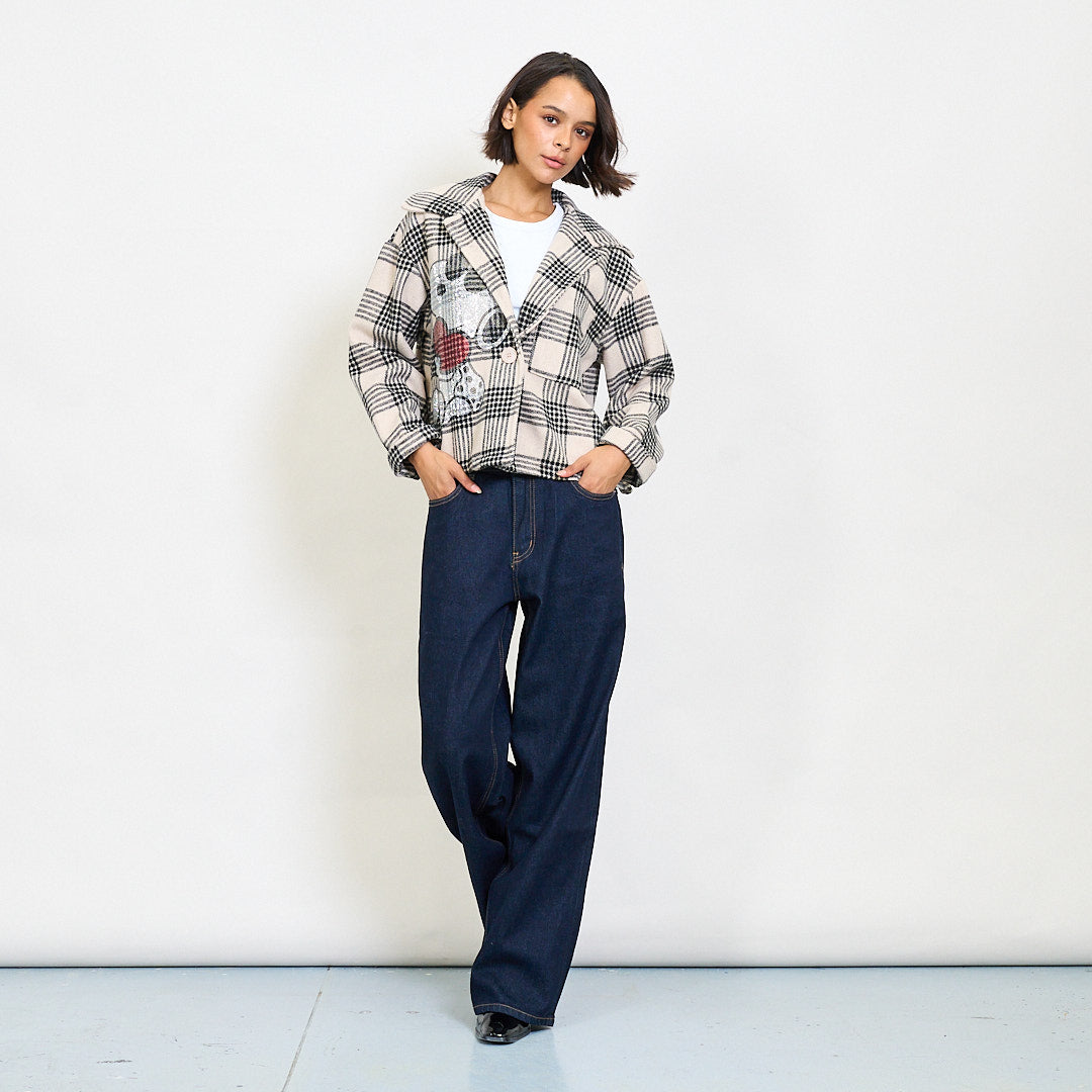 - Cropped blazer with a bold plaid pattern and playful cartoon embroidery