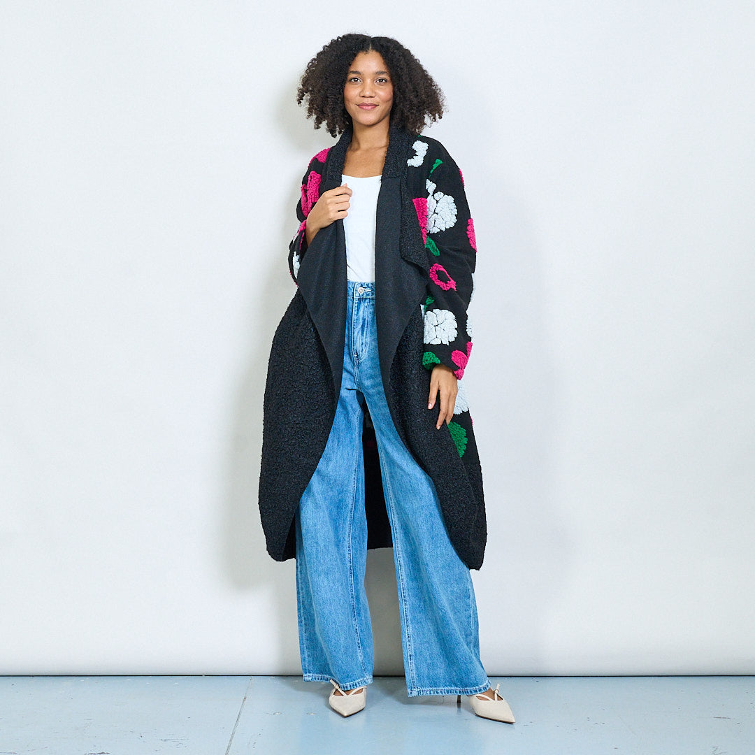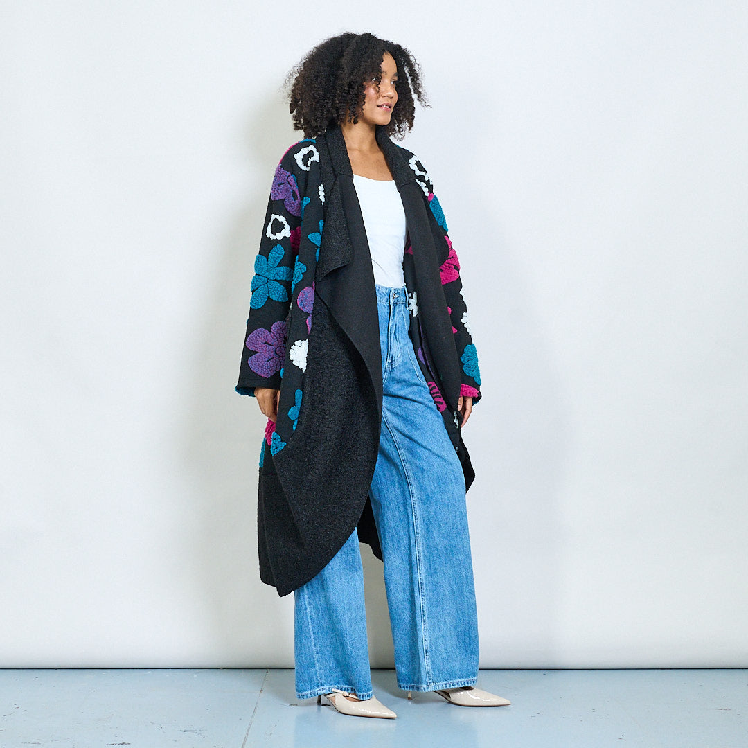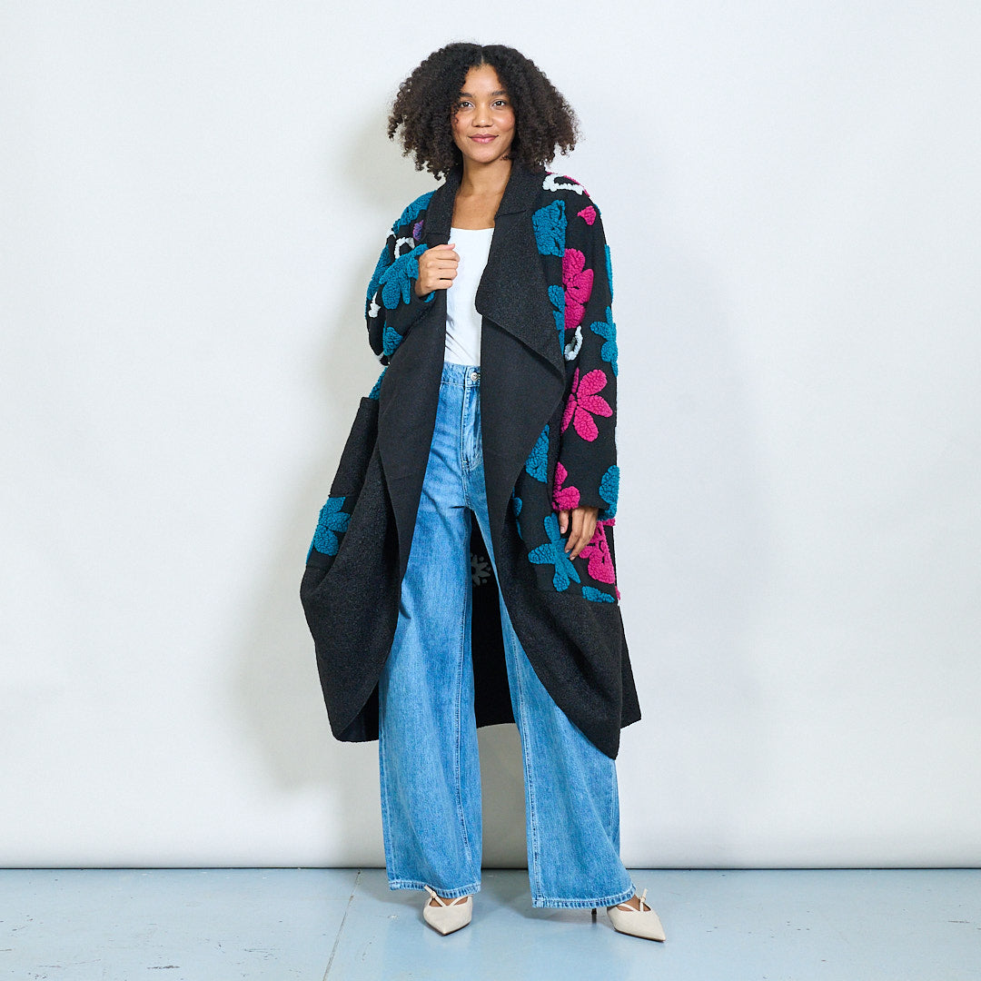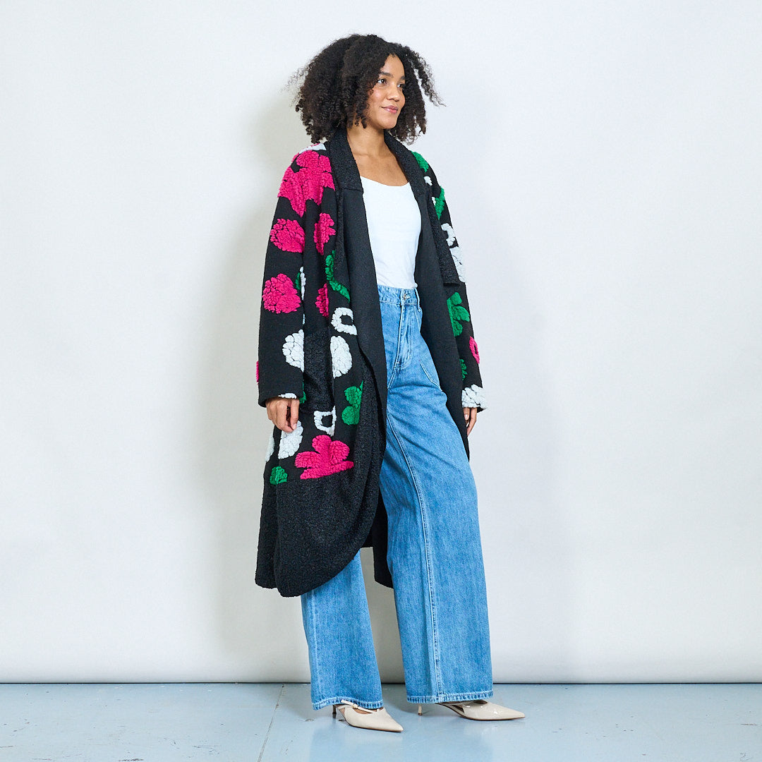 Oversized open-front cardigan with bold floral textured pattern wholesale