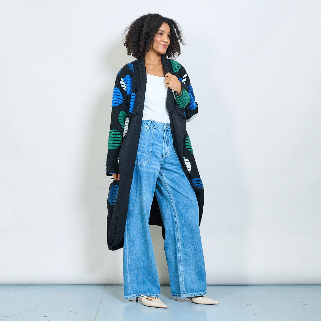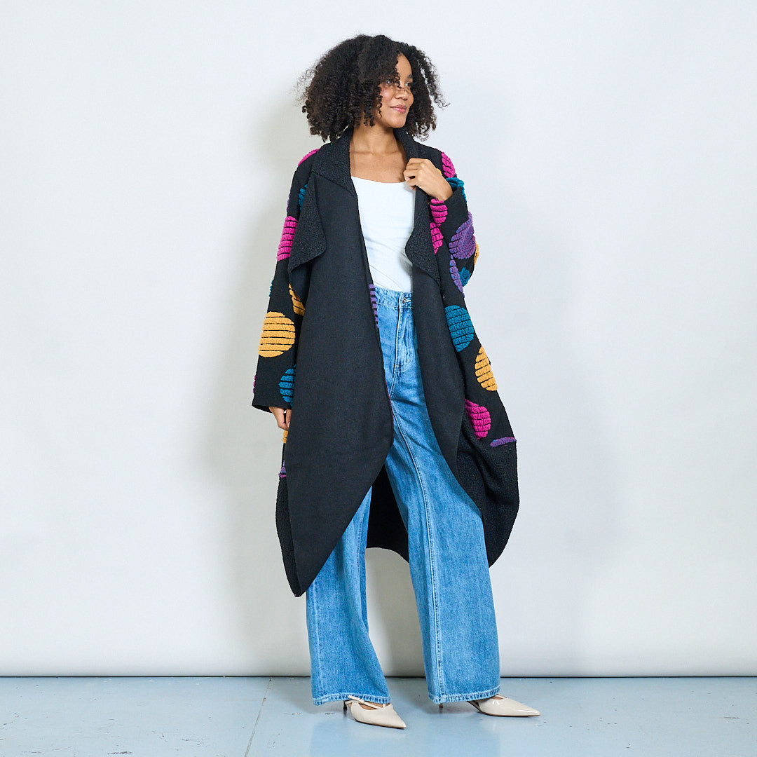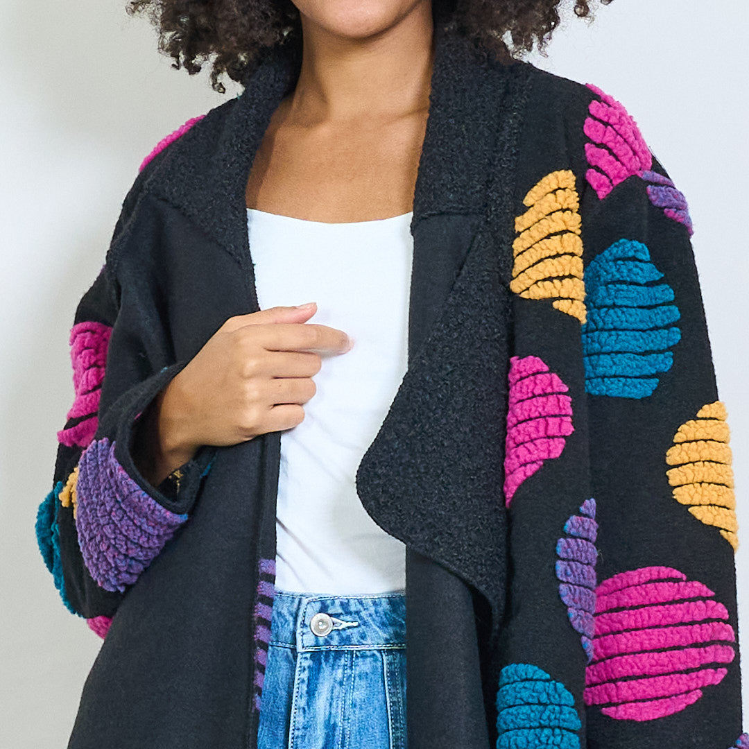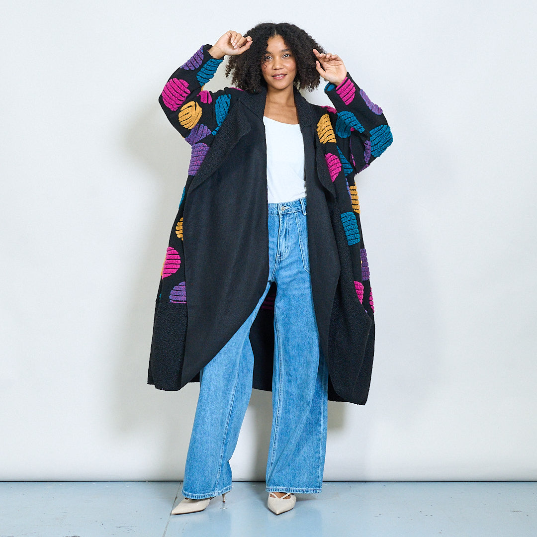 Oversized open-front cardigan with multicolor textured circle pattern wholesale